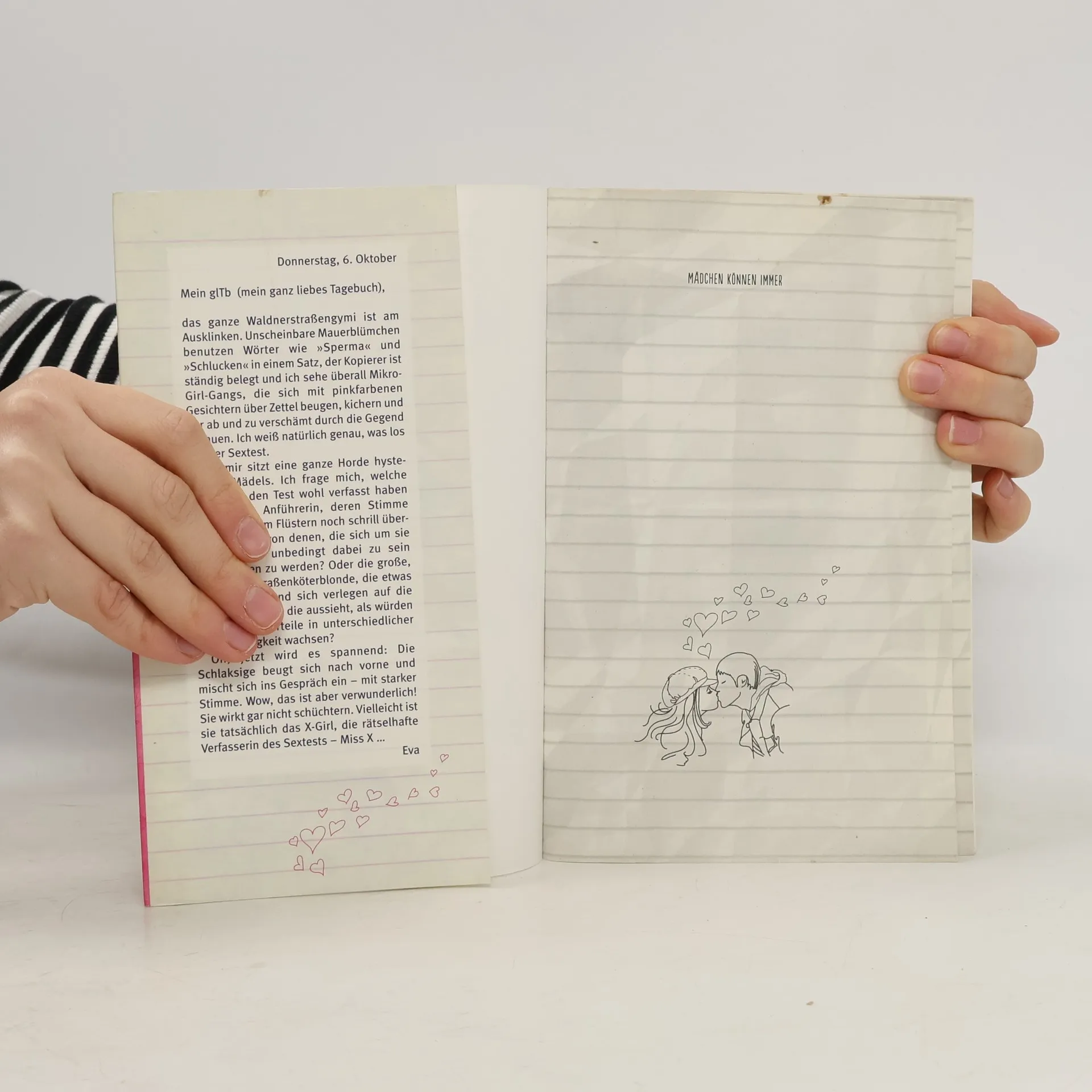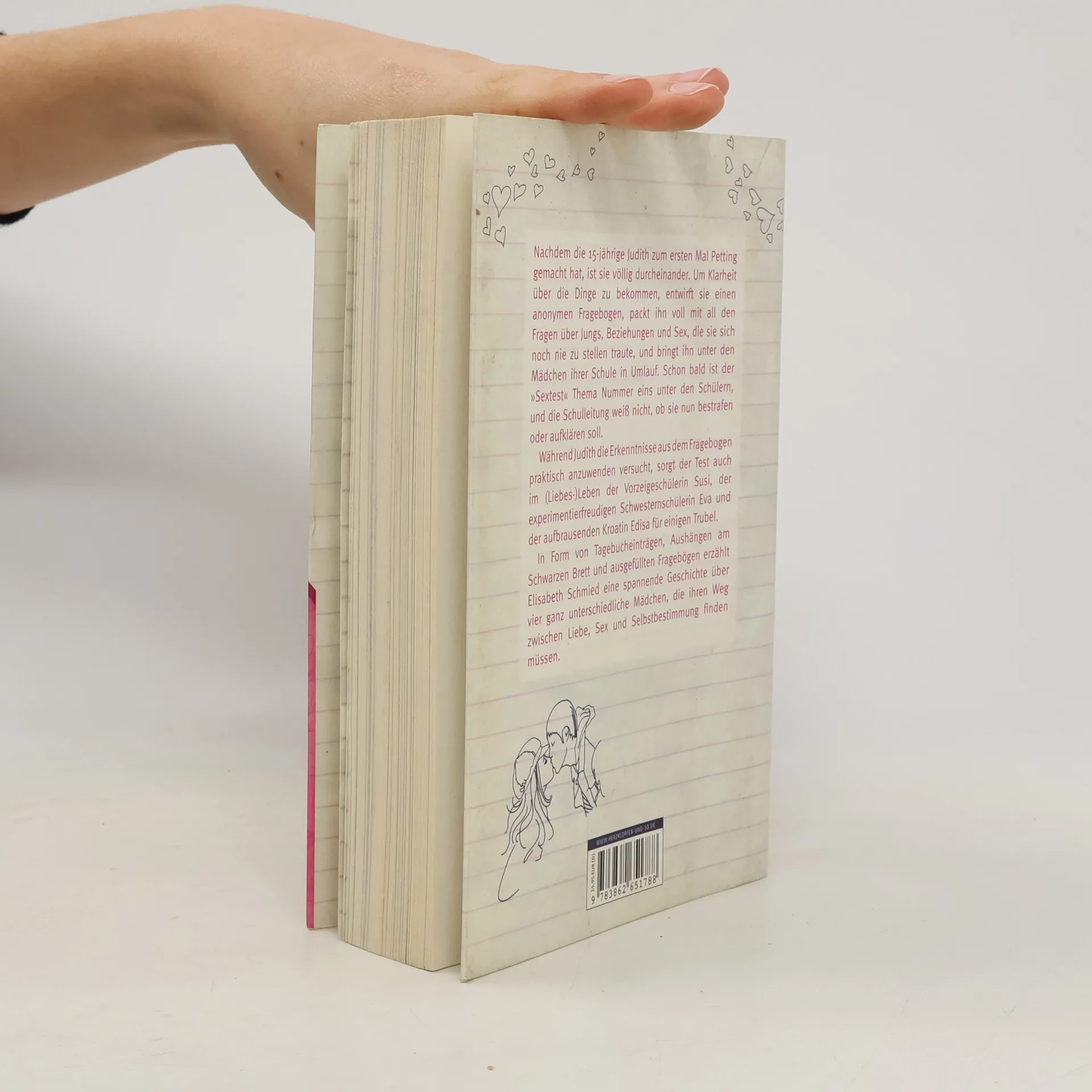 Nachdem die 15-jährige Judith zum ersten Mal Petting gemacht hat, ist sie völlig verwirrt. Generell hat sie ein Problem damit, auf ihren Bauch zu hören; sie verlässt sich viel lieber auf Daten und Fakten. Deshalb entwirft Judith einen anonymen Fragebogen, packt ihn voll mit all den Fragen über Jungs, Beziehungen und Sex, die sie sich noch nie zu stellen traute, und bringt ihn unter den Mädchen ihrer Schule in Umlauf. Schon bald ist der »Sextest« Thema Nummer eins unter den Schülern, und die Schulleitung weiß nicht, ob sie nun bestrafen oder aufklären soll. Während Judith die Erkenntnisse aus dem Fragebogen in ihrem Liebesleben nicht gerade erfolgreich anwendet, bringt der Test die Vorzeigeschülerin Susi dazu, endlich mal etwas zu wagen. Eva, die experimentierfreudige Schwesternschülerin, hat nach dem Ausfüllen plötzlich Angst, eine Schlampe zu sein, und will es mal mit »Gefühlen« probieren. Und Edisa, die aufbrausende Kroatin, merkt, wie schwierig es ist, Romantik und Emanzipation unter einen Hut zu bringen. In Form von Tagebucheinträgen, Aushängen am Schwarzen Brett und ausgefüllten Fragebögen erzählt Elisabeth Schmied eine spannende Geschichte über vier Mädchen, die ihren Weg zwischen Liebe, Sex und Selbstbestimmung finden müssen.