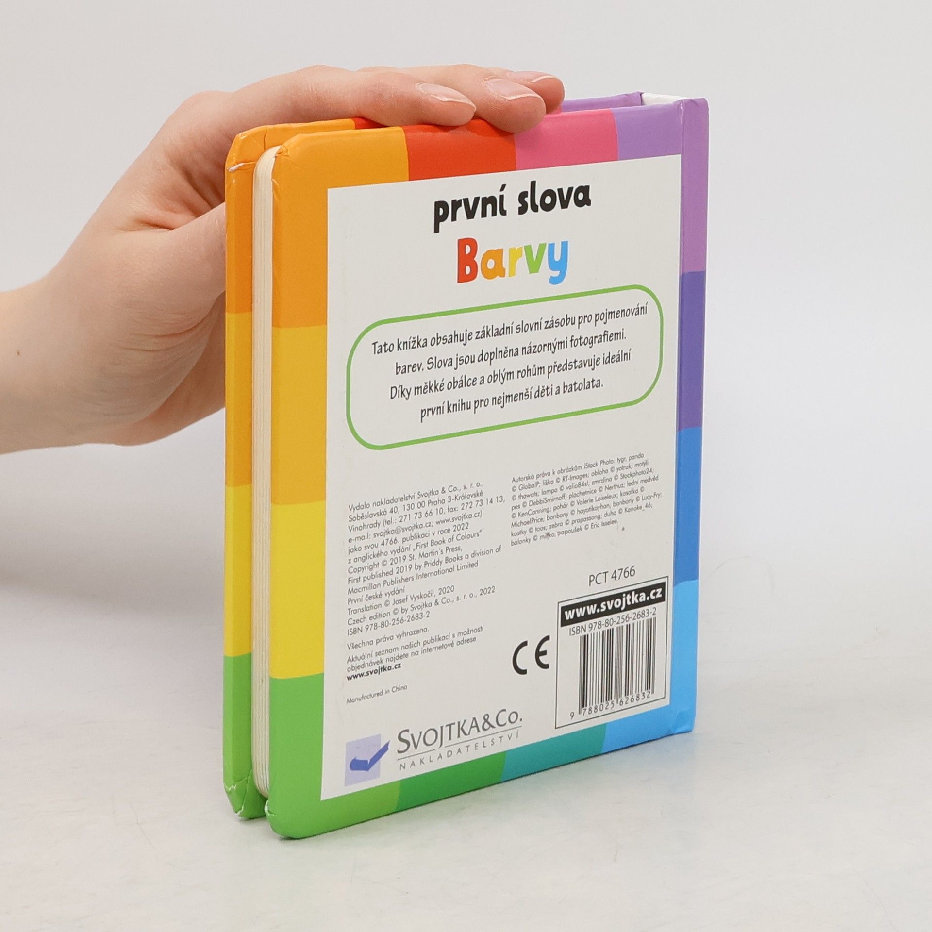 Tato knížka obsahuje základní slovní zásobu pro pojmenování barev. Slova jsou doplněna názornými fotografiemi. Díky měkké obálce a oblým rohům představuje ideální první knihu pro nejmenší děti a batolata.
