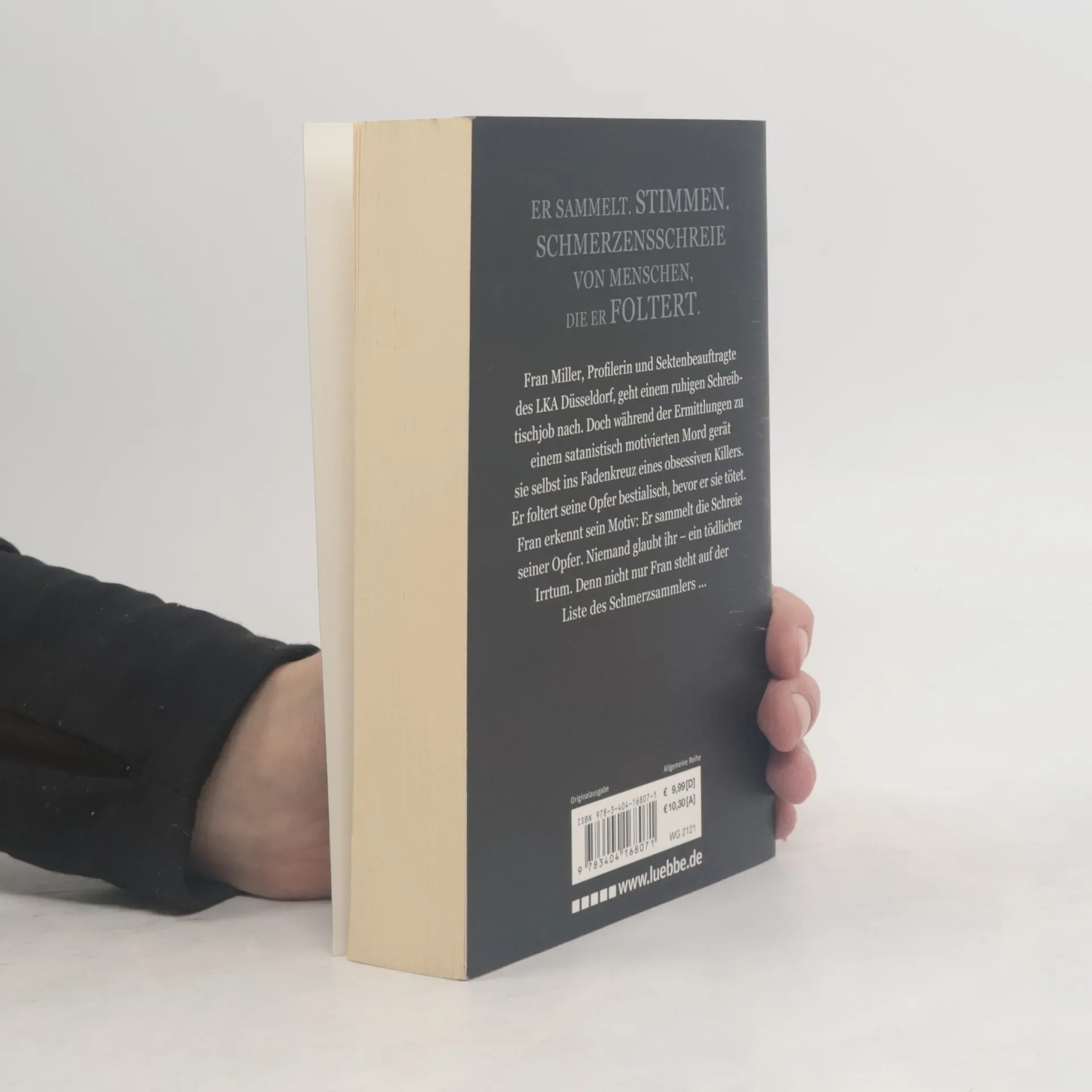 Fran Miller, Profilerin und Sektenbeauftragte des LKA Düsseldorf, geht einem ruhigen Schreibtischjob nach. Doch während der Ermittlungen zu einem satanistisch motivierten Mord gerät sie selbst ins Fadenkreuz eines obsessiven Killers. Er foltert seine Opfer bestialisch, bevor er sie tötet. Fran erkennt sein Motiv: Er sammelt die Schreie seiner Opfer. Niemand glaubt ihr ? ein tödlicher Irrtum. Denn nicht nur Fran steht auf der Liste des Schmerzsammlers ...