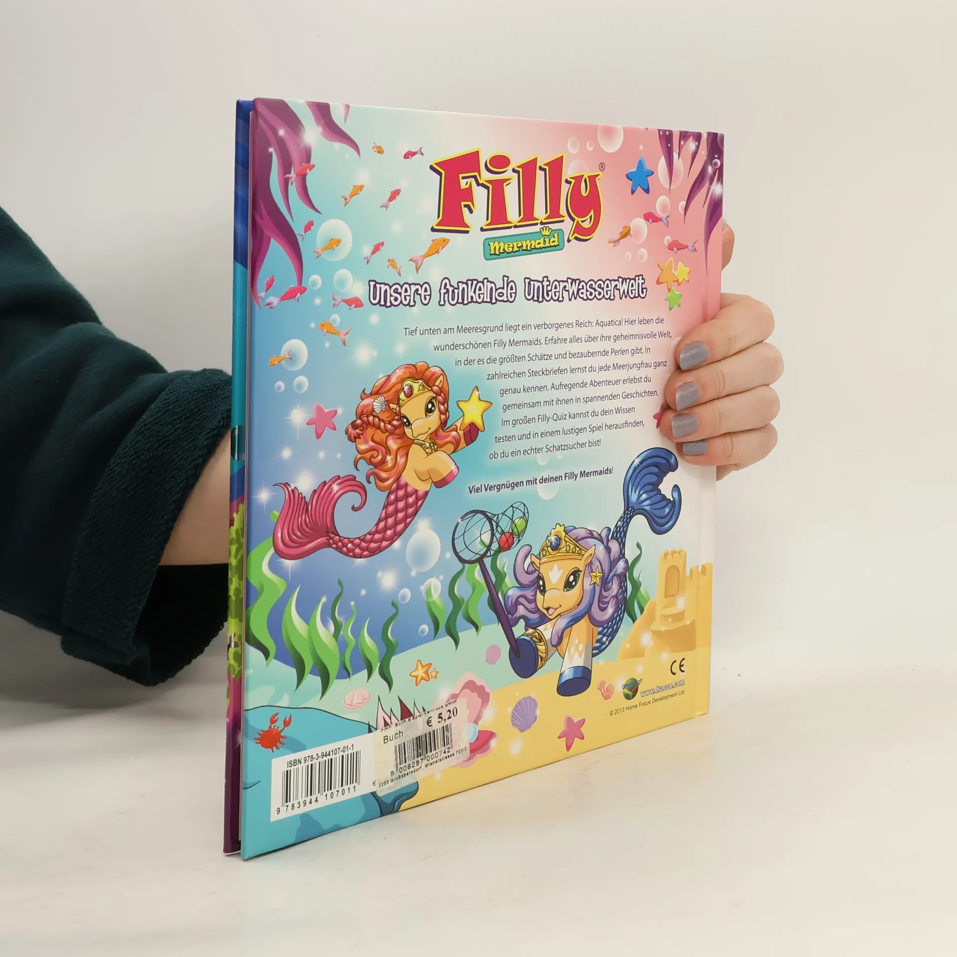 Tief unten am Meeresgrund liegt ein verborgenes Reich: Aquatica! Hier leben die wunderschönen Filly Mermaids. In diesem Buch erfährt man alles über ihre geheimnisvolle Welt, in der es die größten Schätze gibt. In den zahlreichen Steckbriefen stellen sich die Meerjungfrauen mit allen Details vor. Im großen Filly-Quiz kann getestet werden, ob man ein echter Filly Fan ist und gemeinsam mit seinen Freunden das lustige Schatzsucherspiel spielen. Hochwertige Ausstattung mit Glanzfolie auf dem Cover.