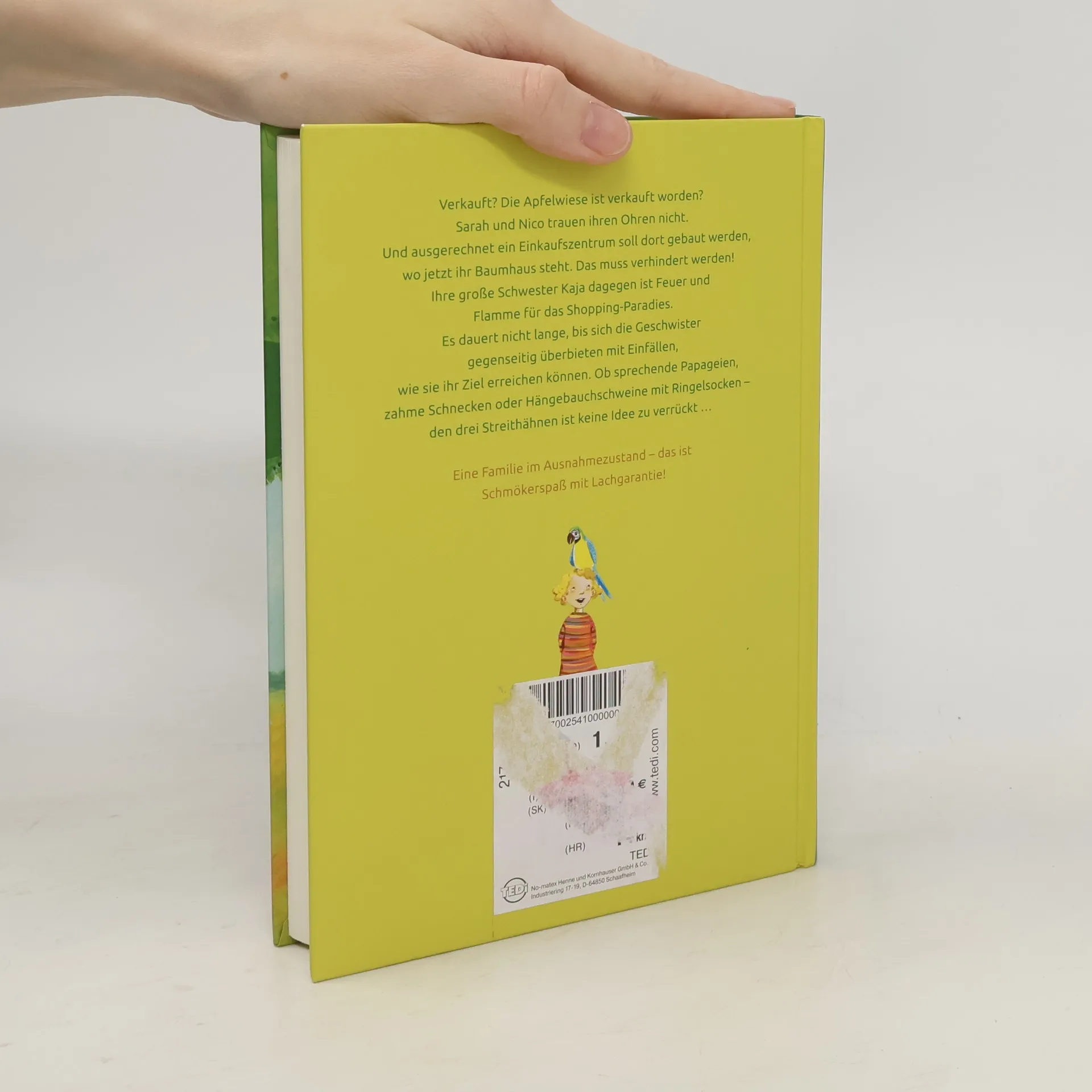 Verkauft? Die Apfelwiese ist verkauft worden? Sarah und Nico trauen ihren Ohren nicht. Und ausgerechnet ein Einkaufszentrum soll dort gebaut werden, wo jetzt ihr Baumhaus steht. Das muss verhindert werden! Ihre große Schwester Kaja dagegen ist Feuer und Flamme für das Shopping-Paradies. Es dauert nicht lange, bis sich die Geschwister gegenseitig überbieten mit Einfällen, wie sie ihr Ziel erreichen können. Ob sprechende Papageien, zahme Schnecken oder Hängebauchschweine mit Ringelsocken - den dreiStreithähnen ist keine Idee zu verrückt. Eine Familie im Ausnahmezustand - das ist Schmökerspaß mit Lachgarantie!
