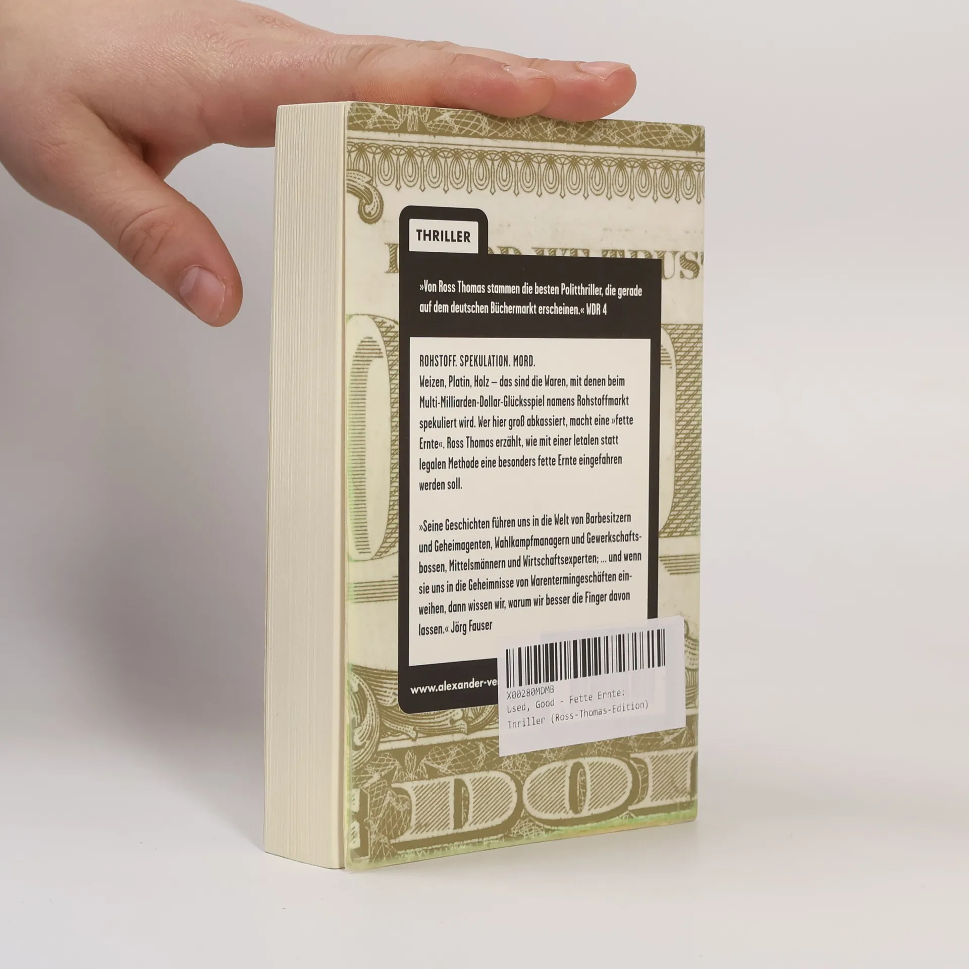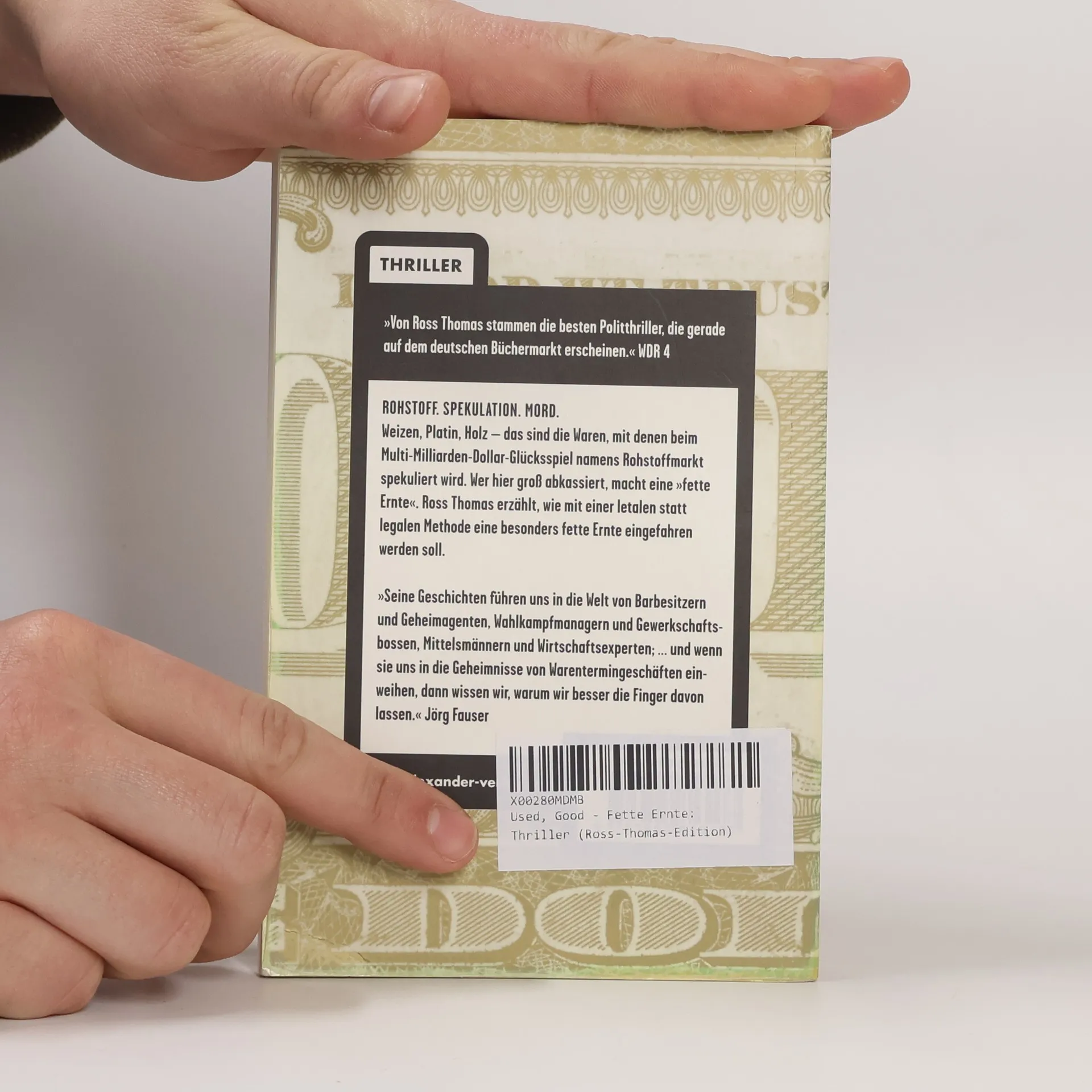ROHSTOFF. SPEKULATION. MORD. Weizen, Platin, Holz – das sind die Waren, mit denen bei dem Multi-Milliarden-Dollar-Glücksspiel namens Rohstoffmarkt spekuliert wird. Wer hier groß abkassiert, macht eine „fette Ernte“. Ross Thomas, meisterhafter Berichterstatter dunkler Machenschaften aus den Hinterzimmern der Mächtigen, erzählt, wie mit einer letalen statt legalen Methode eine besonders fette Ernte eingefahren werden soll.