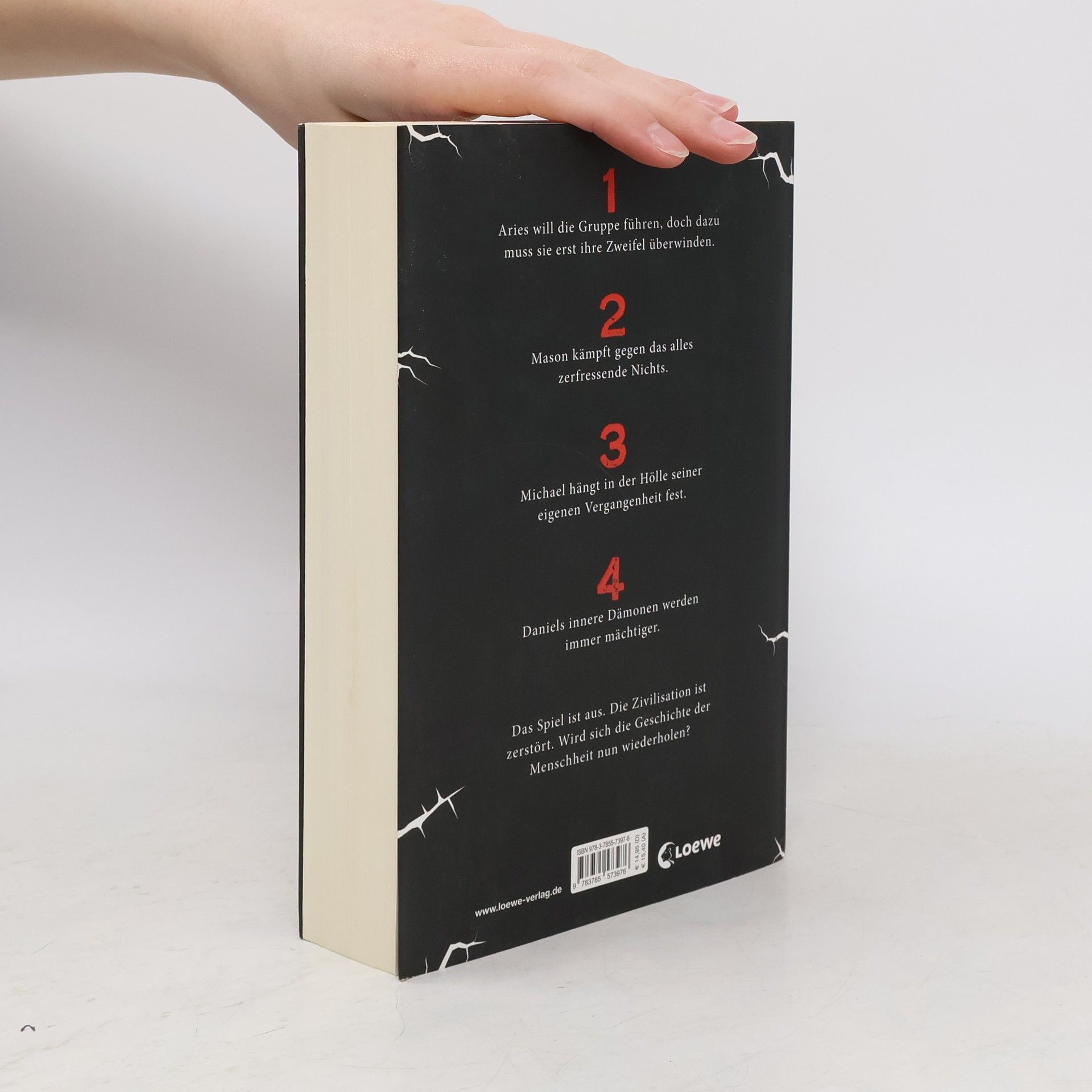 Aries will die Gruppe führen, doch dazu muss sie erst ihre Zweifel überwinden. Mason kämpft gegen das alles zerfressende Nichts. Michael hängt in der Hölle seiner eigenen Vergangenheit fest. Daniels innere Dämonen werden immer mächtiger. Das Spiel ist aus. Die Zivilisation ist zerstört. Wird sich die Geschichte der Menschheit nun wiederholen? Drei Monate nach dem Erdbeben: Aries hat ihre Freunde sicher nach Vancouver geführt. Nur der rätselhafte Daniel, zu dem sie sich am meisten hingezogen fühlt, verschwindet immer wieder. Währenddessen errichten die Hetzer unter den wenigen Überlebenden der Katastrophe ein blutiges Regime aus Unterdrückung und Angst. Dann tappen Michael und Clementine in eine tödliche Falle, und Mason und Daniel werden von den Hetzern gefangen genommen. Die Gruppe bricht auseinander. Wen kann Aries retten, bevor sie sich rettungslos in ihren eigenen Gefühlen verliert?