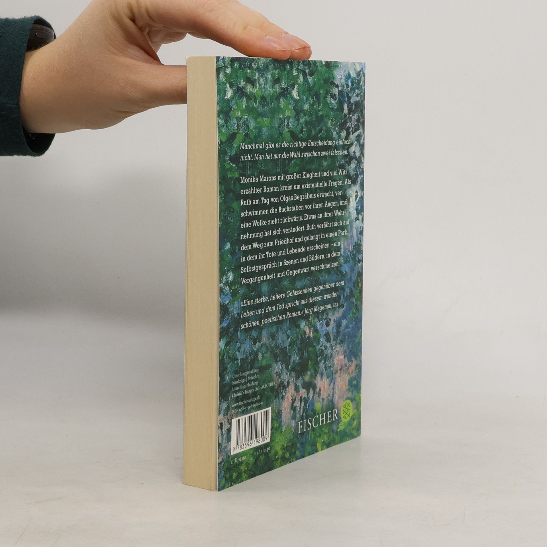Manchmal gibt es die richtige Entscheidung einfach nicht. Man hat nur die Wahl zwischen zwei falschen. Monika Marons mit großer Klugheit und viel Witz erzählter Roman kreist um existentielle Fragen. Als Ruth am Tag von Olgas Begräbnis erwacht, verschwimmen die Buchstaben vor ihren Augen, und eine Wolke zieht rückwärts. Etwas an ihrer Wahrnehmung hat sich verändert. Ruth verfährt sich auf dem Weg zum Friedhof und gelangt in einen Park, in dem ihr Tote und Lebende erscheinen – ein Selbstgespräch in Szenen und Bildern, in dem Vergangenheit und Gegenwart verschmelzen. Mit großer Leichtigkeit fragt dieser so tiefgründige wie humorvolle und phantastische Roman nach den Konsequenzen von Entscheidungen. Gibt es ein Leben ohne Schuld? Wäre ein anderer Weg möglich gewesen? »Ein literarisches Kunststück auf höchstem Niveau.« Helge Malchow, Süddeutsche Zeitung