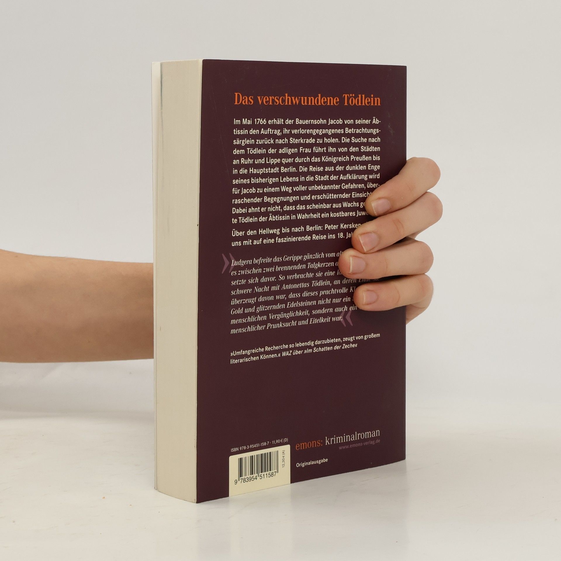 Im Mai 1766 erhält der Bauernsohn Jakob von seiner Äbtissin den Auftrag, ihr verlorengegangenes Betrachtungssärglein zurück nach Sterkrade zu holen. Seine Jagd nach dem Tödlein der adligen Frau führt ihn durch die Städte an Ruhr und Lippe quer durch das Königreich Preussen bis in die Hauptstadt Berlin. Die Reise aus der dunklen Enge seines bisherigen Lebens in die Stadt der Aufklärung wird für Jakob zu einem Weg voll unbekannter Gefahren, überraschender Begegnungen und erschütternder Einsichten. Dabei ahnt er nicht, dass das scheinbar aus Wachs geformte Tödlein der Äbtissin in Wahrheit ein kostbares Juwel ist. Peter Kersken, geboren 1952 in Oberhausen im Ruhrgebiet, studierte Philosophie und Literaturwissenschaft in Freiburg und Köln und arbeitete als Redakteur bei einer Kölner Tageszeitung. Er lebt als freiberuflicher Autor und Journalist in der Eifel www.peterkersken.de.