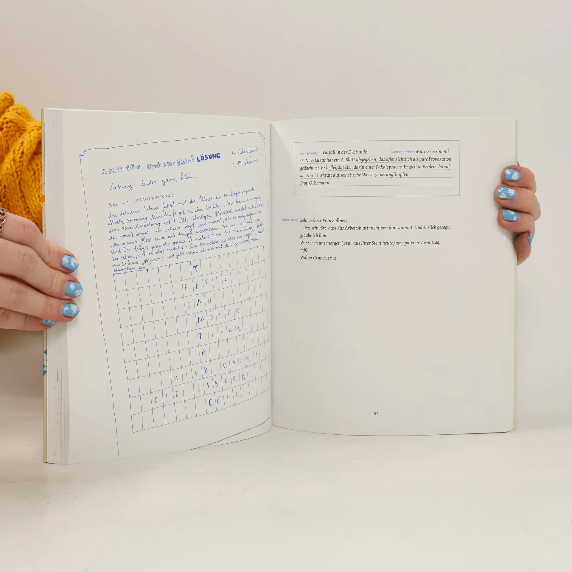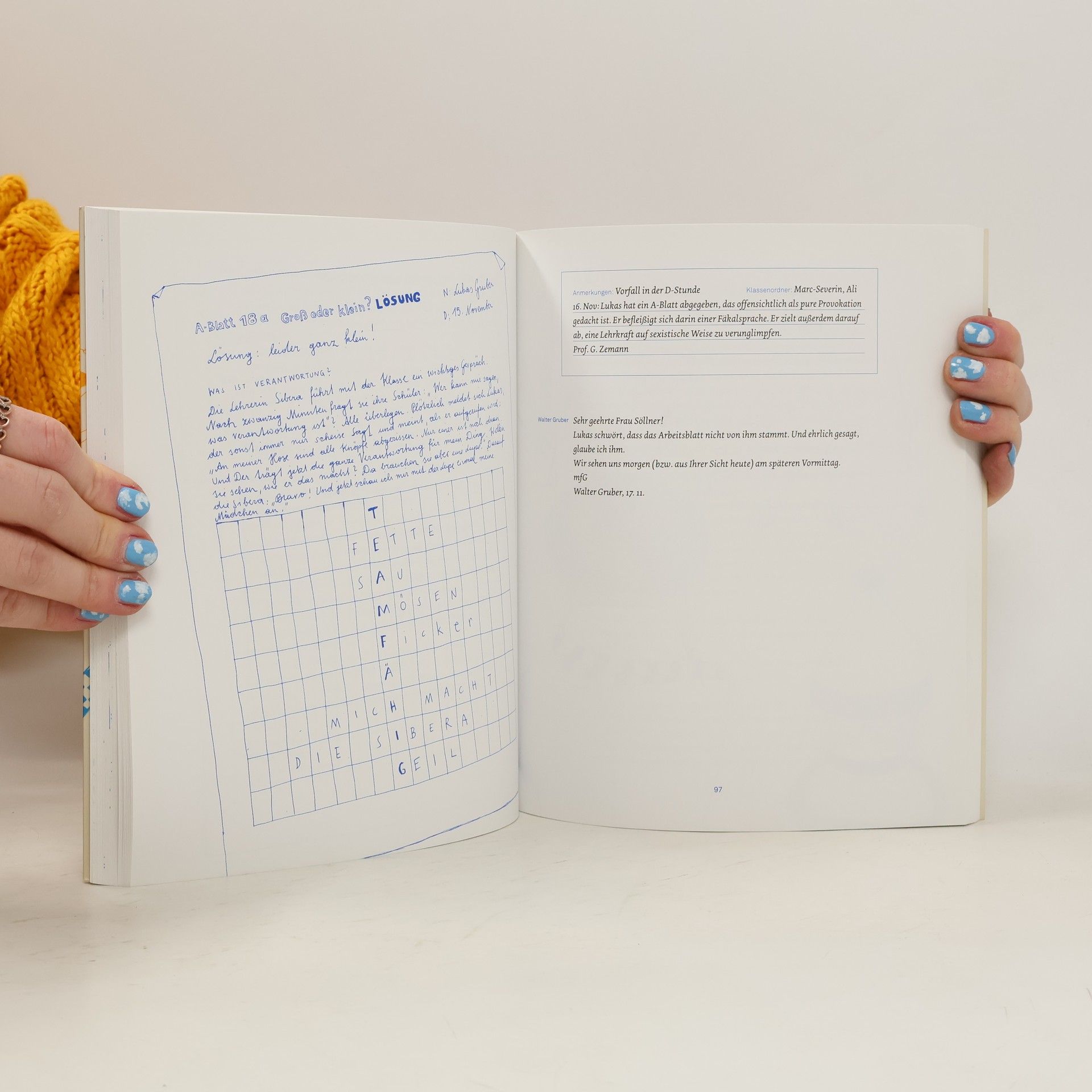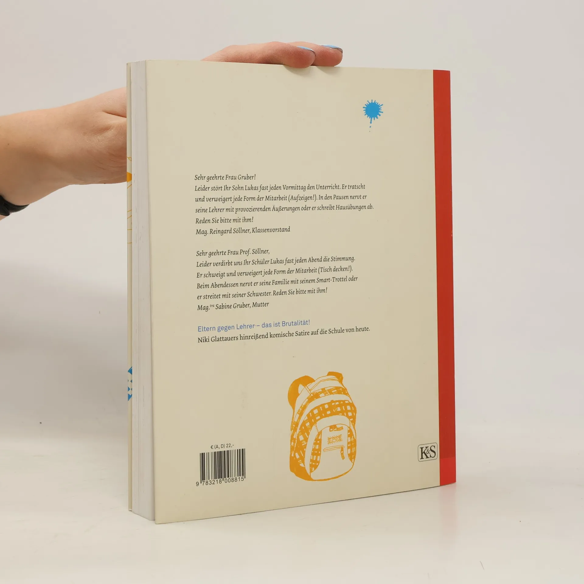 Sehr geehrte Frau Gruber! Leider stört Ihr Sohn Lukas fast jeden Vormittag den Unterricht. Er tratscht und verweigert jede Form der Mitarbeit (Aufzeigen!). In den Pausen nervt er seine Lehrer mit provozierenden Äußerungen oder er schreibt Hausübungen ab. Reden Sie bitte mit ihm! Mag. Reingard Söllner, Klassenvorstand. Sehr geehrte Frau Söllner, leider verdirbt uns Ihr Schüler Lukas fast jeden Abend die Stimmung. Er schweigt und verweigert jede Form der Hausarbeit (Tisch decken!). Beim Abendessen nervt er seine Familie mit seinem iTrottel oder er streitet mit seiner Schwester. Reden Sie bitte mit ihm! Mag. tra Sabine Gruber, Mutter. Lukas ist 13. Renitent, pubertär, hat schlechte Noten – also alles ganz normal. Eltern und Lehrerinnen tragen per Mitteilungsheft heftige Schlachten aus, Vater Walter Gruber schreibt sich den Frust in einem Schultagebuch von der Seele. Das Ergebnis: eine hinreißend komische Satire auf die Schule von heute.