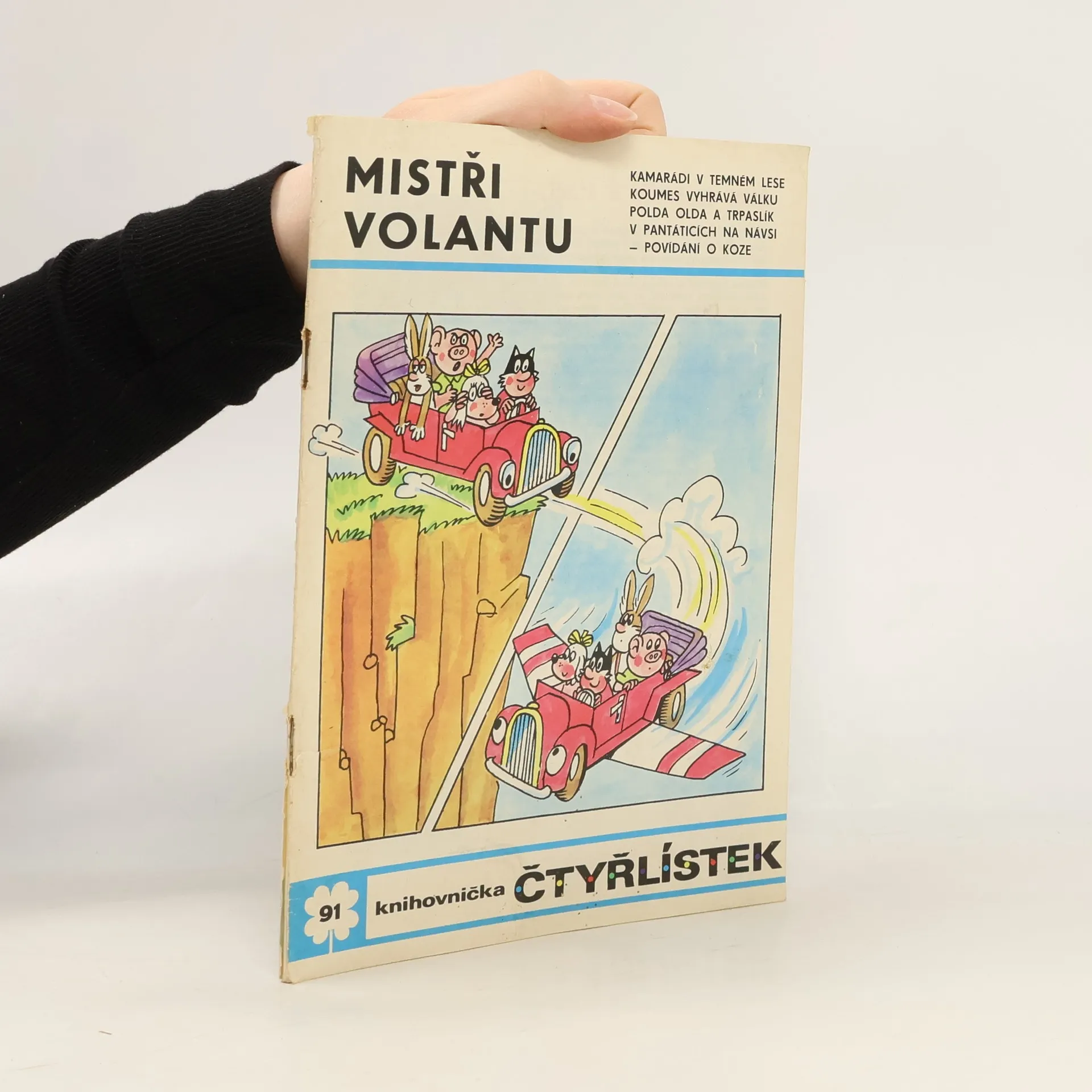 91. díl série. Příběh Čtyřlístku Mistři volantu (Ljuba Štíplová, Jaroslav Němeček), Kamarádi v temném lese - (Stanislav Havelka, Alena Janoušková), Koumes vyhrává válku ( Vladimír Kliman, Sylvie Vodáková), Polda a Olda a trpaslík (Petr Chvojka, Jaroslav Malák) a veršovaná V Pantáticích na návsi - Povídání o koze - (Pavel Šrut, Jiří Kalousek).