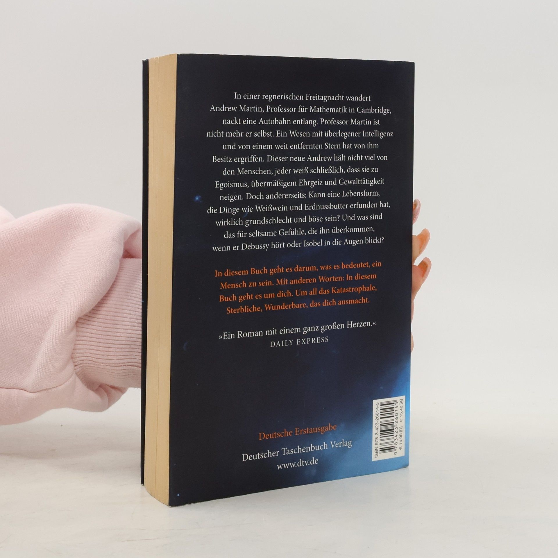 Ein Roman 'mit einem ganz großen Herzen' Daily Express In einer regnerischen Freitagnacht wird Andrew Martin, Professor für Mathematik in Cambridge, aufgegriffen, als er nackt eine Autobahn entlangwandert. Professor Martin ist nicht mehr er selbst. Ein Wesen mit überlegener Intelligenz und von einem weit entfernten Stern hat von ihm Besitz ergriffen. Dieser neue Andrew ist nicht begeistert von seiner neuen Existenz. Er hat eine denkbar negative Meinung von den Menschen. Jeder weiß schließlich, dass sie zu Egoismus, übermäßigem Ehrgeiz und Gewalttätigkeit neigen. Doch andererseits: Kann eine Lebensform, die Dinge wie Weißwein und Erdnussbutter erfunden hat, wirklich grundschlecht und böse sein? Und was sind das für seltsame Gefühle, die ihn überkommen, wenn er Debussy hört oder Isobel, der Frau des Professors, in die Augen blickt?