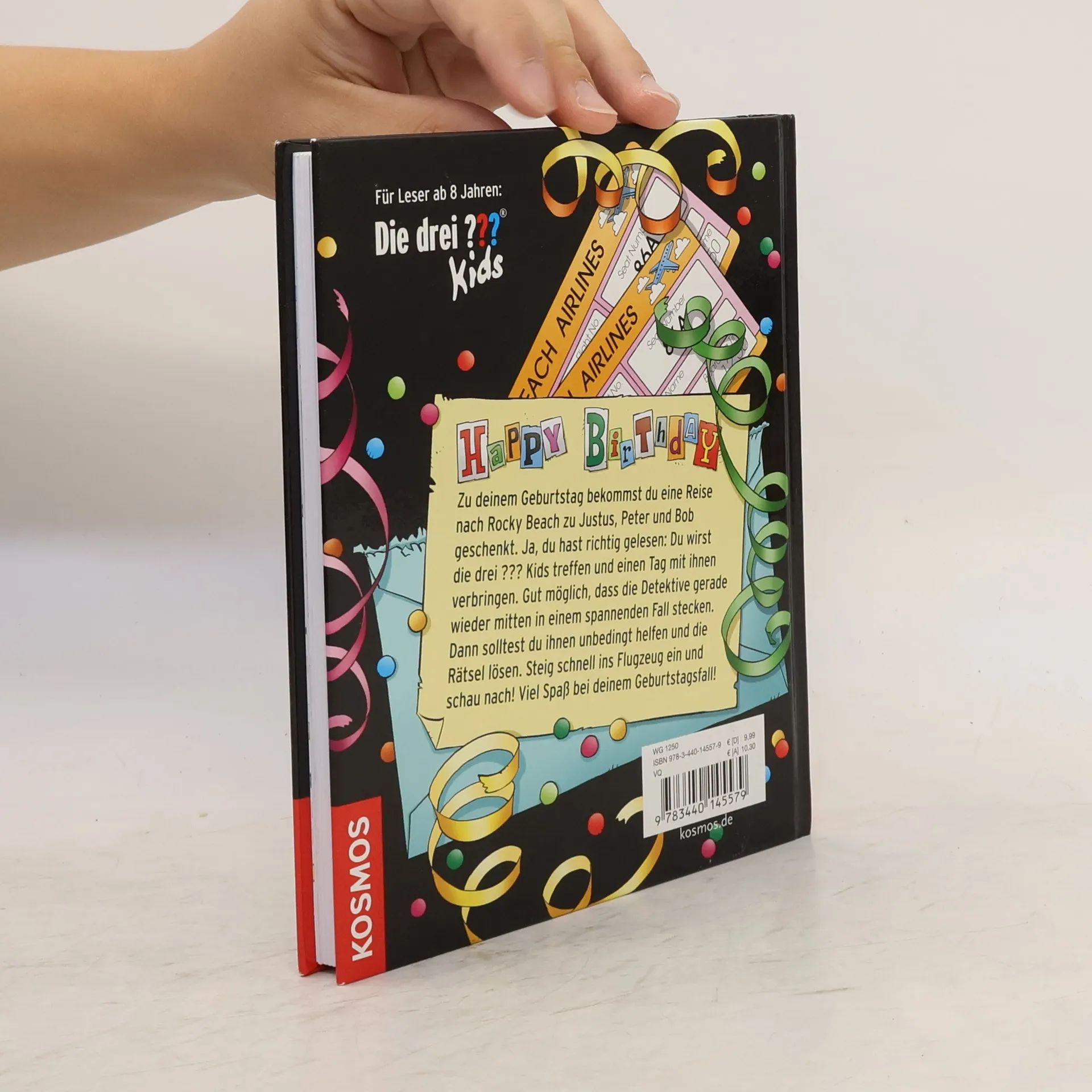 Mehr kann man sich nicht wünschen: Wer als Geburtstagskind dieses Buch aufschlägt, bekommt eine Reise nach Rocky Beach geschenkt und feiert zusammen mit den Die drei ??? Kids! Natürlich wartet am Flughafen nicht nur das Begrüßungskomitee aus Justus, Peter und Bob, sondern auch ein kniffliger Fall. Die Kultdetektive setzen auf ihren Ehrengast als Vierten im Team, um das Geheimnis zu lüften. Bald sorgen verzwickte Rätsel, Bilder und Aufgaben für Nervenkitzel. Der Leser erlebt sich unmittelbar als Teil der Geschichte, was den Fall noch spannender macht.