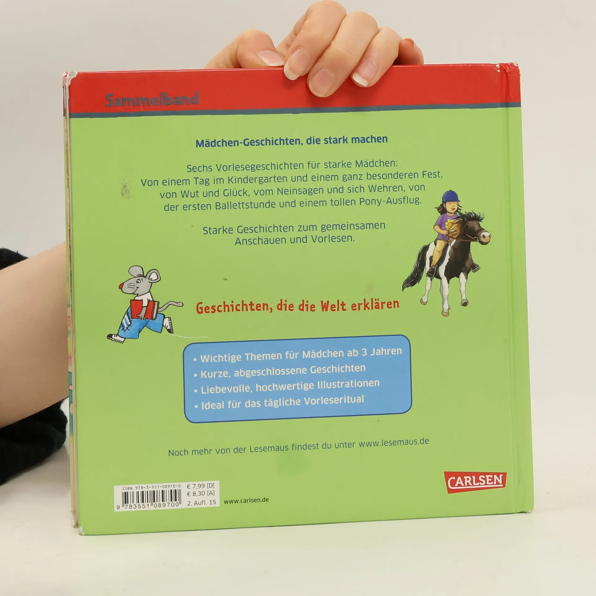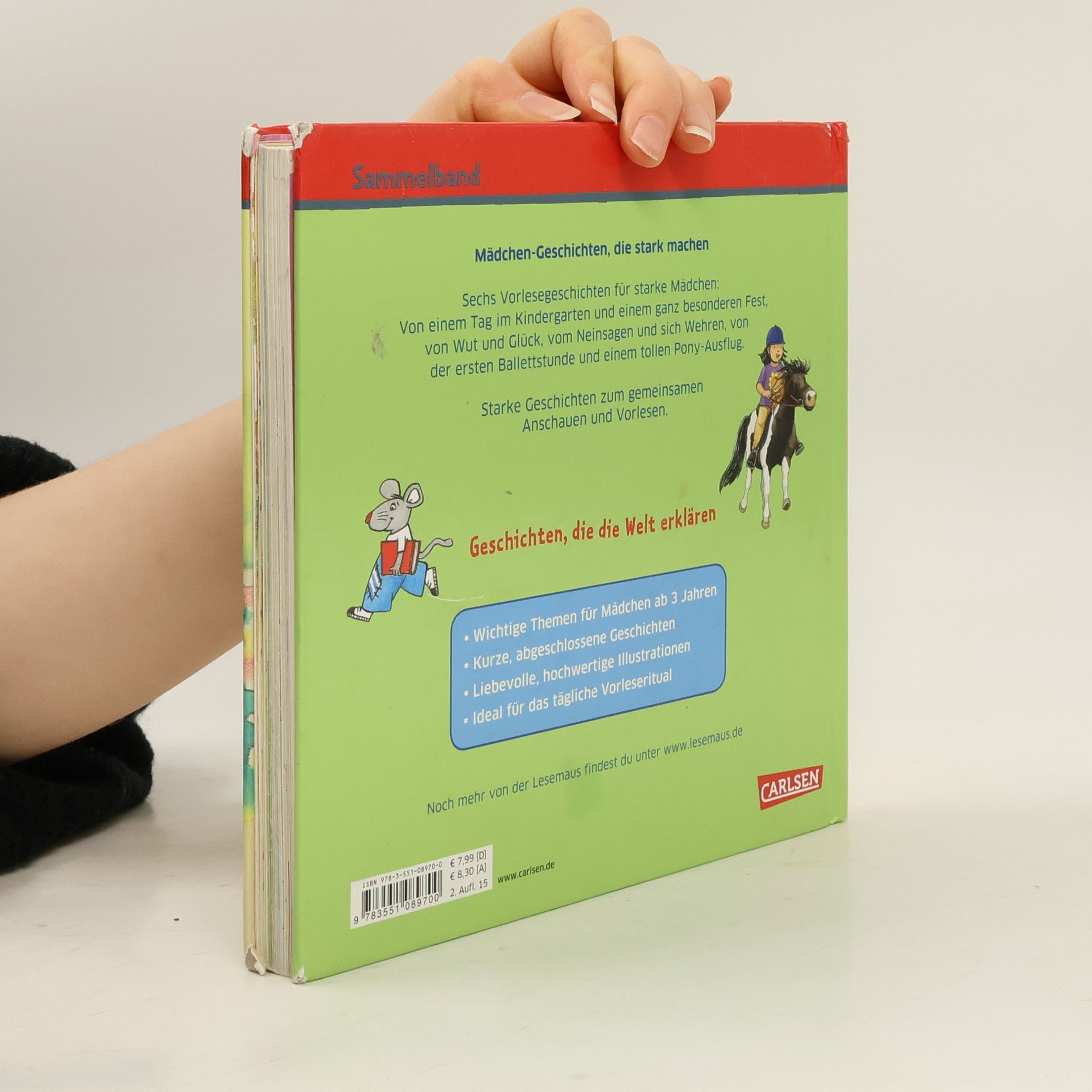 Sechs Vorlesegeschichten für starke Mädchen in einem Band: Von einem Tag im Kindergarten und einem ganz besonderen Fest, von Wut und Glück, vom Nein sagen und sich wehren, von der ersten Ballettstunde und einem tollen Pony-Ausflug. • Wichtige Themen für Mädchen ab 3 Jahren • Kurze, abgeschlossene Geschichten • Liebevolle, hochwertige Illustrationen • Ideal für das tägliche Vorleseritual Das große Mädchen-Buch mit den besten Geschichten zum gemeinsamen Anschauen und Vorlesen. Dieser LESEMAUS-Sammelband enthält die Geschichten „Ella geht in den Kindergarten“, „Unterwegs mit den Ponys“, „Jule darf auch mal wütend sein“, „Conni geht nicht mit Fremden mit“, „Lili und das chinesische Frühlingsfest“ und „Anna tanzt Ballett“.