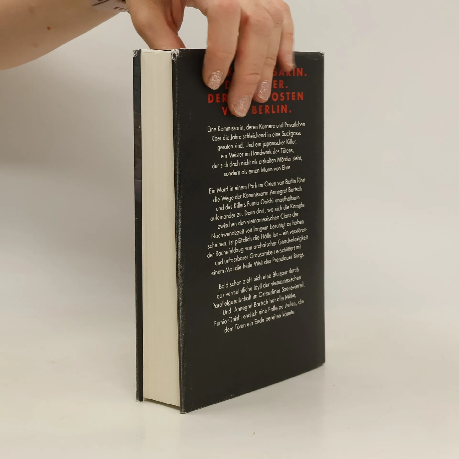 Die Kommissarin Annegret Bartsch arbeitet seit fünfzehn Jahren im Vietnamdezernat der Berliner Polizei, hat jedoch seit einem Jahrzehnt keinen Fall mehr vor Gericht gebracht. Ihre Frustration im Job spiegelt sich in den Spannungen zu Hause wider: Ihr Mann ist ein nörgelnder Eigenbrötler, und die 8-jährige Tochter Lizzie geht ihr zunehmend auf die Nerven. Als der Japaner Yuki O. tot in einem Parkteich gefunden wird, wird Annegret mit einem Rätsel konfrontiert. Hinweise deuten darauf hin, dass Yuki O. zur Yakuza gehörte und Konflikte mit der vietnamesischen Mafia hatte. Ihre Ermittlungen führen sie durch ein Netz von vietnamesischen Gastronomiebetrieben und Geschäften, doch überall stößt sie auf Schweigen. Zeitgleich wird Fumio Onishi von der Yakuza nach Berlin geschickt, um Yuki O.s Tod aufzuklären und Rache zu nehmen. Onishi, ein Meister des Tötens, sieht sich nicht als eiskalten Killer, sondern als Erbe der Samurai-Traditionen. Bald hinterlässt er eine Blutspur in der vietnamesischen Parallelgesellschaft. Annegret versucht schließlich, ihm mit Hilfe eines vietnamesischen Kontakts eine Falle zu stellen. Der Roman ist ein spannender Großstadtthriller und ein eindringliches Psychogramm zweier gebrochener Menschen, gefangen in den Absurditäten ihres Lebens.