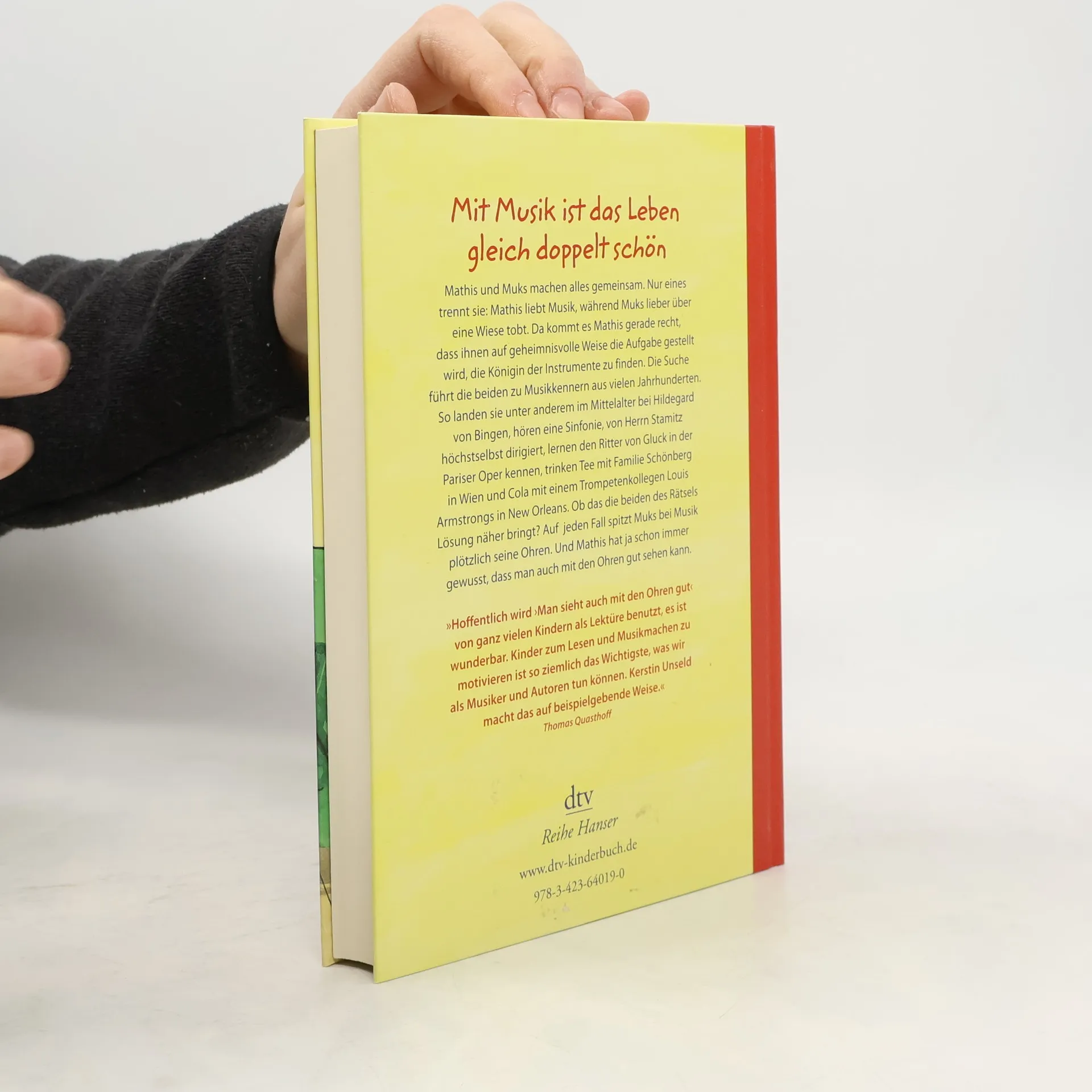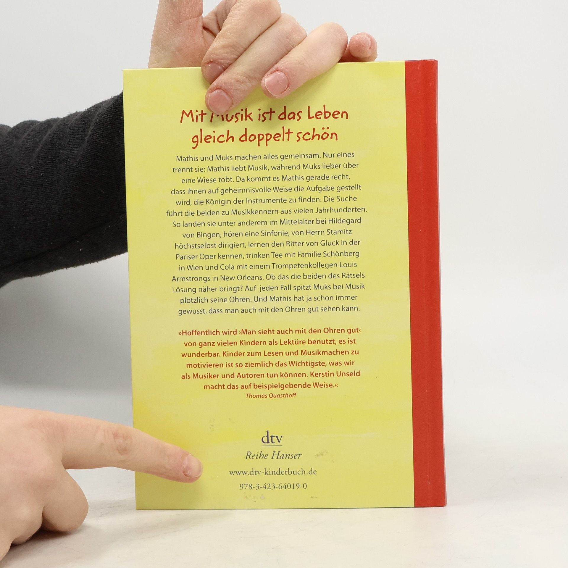 Mit Musik ist das Leben gleich doppelt schön Mathis und Muks sind Freunde, die alles gemeinsam machen. Nur eines trennt sie: Mathis liebt klassische Musik, während Muks lieber über eine Wiese tobt. Da kommt es Mathis gerade recht, dass ihnen auf geheimnisvolle Weise die Aufgabe gestellt wird, die Königin der Instrumente zu suchen. Wenig begeistert macht Muks mit, kann er doch seinen blinden Freund nicht allein durch die Zeit reisen lassen. Und so landen die beiden unter anderem im Mittelalter bei Hildegard von Bingen, lernen den Ritter von Gluck in der Pariser Oper kennen, trinken Tee mit den Schönbergs in Wien und fachsimpeln mit einem Musiker aus Louis Armstrongs Band in New Orleans. Ob das die beiden des Rätsels Lösung näher bringt? Auf jeden Fall hat Muks jetzt mehr Lust auf Musik. Und Mathis hat ja schon immer gewusst, dass man mit den Ohren auch gut sehen kann. Mit einem umfangreichen Anhang und vielen Hörtipps.