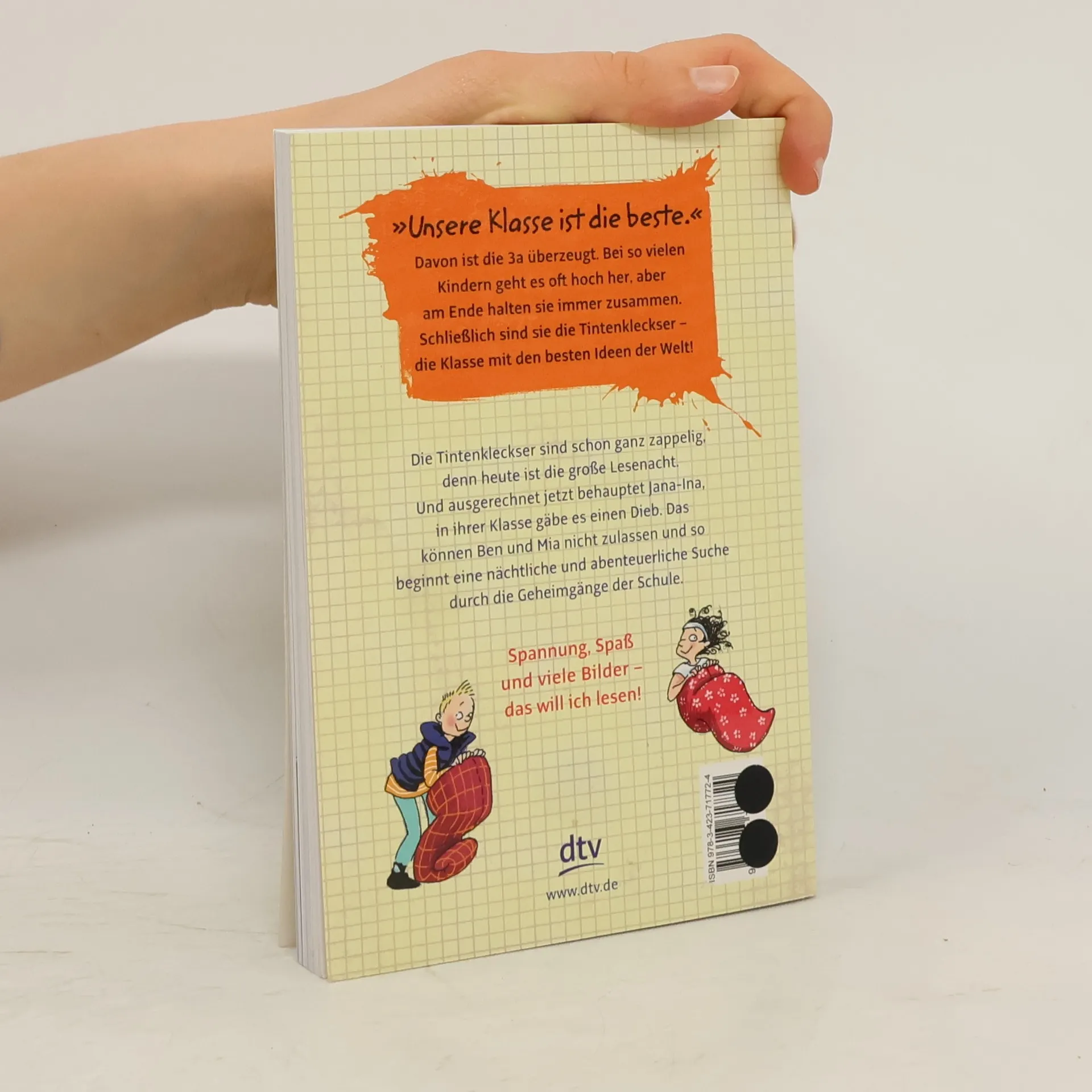 Band 1 der Tintenkleckser-Reihe Bei den Kindern aus der 3a geht es oft hoch her, aber am Ende halten sie immer zusammen. Schließlich sind sie die Tintenkleckser – die Klasse mit den besten Ideen der Welt. Bei der Lesenacht in der Schule liegen alle gemütlich in ihren Schlafsäcken, da behauptet Jana-Ina, ihr weißer Gummi-Tiger sei gestohlen worden. Ein Dieb in der Klasse – das können Ben und Mia nicht auf ihrer Klasse sitzen lassen. Und so beginnt eine nächtliche und abenteuerliche Suche durch die Geheimgänge der Schule.
