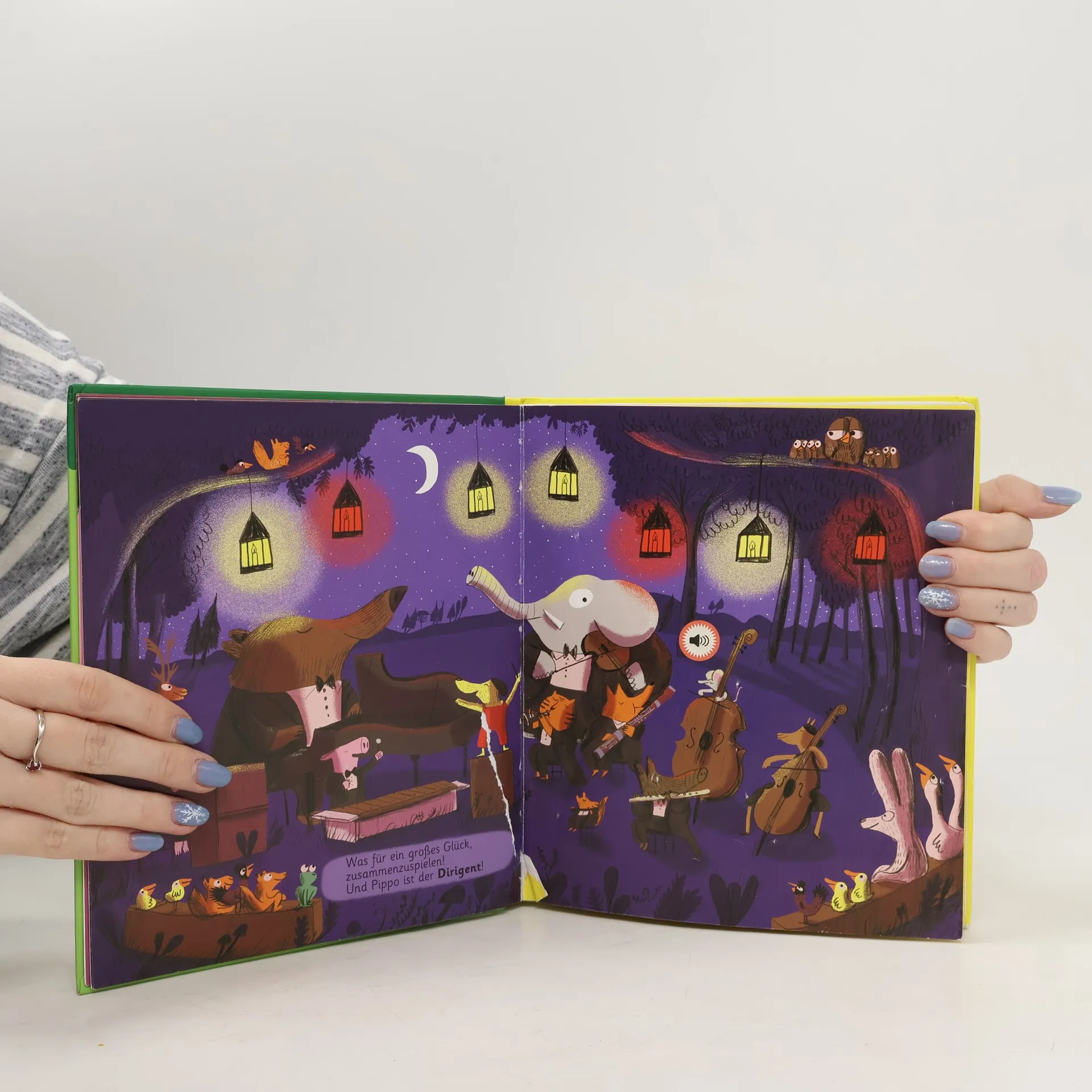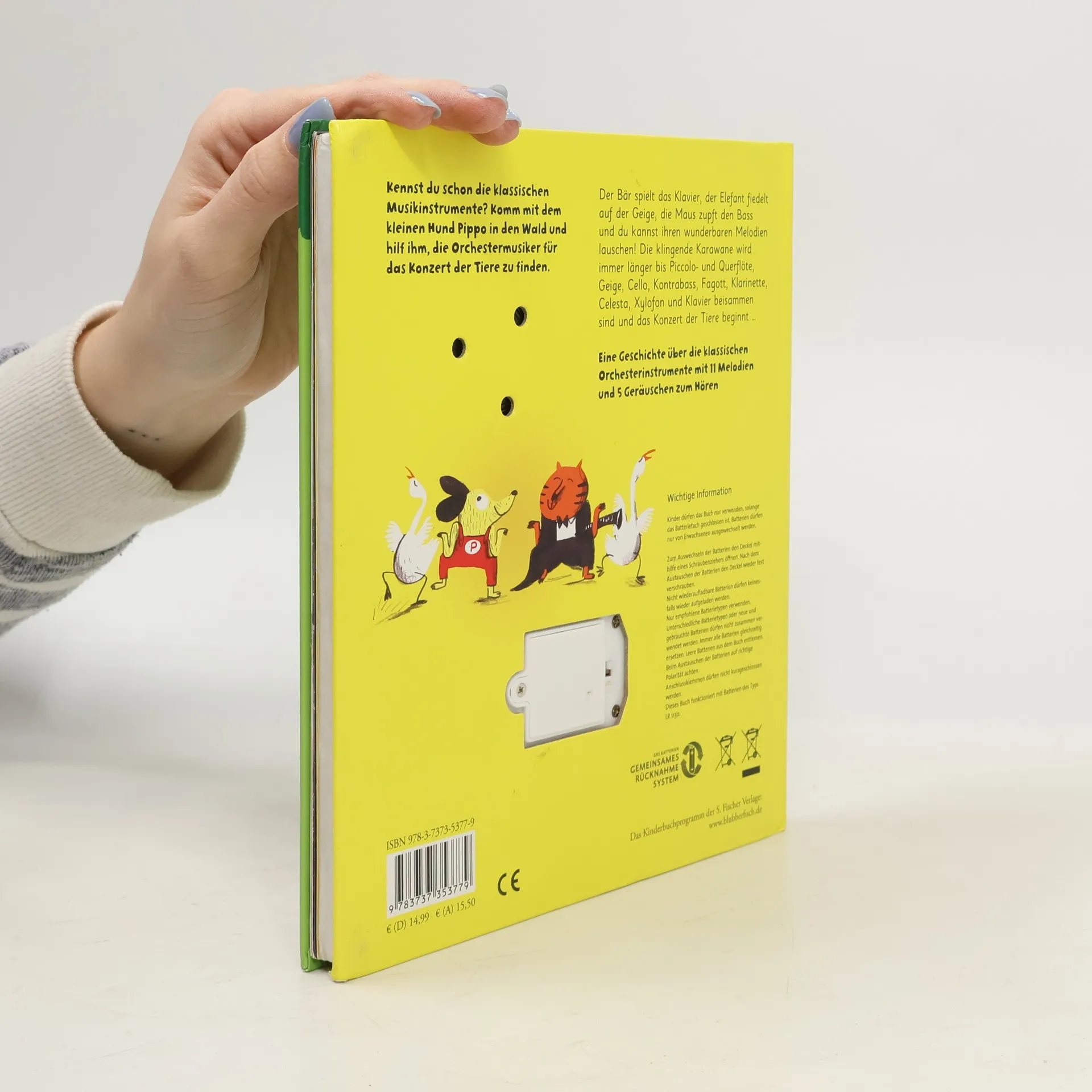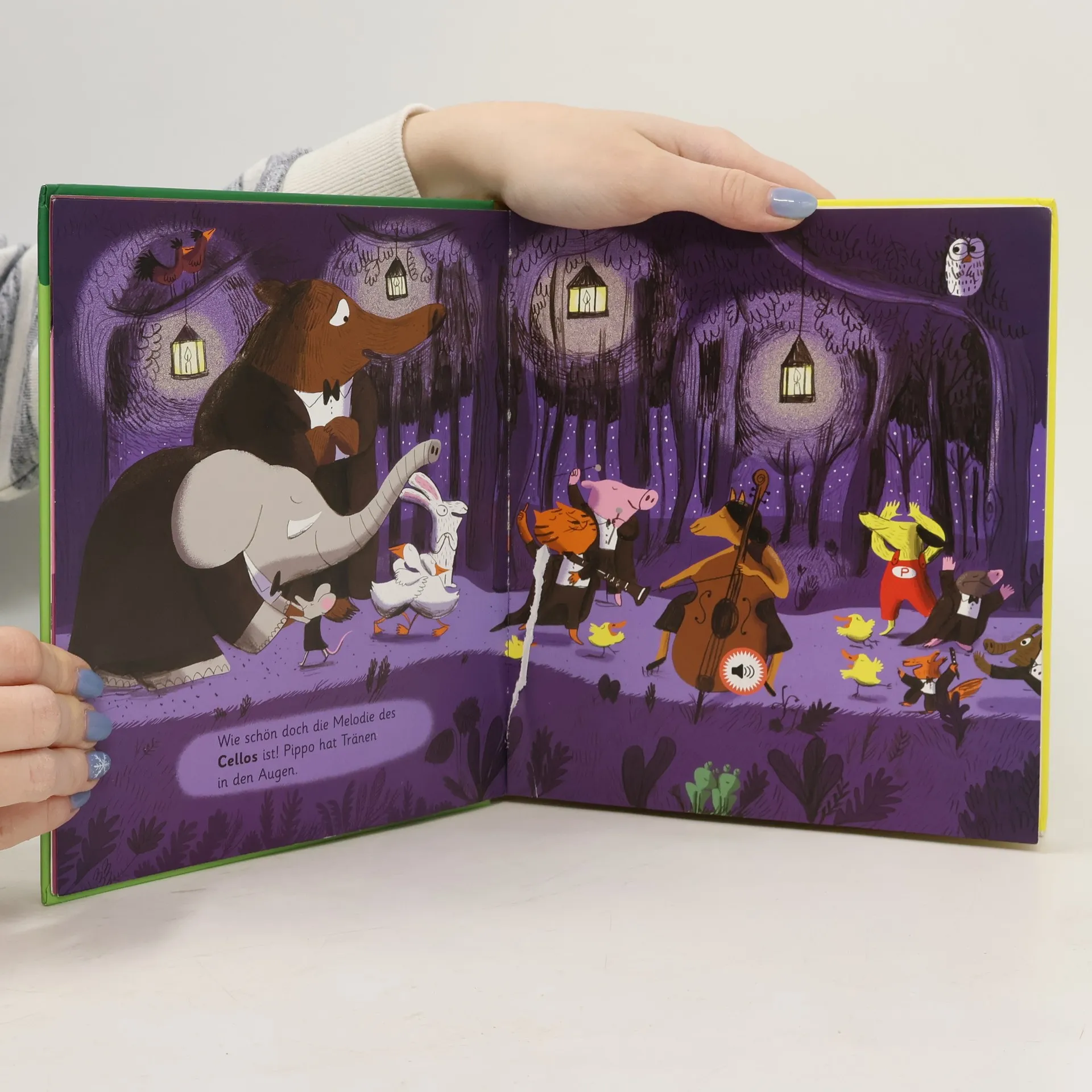 Eine klingende Bilderbuchgeschichte für Kinder ab 3 Jahren zum Kennenlernen der klassischen Orchesterinstrumente Wo sind die Musiker für das Orchester der Tiere? Der kleine Hund Pippo sammelt auf seinem Streifzug durch das Tannenwäldchen alle Tonkünstler ein. Und jedes Mal, wenn ein neues Tier dazukommt, kann man einer der wunderbaren Melodien lauschen: Der Bär spielt die Gitarre, der Elefant fiedelt auf der Violine, die Maus zupft das Cello. Die musikalische Karawane wird immer länger bis endlich im stimmungsvollen Kerzenlicht das Konzert der Tiere beginnt. + 11 Meldodien von allen wichtigen Orchesterinstrumenten und 5 Geräusche zum Hören + Interaktives Erleben: Kinder können die Geräusche selbst auslösen + Mit Ein- und Ausschalter am Batteriefach