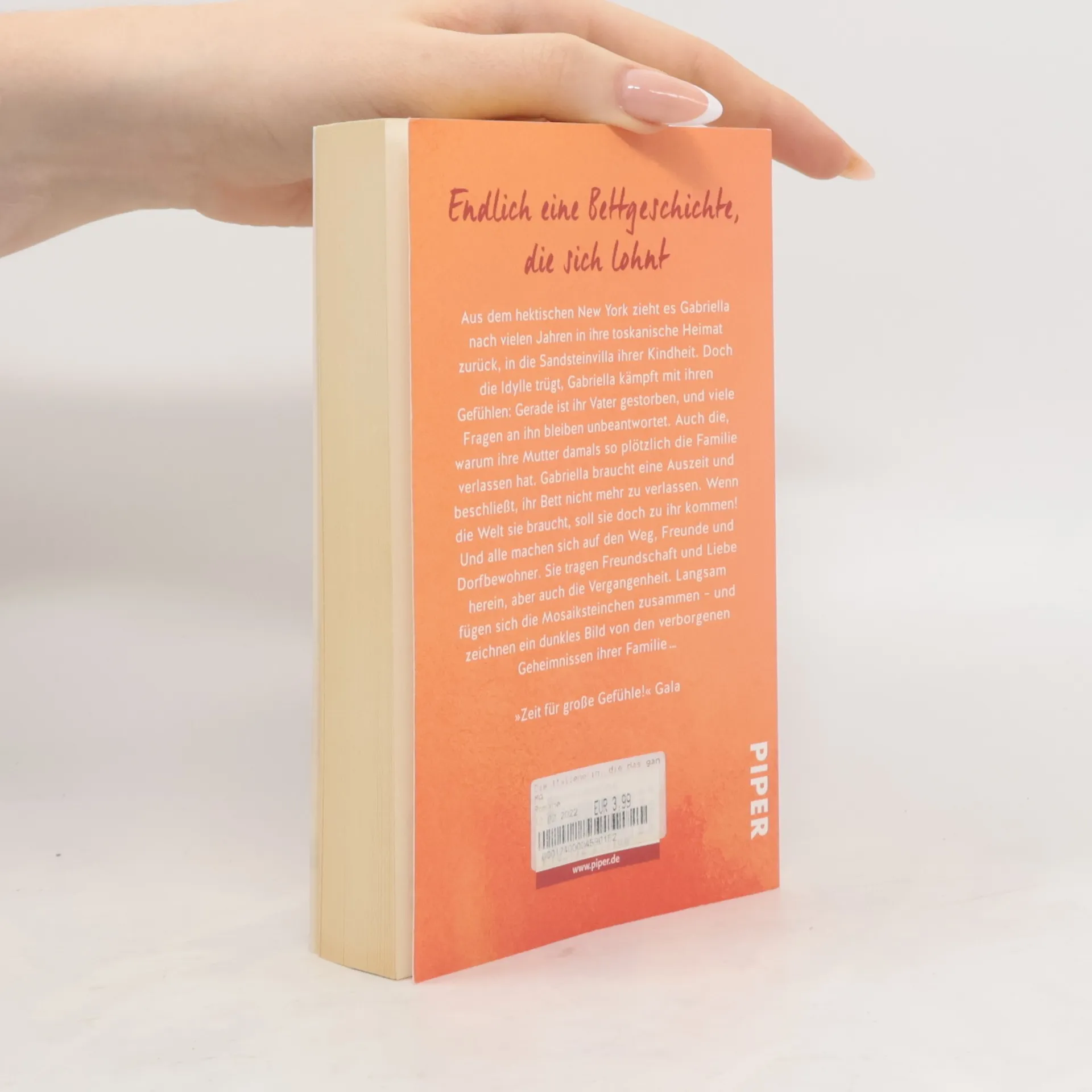 Aus ihrem Schlafzimmer geht Gabriellas Blick über die sanften Hügel der Toskana. Sie braucht eine Auszeit von ihrem Job und ist nach vielen Jahren nach Hause zurückgekehrt. Sie liegt in den weißen Laken ihres Bettes und beschließt, es den ganzen Sommer nicht mehr zu verlassen. Wer sie sehen will, muss sich zu ihr legen. Und alle kommen, vom Schornsteinfeger bis zum Pfarrer. Sie reden auch über Gabriellas Mutter, die eines Tages für immer verschwand. Gabriella hatte nur noch ihren Vater und die geliebte Haushälterin Emilia. Doch schon bald wird ihr klar, dass die Dinge nicht so liegen, wie sie immer dachte ...