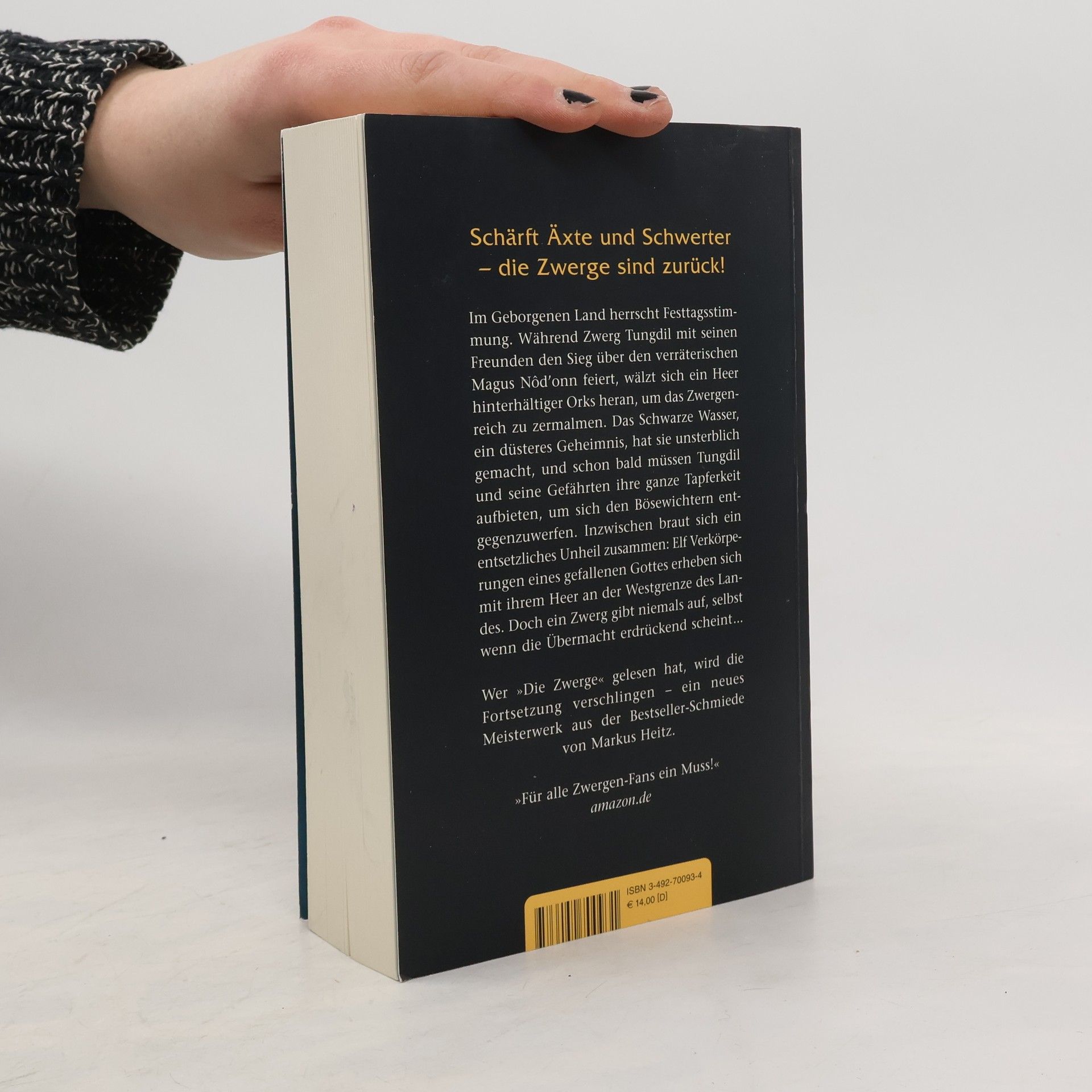 Im Geborgenen Land herrscht Festtagsstimmung. Während Zwerg Tungdil mit seinen Freunden den Sieg über den verräterischen Magus Nôd'onn feiert, wälzt sich ein Heer hinterhältiger Orks heran, um das Zwergenreich zu zermalmen. Das Schwarze Wasser, ein düsteres Geheimnis, hat sie unsterblich gemacht, und schon bald müssen Tungdil und seine Gefährten ihre ganze Tapferkeit aufbieten, um sich den Bösewichtern entgegenzuwerfen. Inzwischen braut sich ein entsetzliches Unheil zusammen: Elf Verkörperungen des Gottes des Bösen stehen mit ihrem Heer an der Westgrenze des Landes. Doch ein Zwerg gibt seinen Besitz erst auf, wenn die letzte Axt geschwungen ist … – Wer »Die Zwerge« gelesen hat, wird die Fortsetzung verschlingen – ein neues Meisterwerk aus der Bestsellerschmiede von Markus Heitz.