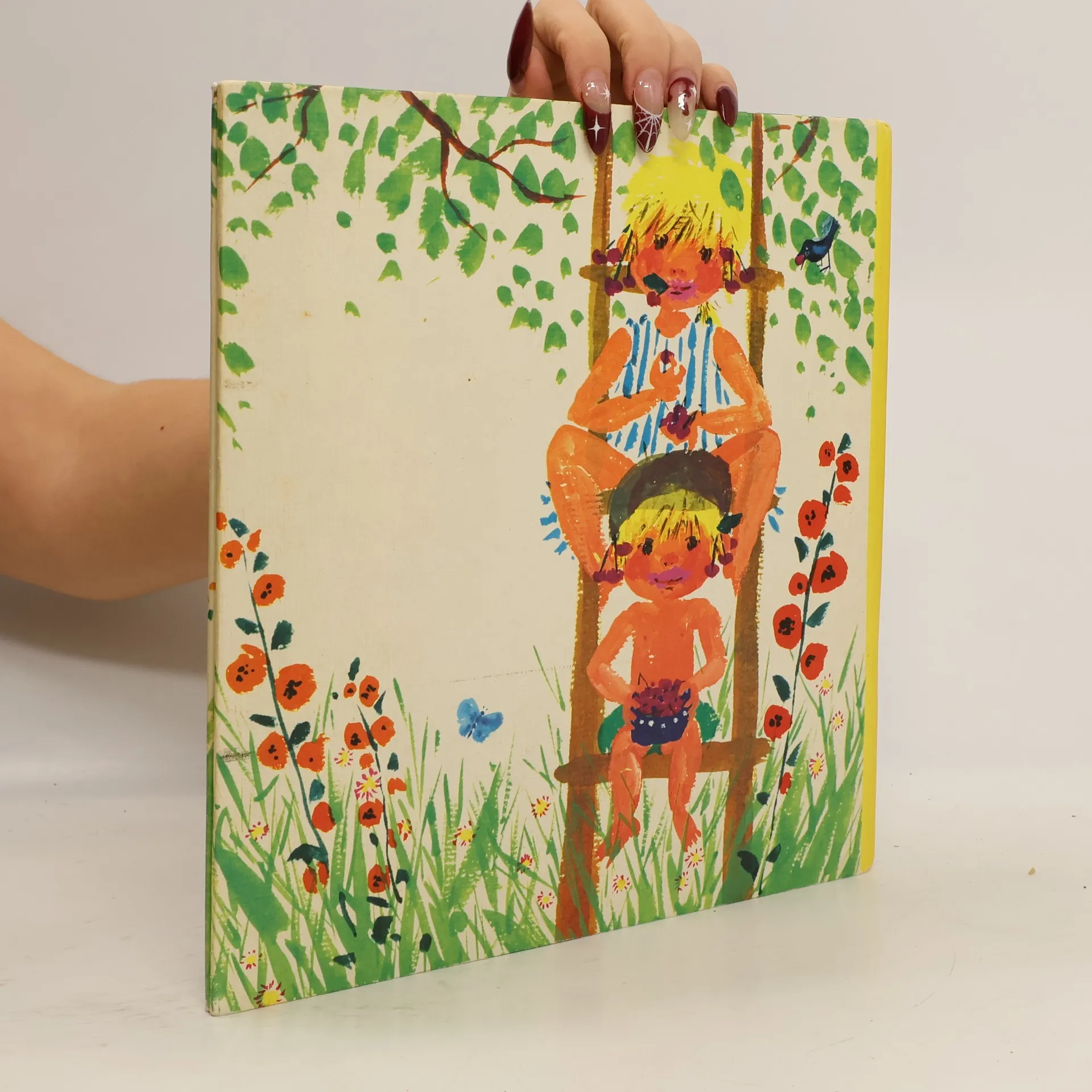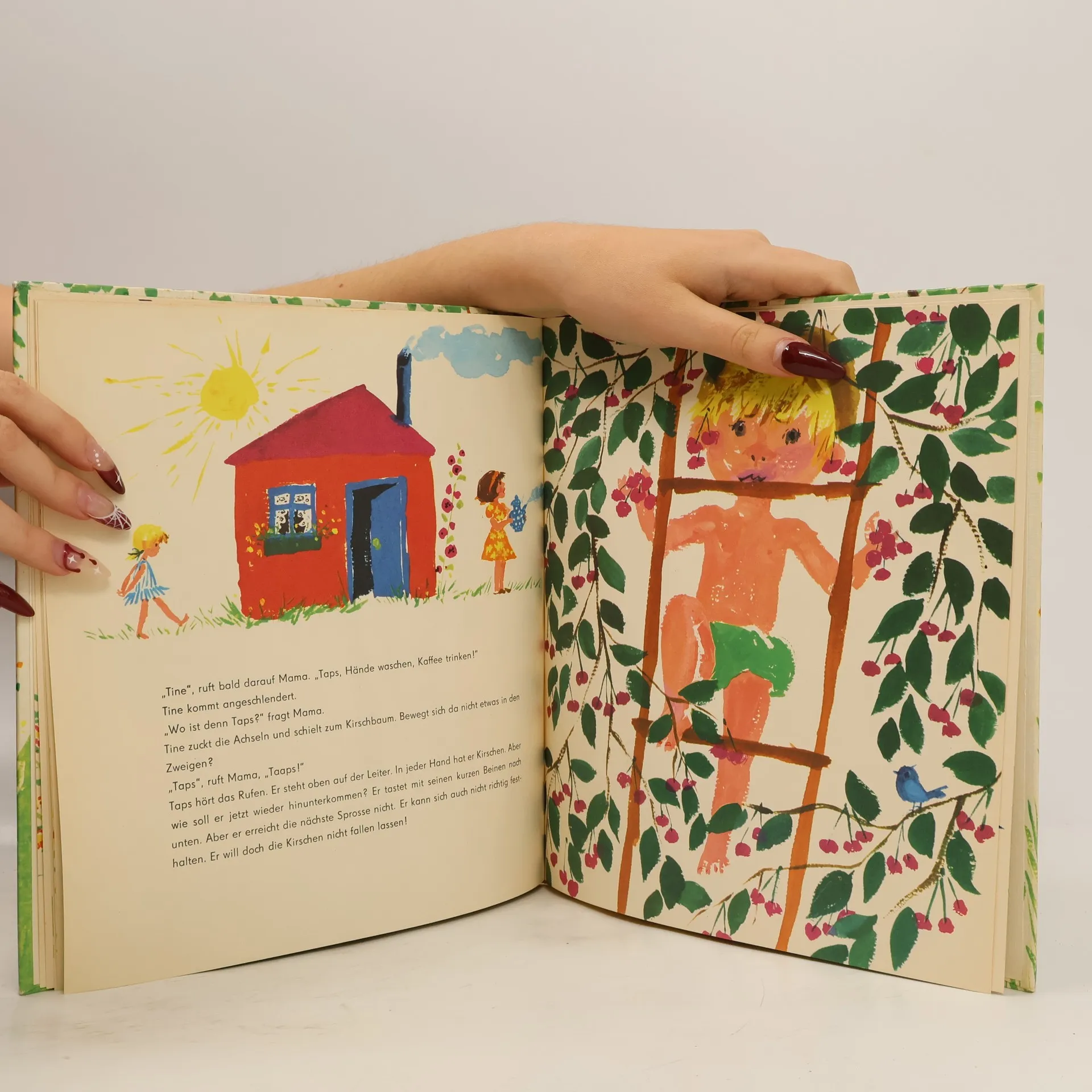 Tine und ihr kleiner Bruder Taps helfen ihren Eltern, die Bohnen fürs Mittagessen zu ernten. Doch nebenan hängen die roten Kirschen so verlockend am Baum, dass Taps kurzerhand auf die Leiter klettert – obwohl die Eltern das eigentlich verboten haben. Taps pflückt und pflückt und pflückt, bis er sich vor lauter Kirschen nicht mehr an der Leiter festhalten kann. Vorsichtig steigt er herab und - schwups - rutscht er aus. Zum Glück bemerkt Papa das kleine Malheur und kommt sofort angesprungen!