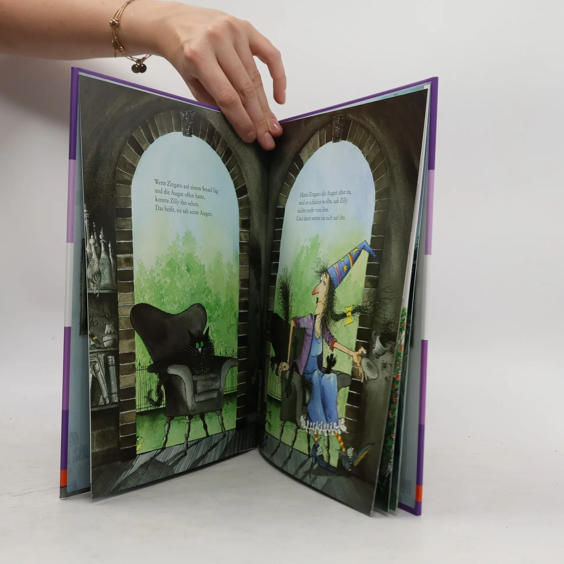 Zilly und Zingaro: Das sind turbulente Vorlesegeschichten rund um Zauberin Zilly und ihren Kater Zingaro. Große Wimmelbilder mit vielen witzigen Details begeistern Kinder ab 4 und auch noch Leseanfänger. Zilly liebt Schwarz. Ihr ganzes Haus hat sie in Schwarz eingerichtet, und auch ihr Kater Zingaro ist schwarz. Und wenn Zingaros Augen geschlossen sind, kann man schon mal schnell über ihn stolpern oder sich auf ihn setzen. Aber auch als Zilly ihn grasgrün zaubert, gibt es Probleme ...