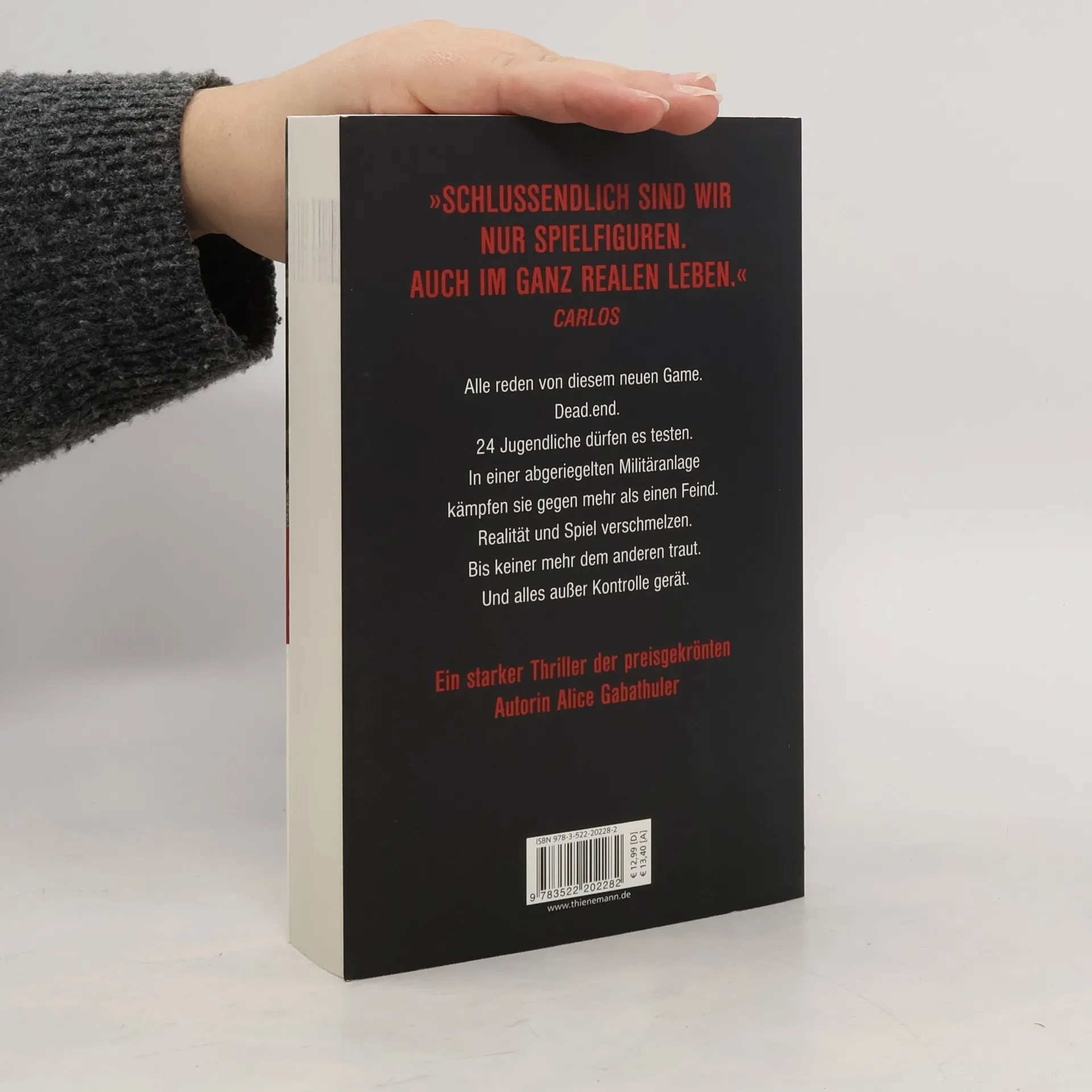 „Schlussendlich sind wir nur Spielfiguren. Auch im ganz realen Leben.“ Alle reden von diesem neuen Game. dead. end. 24 Jugendliche dürfen es testen. In einer abgeriegelten Militäranlage kämpfen sie gegen mehr als einen Feind. Realität und Spiel verschmelzen. Bis keiner mehr dem anderen traut. Und alles außer Kontrolle gerät. Ein starker Thriller der preisgekrönten Autorin Alice Gabathuler