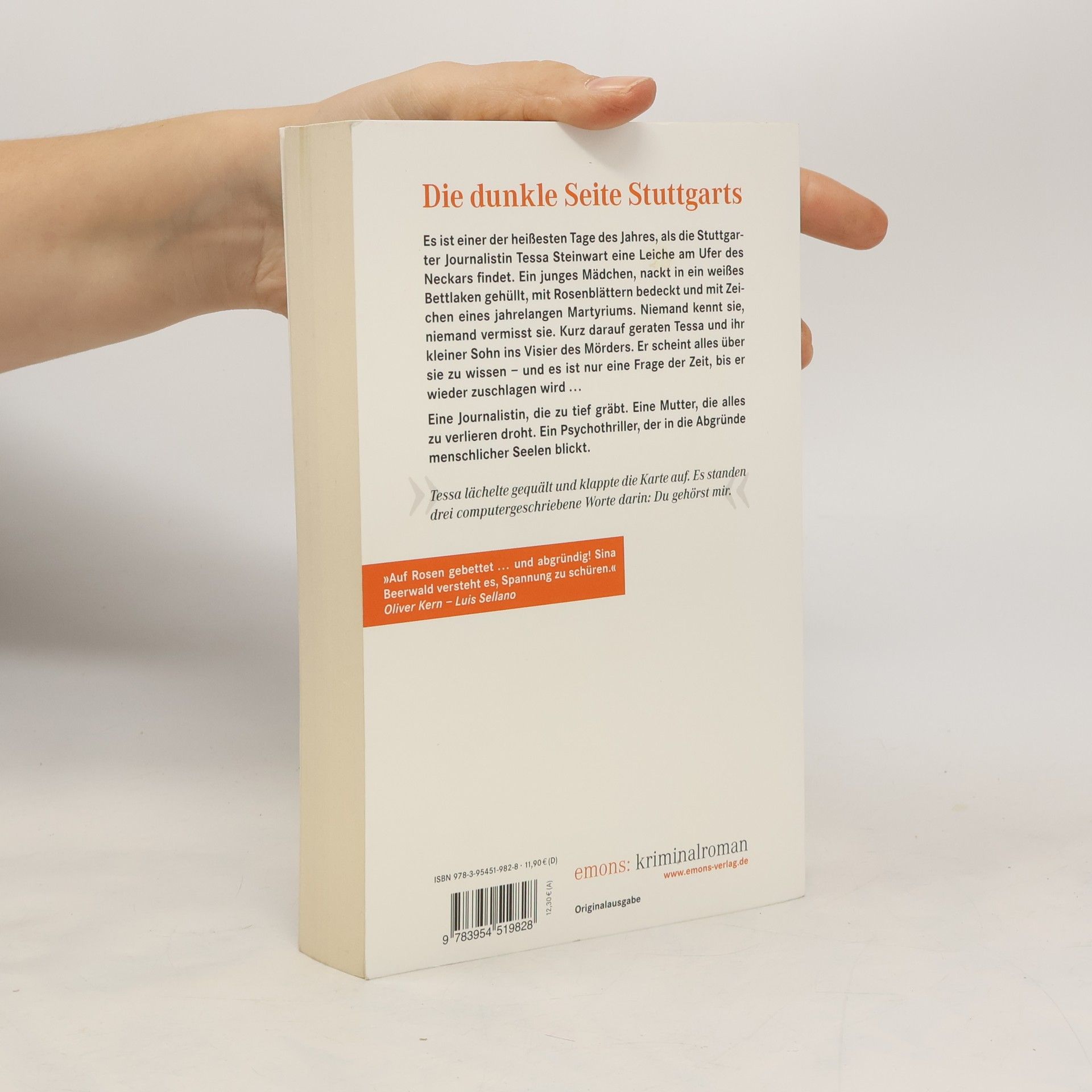 Es ist einer der heißesten Tage des Jahres, als die Stuttgarter Journalistin Tessa Steinwart eine Leiche am Ufer des Neckars findet. Ein junges Mädchen, nackt in ein weißes Bettlaken gehüllt, mit Rosenblättern bedeckt und mit Zeichen eines jahrelangen Martyriums. Niemand scheint sie zu kennen, niemand zu vermissen. Kurz darauf geraten Tessa und ihr kleiner Sohn ins Visier des Mörders. Er scheint alles über sie zu wissen – und es ist nur eine Frage der Zeit, bis er wieder zuschlagen wird ...