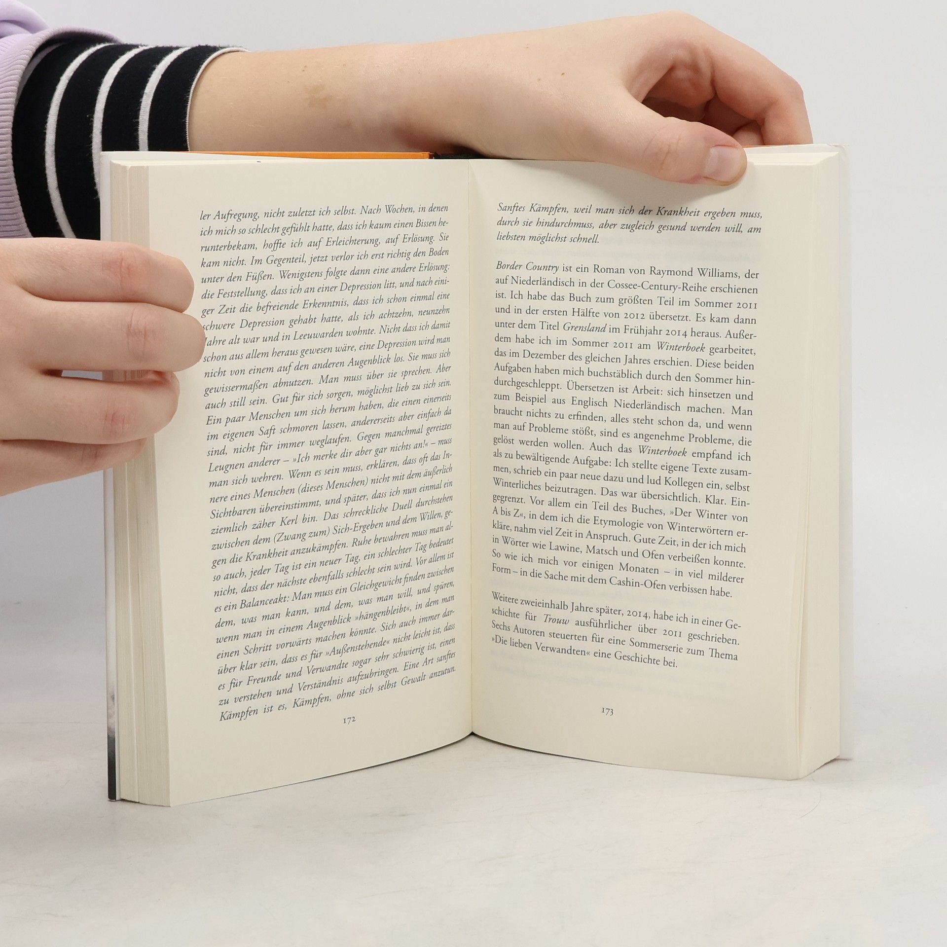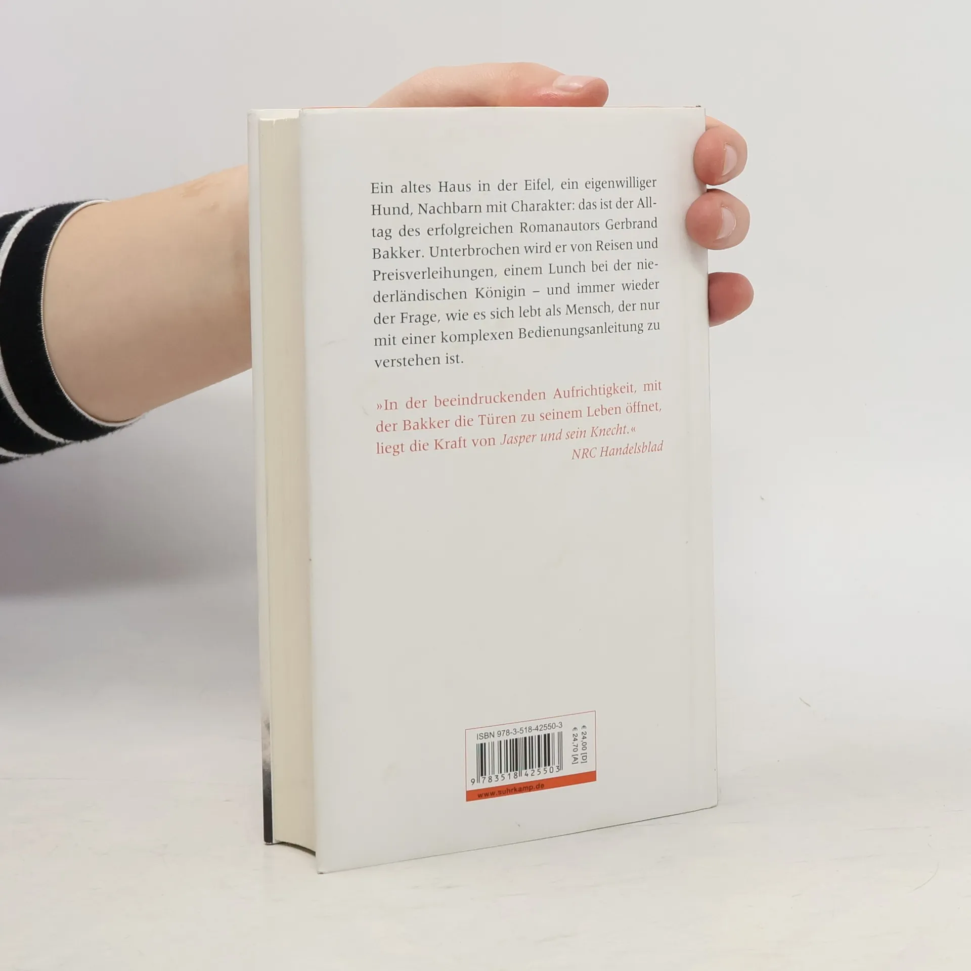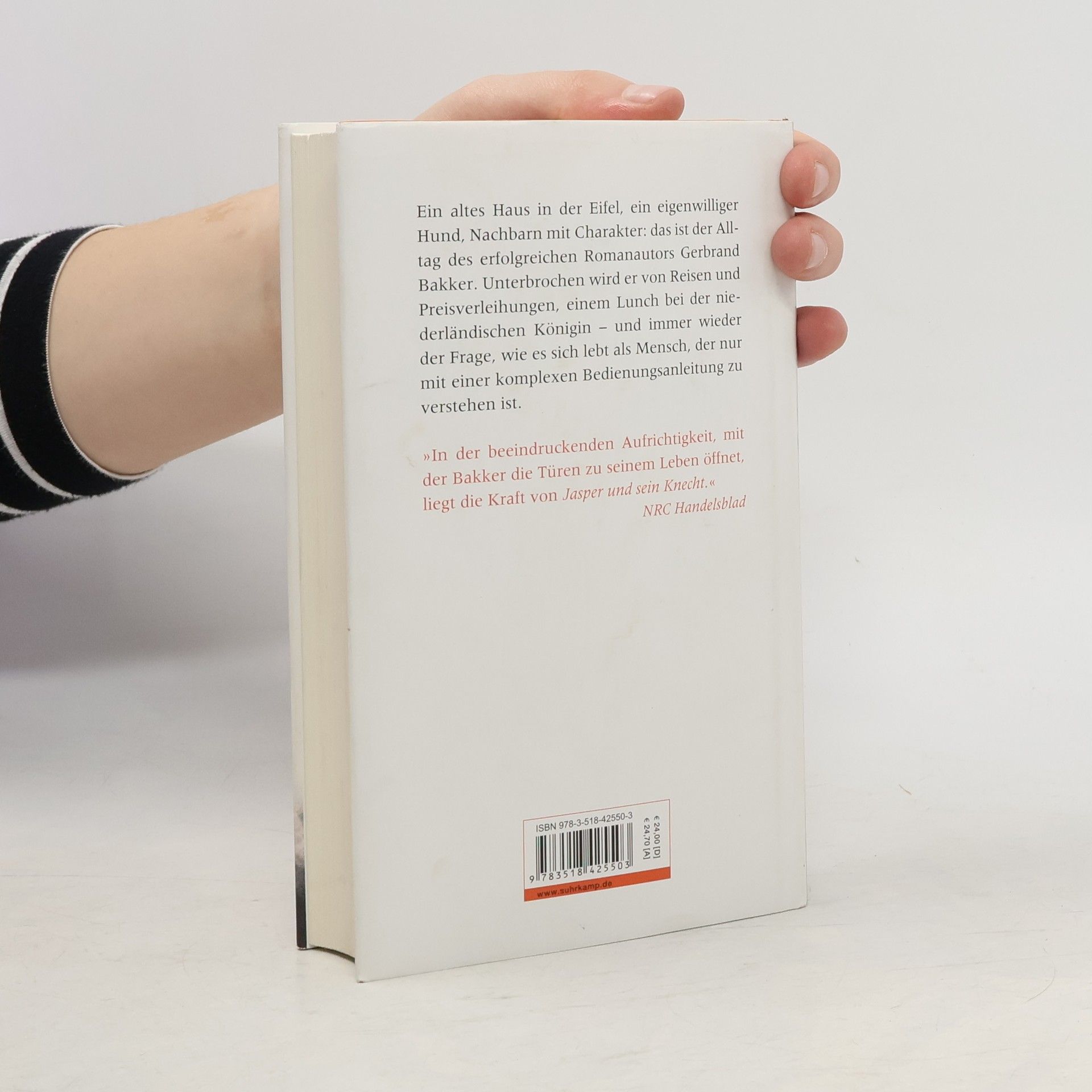 Ein erfolgreicher niederländischer Romanautor kauft ein altes Haus in der Eifel und lässt sich dort mit seinem Hund Jasper nieder. Die Holzöfen ziehen bei Nieselregen schlecht; den Pansen, den der jagende Nachbar für Jasper vorbeibringt, riecht man im ganzen Haus; der Hund ist von ähnlich schwierigem Charakter wie sein Herr, der sich als »von Natur aus depressiv« beschreibt. Warum einen das alles so in den Bann zieht, dass man nicht mehr aufhören möchte zu lesen? Weil Gerbrand Bakker seine Aufzeichnungen subtil verknüpft mit den Erinnerungen an früher, an Opa Bakker und den Bauernhof der Eltern, den verunglückten kleinen Bruder, berufliche Wege und Irrwege, schräge und erhebende Preisverleihungen. Und weil er ein Meister im Einfangen von Stimmungsnuancen ist. Entschleunigend und weise, ohne zu belehren: Gerbrand Bakker schreibt über ein Jahr in der Eifel, über ein Jahr im Leben eines Mannes, der in Romanen wie »Oben ist es still« die Seelen der Menschen auslotet und sich nun einen Blick ins eigene innere Erleben erlaubt – mit packender Ehrlichkeit und unschlagbar trockenem Humor. »Gerbrand Bakker: der Meister der Andeutungen.« KulturSPIEGEL