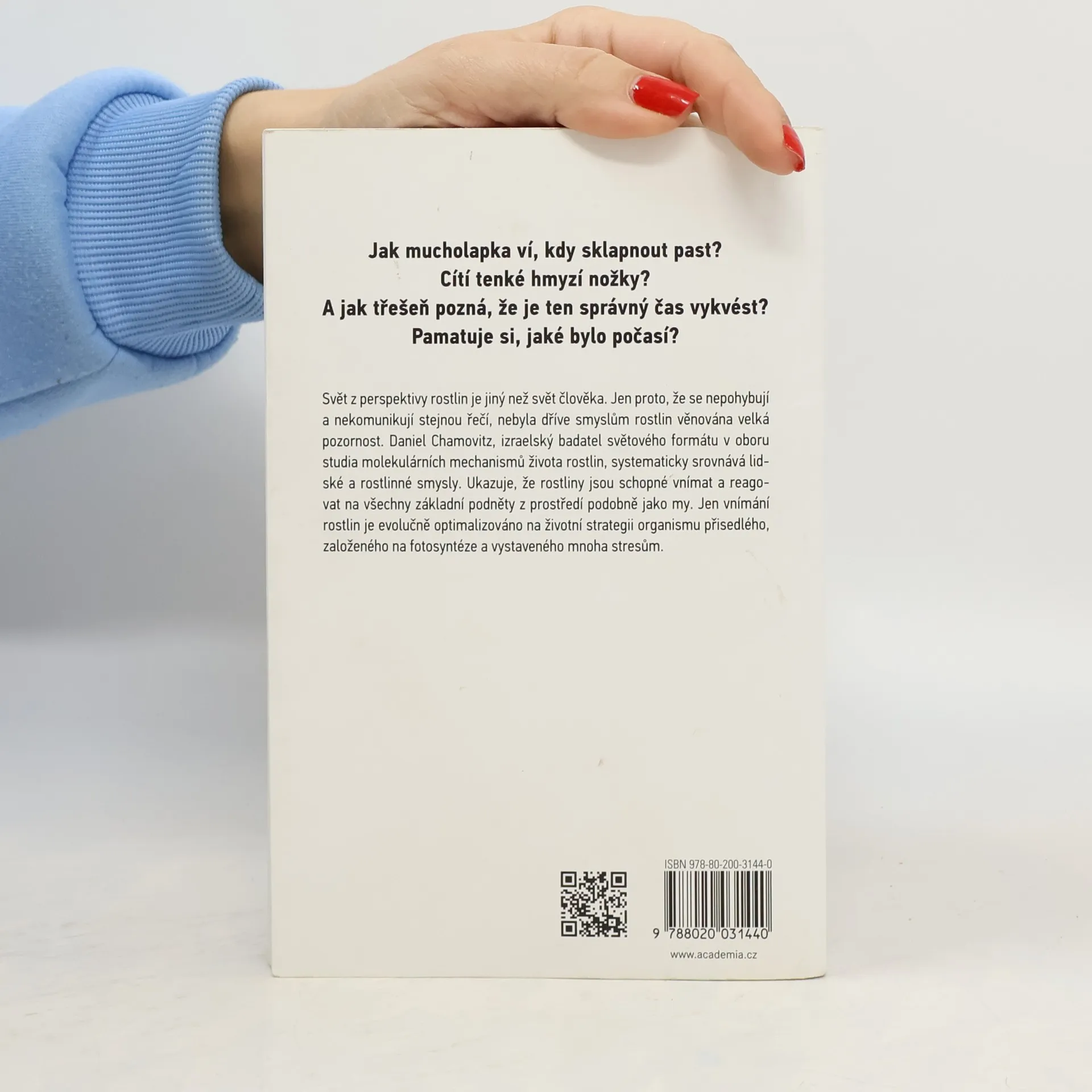 Jak mucholapka ví, kdy sklapnout past? Cítí tenké hmyzí nožky? A jak třešeň pozná, že je ten správný čas vykvést? Pamatuje si, jaké bylo počasí? Svět z perspektivy rostlin je jiný než svět člověka. Jen proto, že se nepohybují a nekomunikují stejnou řečí, nebyla dříve smyslům rostlin věnována velká pozornost. Daniel Chamovitz, izraelský badatel světového formátu v oboru studia molekulárních mechanismů života rostlin, systematicky srovnává lidské a rostlinné smysly. Ukazuje, že rostliny jsou schopné vnímat a reagovat na všechny základní podněty z prostředí podobně jako my. Jen vnímání rostlin je evolučně optimalizováno na životní strategii organismu přisedlého, založeného na fotosyntéze a vystaveného mnoha stresům.