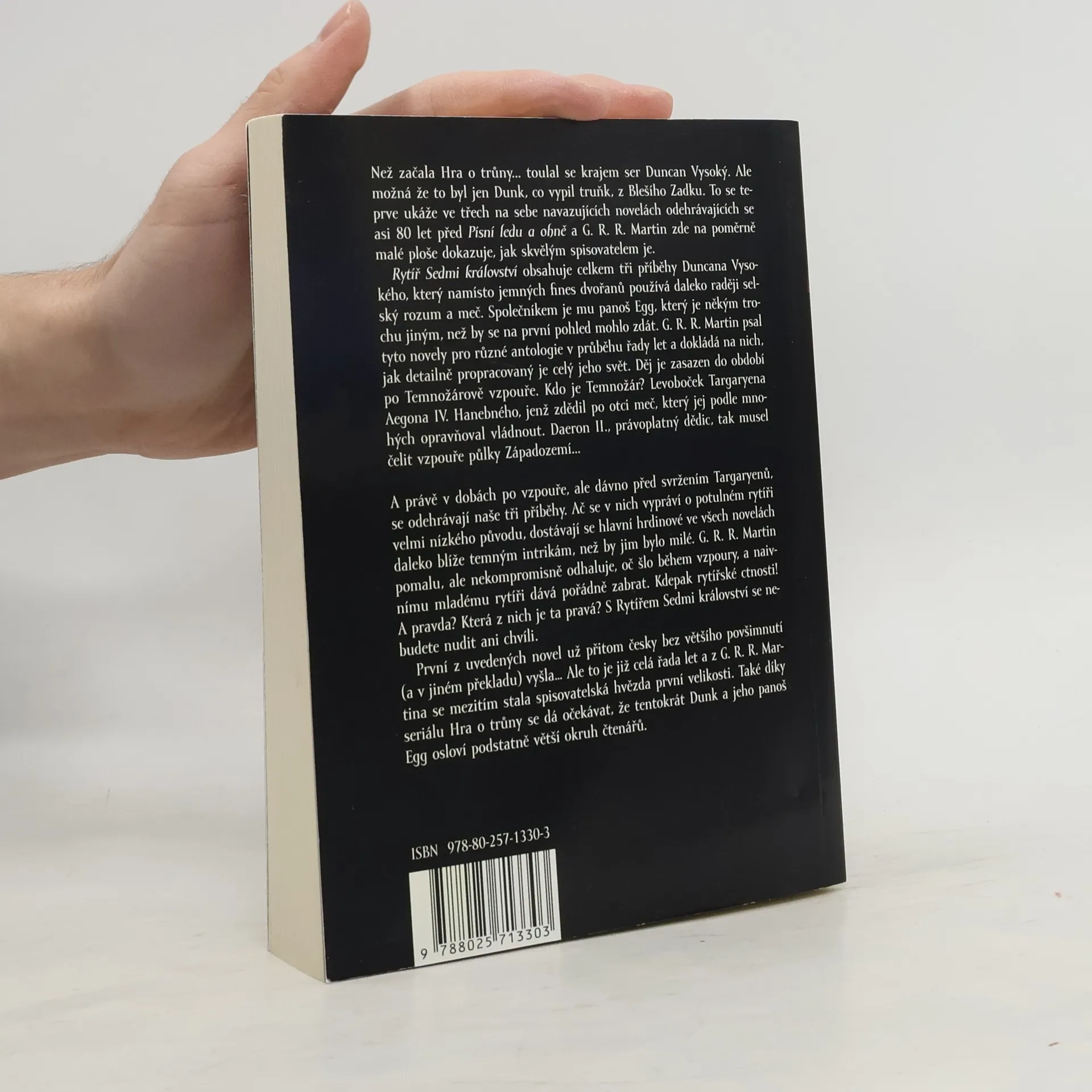 Dlouho před událostmi, které znáte ze Hry o trůny, sedí Targaryenové pevně na Železném trůně. To ovšem neznamená, že v Západozemí panuje klid. Bratrovražedný boj uvnitř vládnoucí dynastie rozpoltil Sedm království. A právě v té době křižuje krajem potulný rytíř ser Duncan Vysoký. Anebo Dunk tupý jako lenochův meč? Všechno je to nějak zamotané, a to včetně původu jeho panoše Egga. Tři uzavřené, ale navazující novely ze světa Hry o trůny představují G. R. R. Martina tak, jak si jej čtenáři zamilovali dávno před slavnou ságou – jako jednoho z nejlepších povídkářů žánru.
