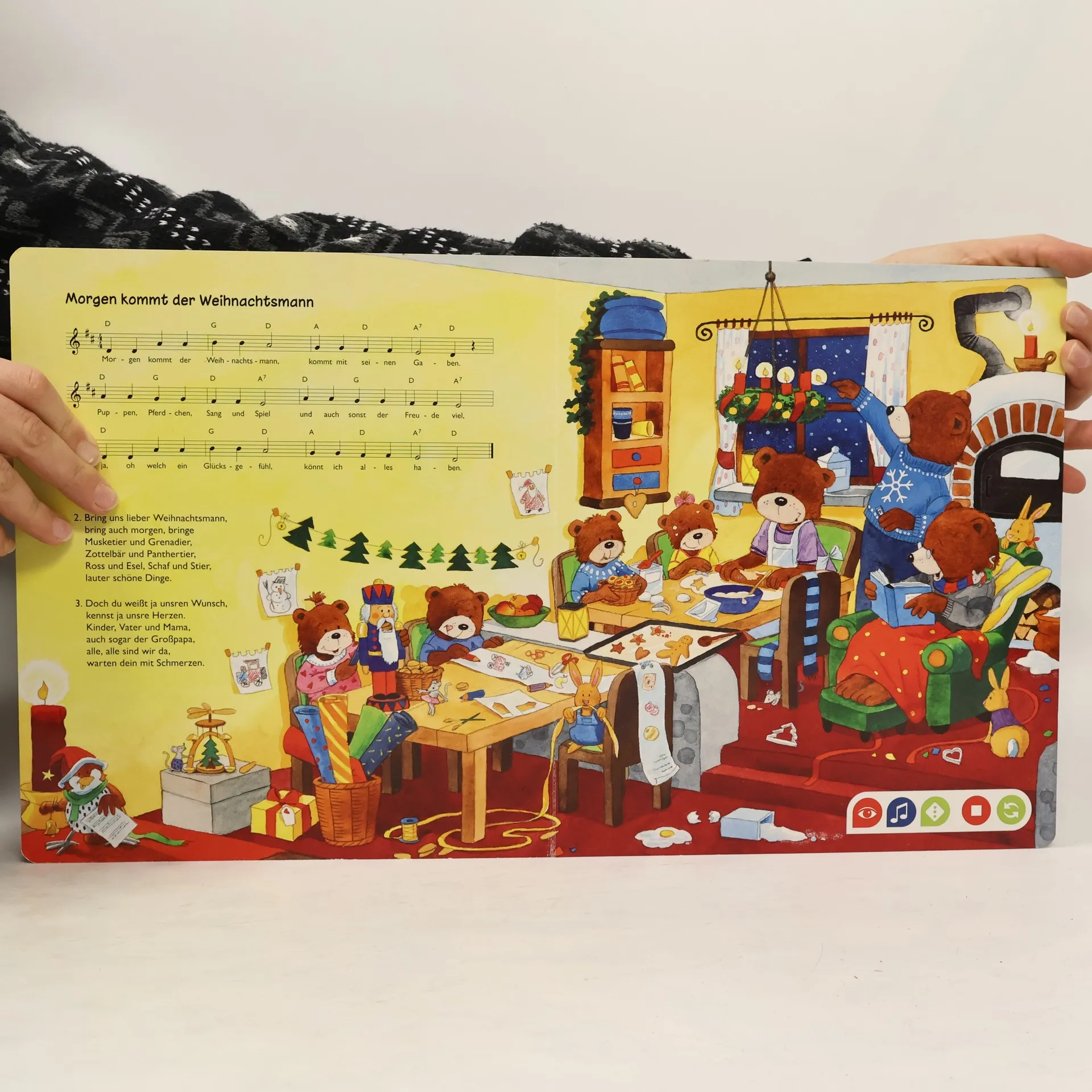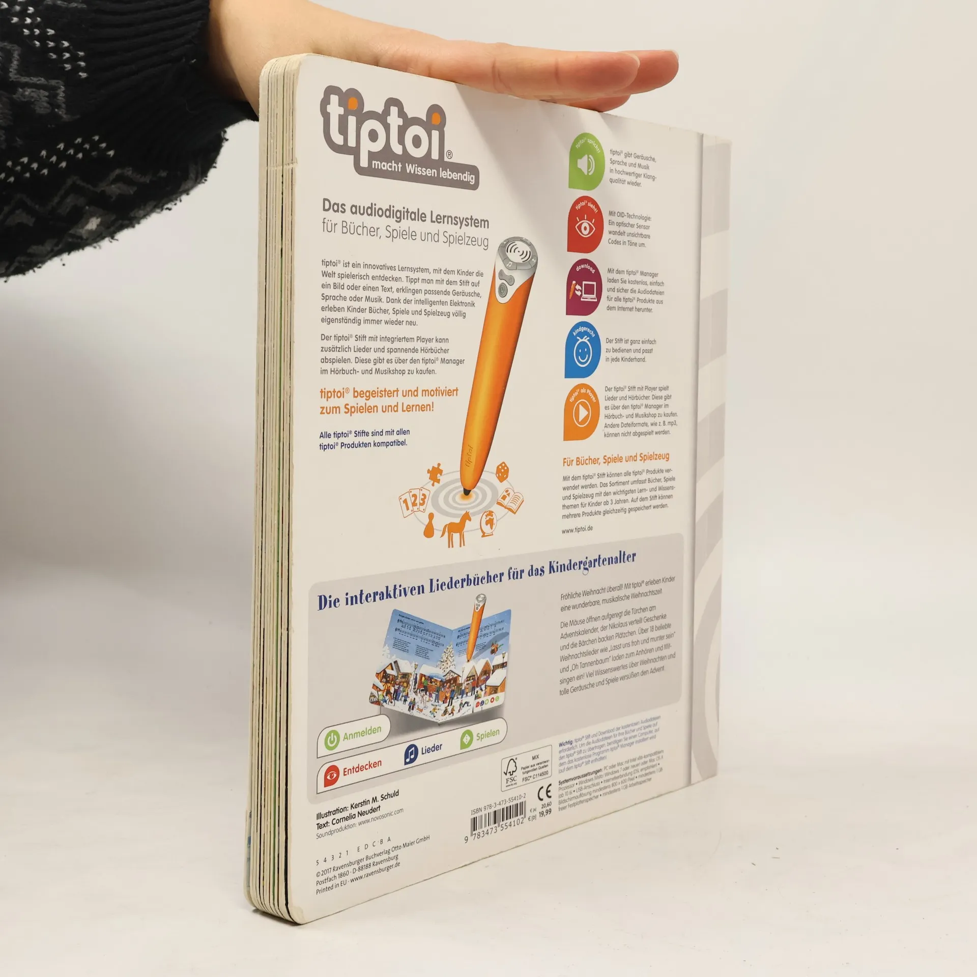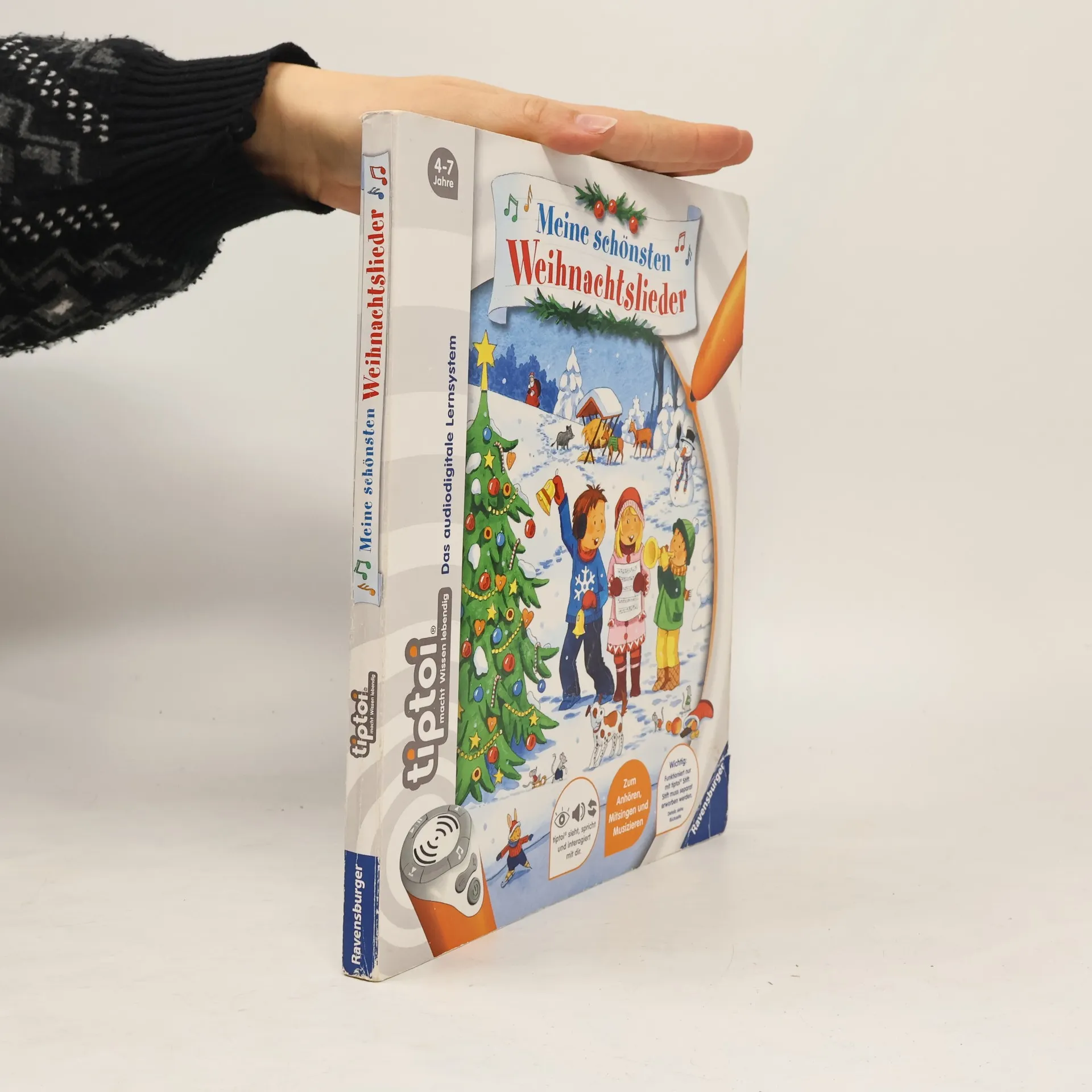 Fröhliche Weihnacht überall! Mit vielen beliebten Weihnachtsliedern erleben Kinder eine wunderbare, musikalische Adventszeit. Die Mäuse öffnen aufgeregt die Türchen am Adventskalender, Menschen und Tiere haben Spaß im Schnee, der Nikolaus verteilt Geschenke und die Bärchen backen Plätzchen und malen Wunschzettel. Wie feiert man in anderen Ländern Weihnachten? Wie wird die Weihnachtsgeschichte in der Bibel erzählt? Wie sind Traditionen wie der Adventskranz entstanden? Mit den tiptoi Liederbüchern macht Singen besonders großen Spaß! Die abgedruckten Lieder können mit Gesang oder in der Instrumentalversion angehört werden. Die Notensätze und Gitarrenakkorde laden zum Musizieren ein. Neben den abgedruckten Liedern sind zahlreiche weitere auf den Bildern versteckt. Liebevolle Illustrationen werden durch kindgerechte Texte zum Leben erweckt. Lustige Reime und spannende Spiele lassen die Kinder in die Themenwelten eintauchen. Musik ist überall! tiptoi-Stift nicht enthalten. Muss separat erworben werden.
