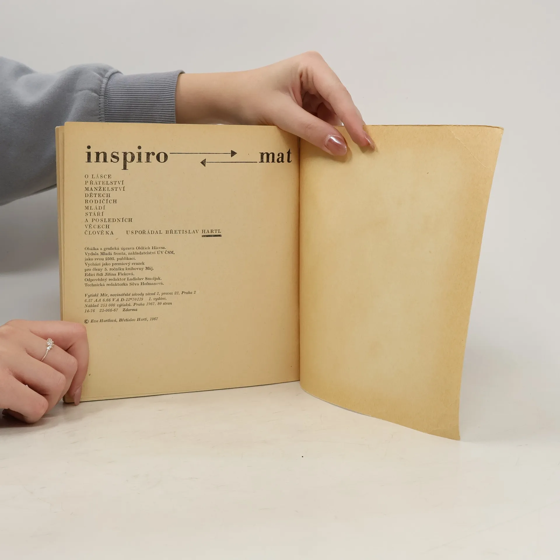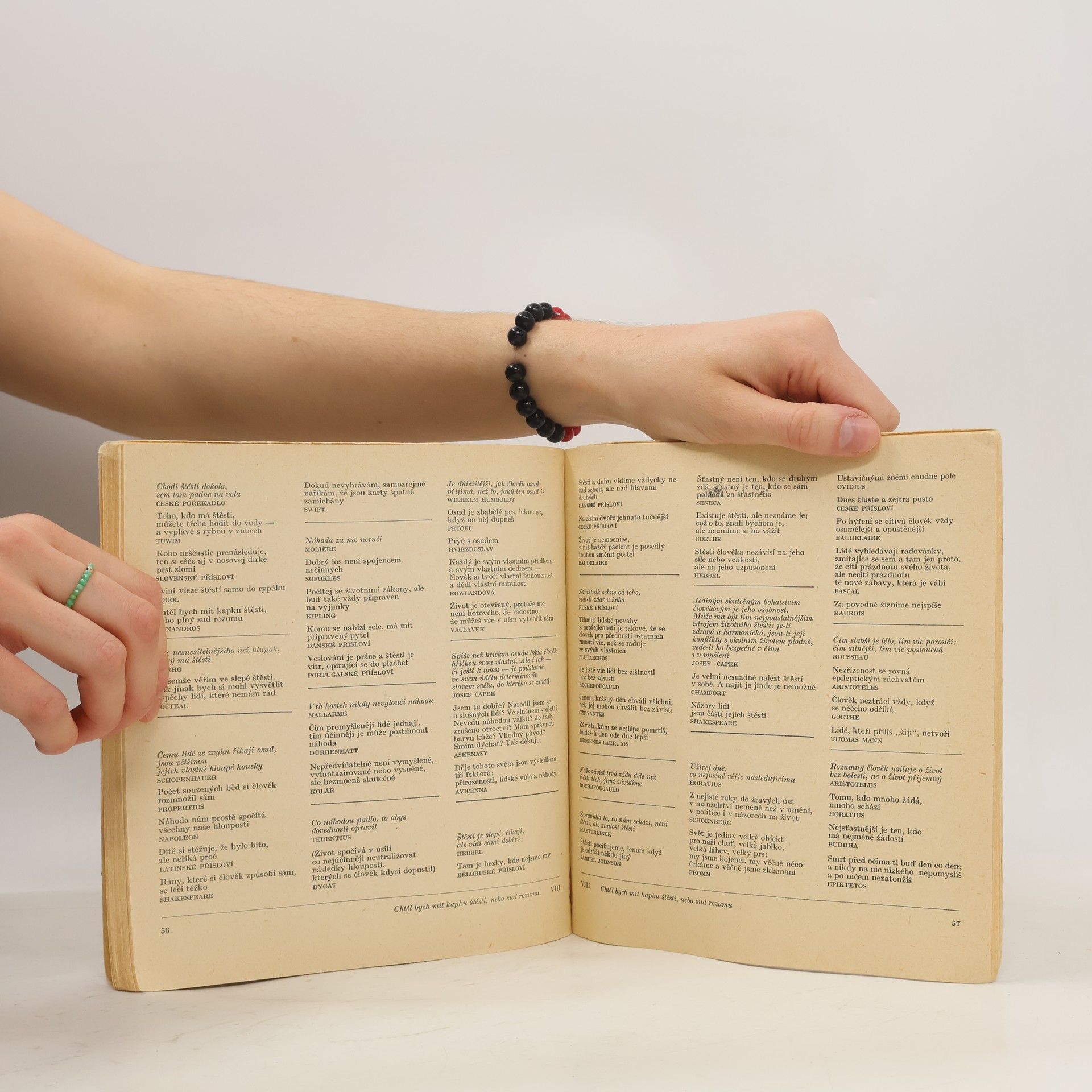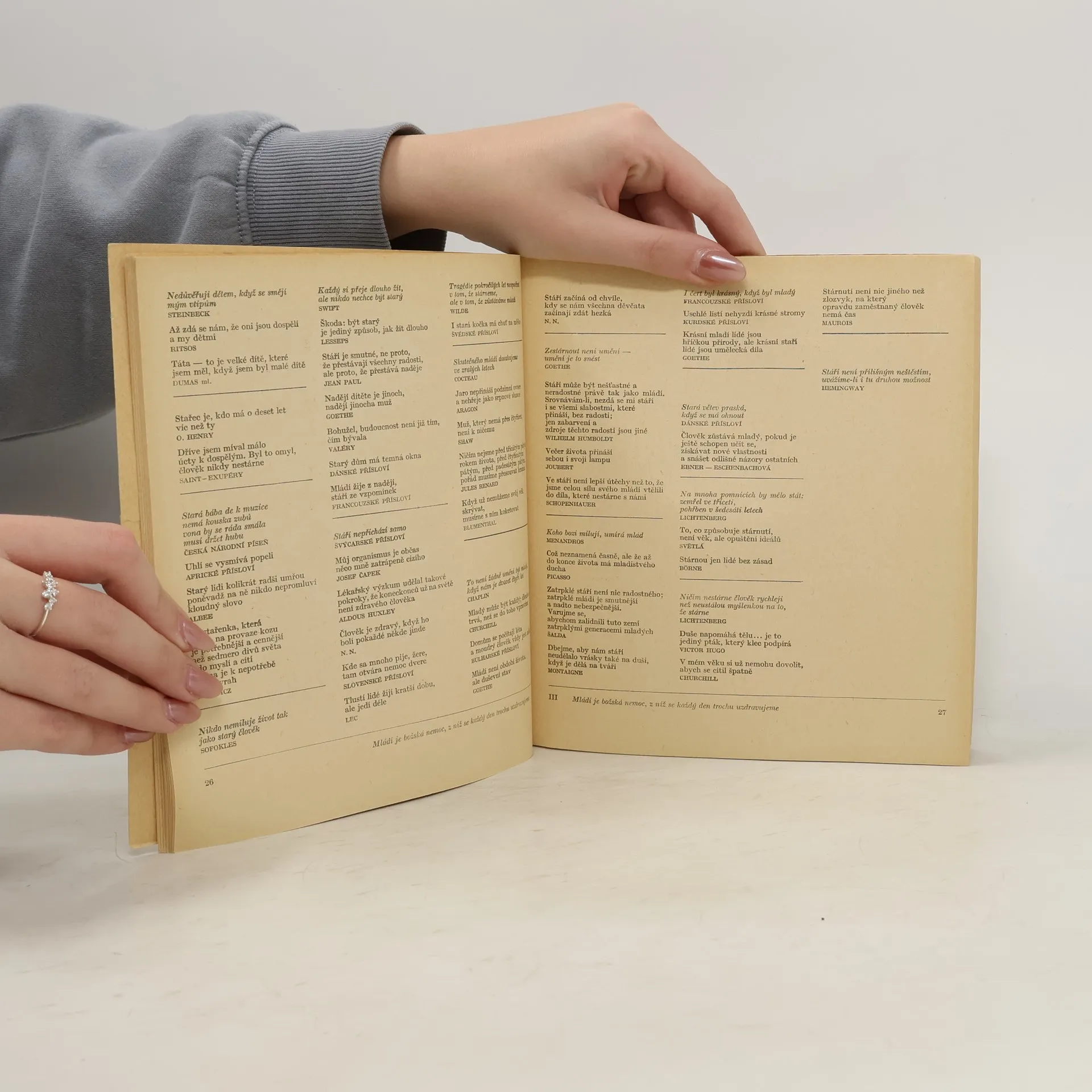 Vtipné výroky slavných lidí nejrůznějších profesí, nejrůznějších dob, domácích i světových, také však jednotlivá národní přísloví v tematickém řazení: I. Mladý gentleman, který se hodlá oženit, by se rád seznámil. II. Vilík nestojí za nic, prodáme ho. III. Mládí je božská nemoc, z níž se každý den trochu uzdravujeme. IV. Život je krátký, samozřejmě - ale v poměru k čemu? V. Poslední slova. VI. Dva je tisíckrát jedna. Vll. Máš-li dobrého přítele, máš víc než on. VIII. Chtěl bych mít kapku štěstí, nebo sud rozumu. Prémie 5. ročníku edice Máj