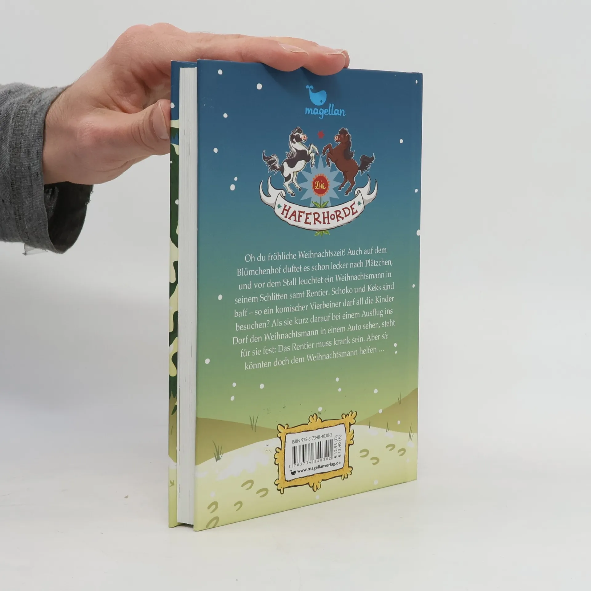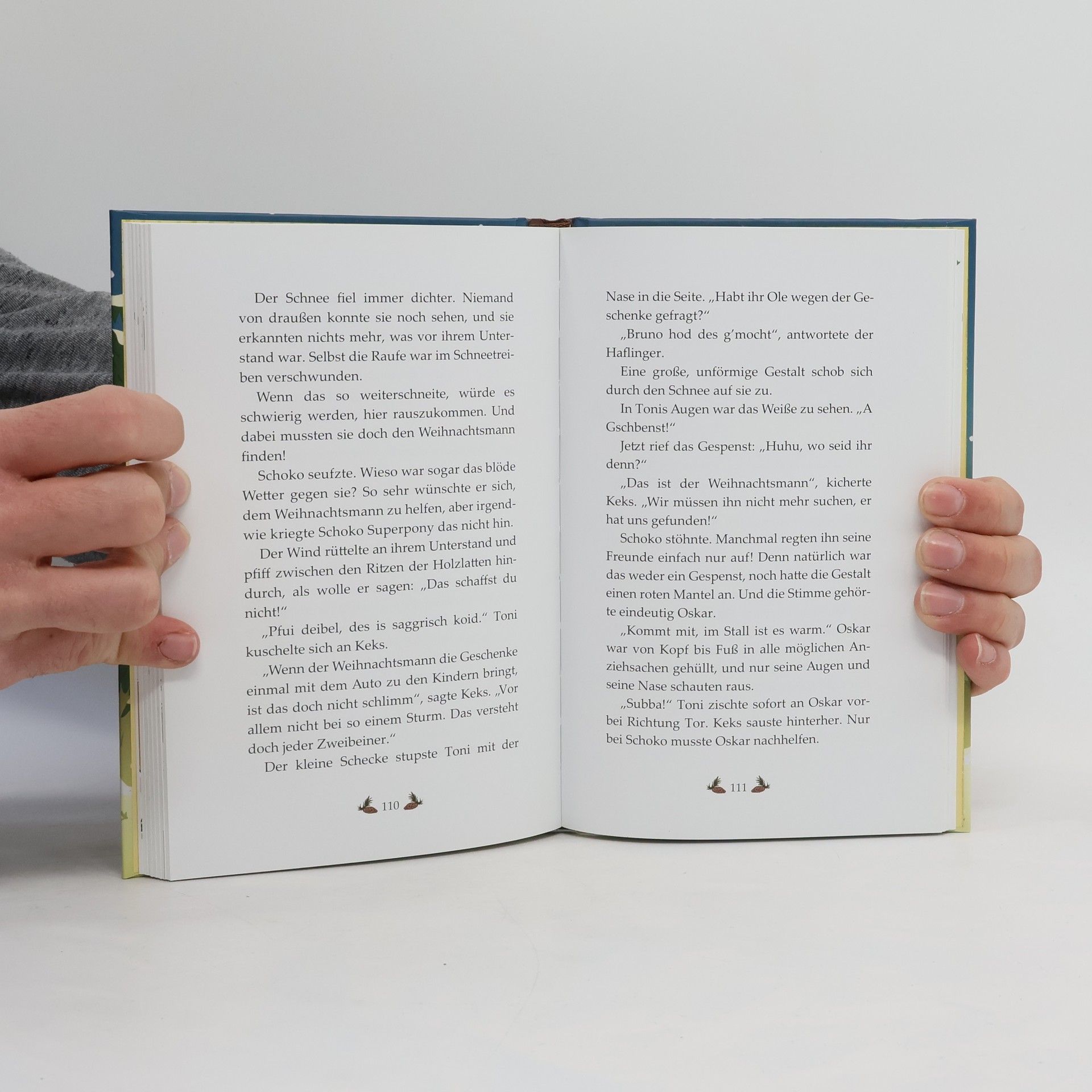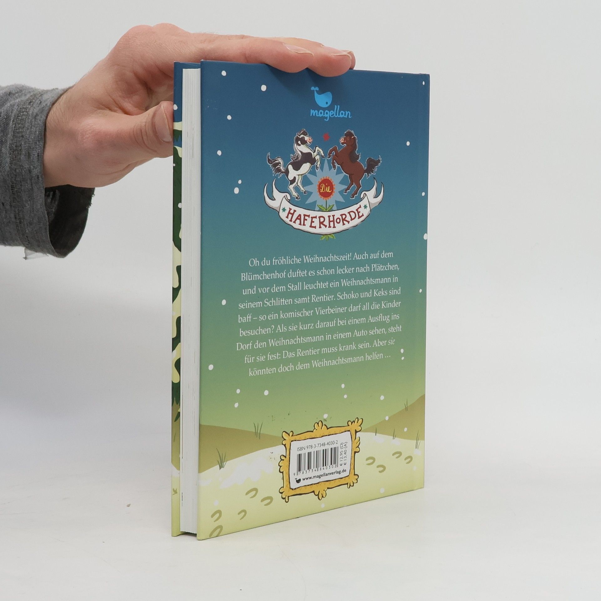 Weihnachten steht vor der Tür. Auch auf dem Blümchenhof wird eifrig gebacken und geschmückt, und im Hof hat Maria eine Riesendeko aufgebaut: der Weihnachtsmann in seinem Schlitten samt Rentier. Schoko und Keks sind baff – so ein komischer Vierbeiner darf dem Weihnachtsmann helfen? Als sie kurz darauf bei einem Ausflug ins Dorf den Weihnachtsmann in einem Auto sehen, ist für sie klar: Das Rentier muss krank sein. Oje, wer bringt denn dann die Geschenke zu den Kindern? Wie gut, dass Schoko und Keks echte Weihnachtsponys sind. SIE könnten doch den Schlitten ziehen! Aber dafür müssen sie den Weihnachtsmann erstmal finden …