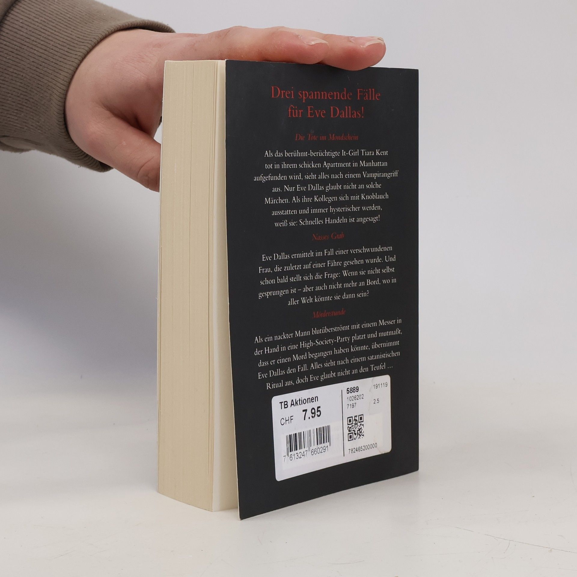 Drei spannende Fälle für Eve Dallas! Die Tote im Mondschein Als das berühmt-berüchtigte It-Girl Tiara Kent tot in ihrem schicken Apartment in Manhattan aufgefunden wird, sieht alles nach einem Vampirangriff aus. Nur Eve Dallas glaubt nicht an solche Märchen. Als ihre Kollegen sich mit Knoblauch ausstatten und immer hysterischer werden, weiß sie: Schnelles Handeln ist angesagt! Nasses Grab Eve Dallas ermittelt im Fall einer verschwundenen Frau, die zuletzt auf einer Fähre gesehen wurde. Und schon bald stellt sich die Frage: Wenn sie nicht selbst gesprungen ist – aber auch nicht mehr an Bord, wo in aller Welt könnte sie dann sein? Mörderstunde Als ein nackter Mann blutüberströmt mit einem Messer in der Hand in eine High-Society-Party platzt und mutmaßt, dass er einen Mord begangen haben könnte, übernimmt Eve Dallas den Fall. Alles sieht nach einem satanistischen Ritual aus, doch Eve glaubt nicht an den Teufel … Schnell ermittelt, rasant erzählt: Weitere Fälle für Eve Dallas und ihr Team finden Sie auch in »Mörderlied« und »Mörderspiele«!