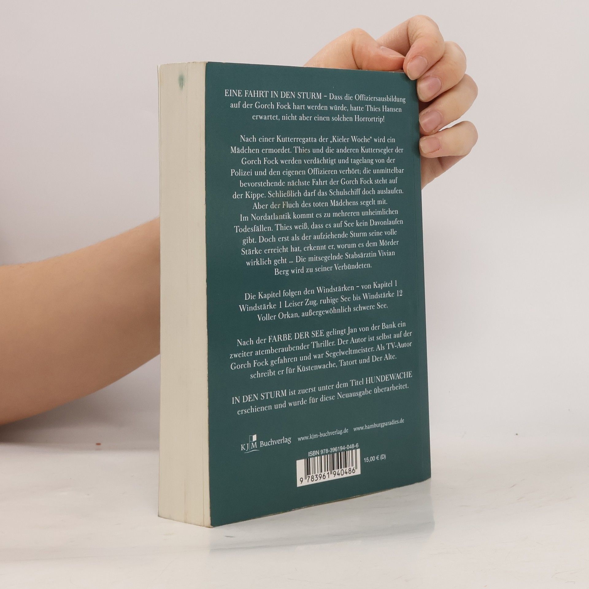 EINE FAHRT IN DEN STURM – Dass die Offiziersausbildung auf der Gorch Fock hart würde, hatte Thies Hansen erwartet, nicht aber einen solchen Horrortrip! Nach einer Kutterregatta der „Kieler Woche“ wird ein Mädchen ermordet. Thies und die anderen Kuttersegler der Gorch Fock werden verdächtigt und tagelang von Polizei und den eigenen Offizieren verhört; die unmittelbar bevorstehende nächste Fahrt der Gorch Fock steht auf der Kippe. Schließlich darf das Schulschiff doch auslaufen. Aber der Fluch des toten Mädchens segelt mit. Im Nordatlantik kommt es zu mehreren unheimlichen Todesfällen. Thies weiß, dass es auf See kein Davonlaufen gibt. Doch erst als der aufziehende Sturm seine volle Stärke erreicht hat, erkennt er, worum es dem Mörder wirklich geht ... Die mitsegelnde Stabsärztin Vivian Berg wird zu seiner Verbündeten. Die Kapitel folgen den Windstärken – von Kapitel 1 Windstärke 1 Leiser Zug, ruhige See bis Windstärke 12 Voller Orkan, außergewöhnlich schwere See. Nach der FARBE DER SEE gelingt Jan von der Bank ein zweiter atemberaubender Thriller. Der Autor ist selbst auf der Gorch Fock gefahren und war Segelweltmeister. Als TV-Autor schreibt er für Küstenwache, Tatort und Der Alte. IN DEN STURM ist zuerst unter dem Titel HUNDEWACHE erschienen und wurde für diese Neuausgabe überarbeitet.