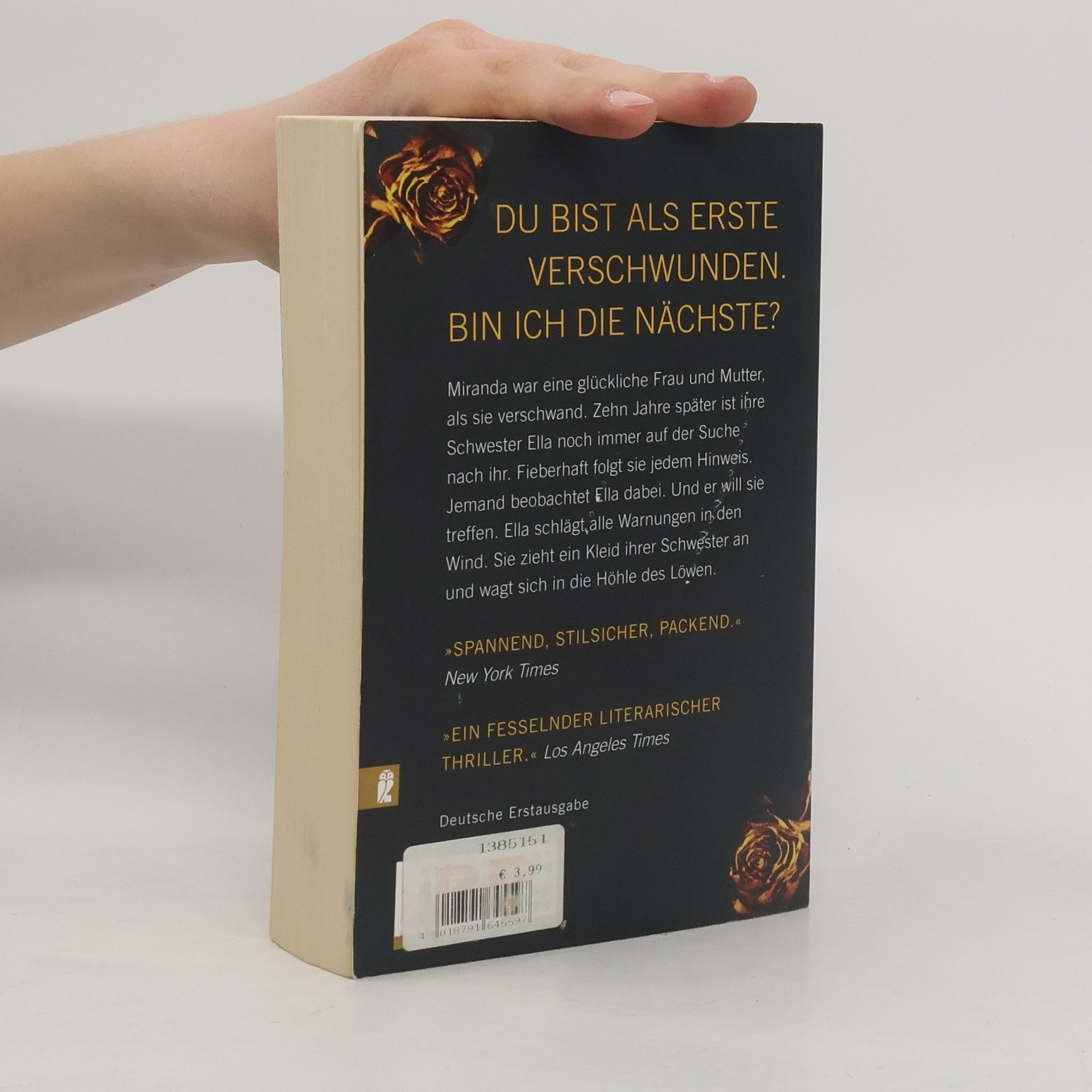 Du bist als Erste verschwunden. Bin ich die Nächste? Miranda war eine glückliche Frau und Mutter, als sie verschwand. Niemand fand auch nur eine einzige Spur von ihr. Zehn Jahre später ist ihre Schwester Ella noch immer auf der Suche – nach der Vermissten, nach der Wahrheit und danach, wer Miranda eigentlich war. Fieberhaft folgt sie jedem Hinweis. Aber jemand beobachtet Ella dabei. Und lädt sie ein, das Geheimnis der Schwester zu lüften. Ella schlägt alle Warnungen in den Wind und folgt ihrem Instinkt. Sie weiß, was sie zu tun hat. Sie zieht ein Kleid ihrer Schwester an und wagt sich in die Höhle des Löwen. „Spannend, stilsicher, ganz wunderbare packende Unterhaltung.“ New York Times „Ein fesselnder literarischer Thriller.“ Los Angeles Times