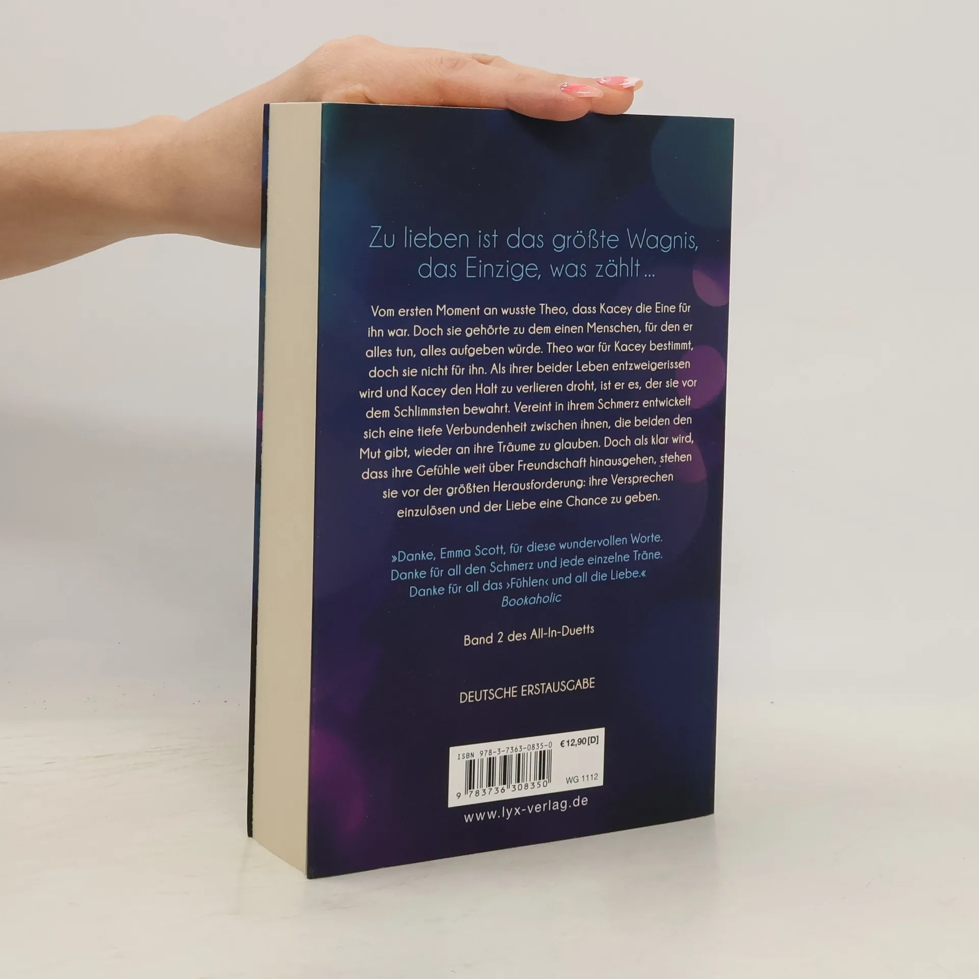 Zu lieben ist das größte Wagnis, das Einzige, was zählt ... Vom ersten Moment an wusste Theo, dass Kacey die Eine für ihn war. Doch sie gehörte zu dem einen Menschen, für den er alles tun, alles aufgeben würde. Theo war für Kacey bestimmt, doch sie nicht für ihn. Als ihrer beider Leben entzweigerissen wird und Kacey den Halt zu verlieren droht, ist er es, der sie vor dem Schlimmsten bewahrt. Vereint in ihrem Schmerz entwickelt sich eine tiefe Verbundenheit zwischen ihnen, die beiden den Mut gibt, wieder an ihre Träume zu glauben. Doch als klar wird, dass ihre Gefühle weit über Freundschaft hinausgehen, stehen sie vor der größten Herausforderung: ihre Versprechen einzulösen und der Liebe eine Chance zu geben. „Danke Emma Scott für diese wundervollen Worte. Danke für all den Schmerz und jede einzelne Träne. Danke für all das “Fühlen„ und all die Liebe.“ Bookaholic Band 2 des All-In-Duetts
