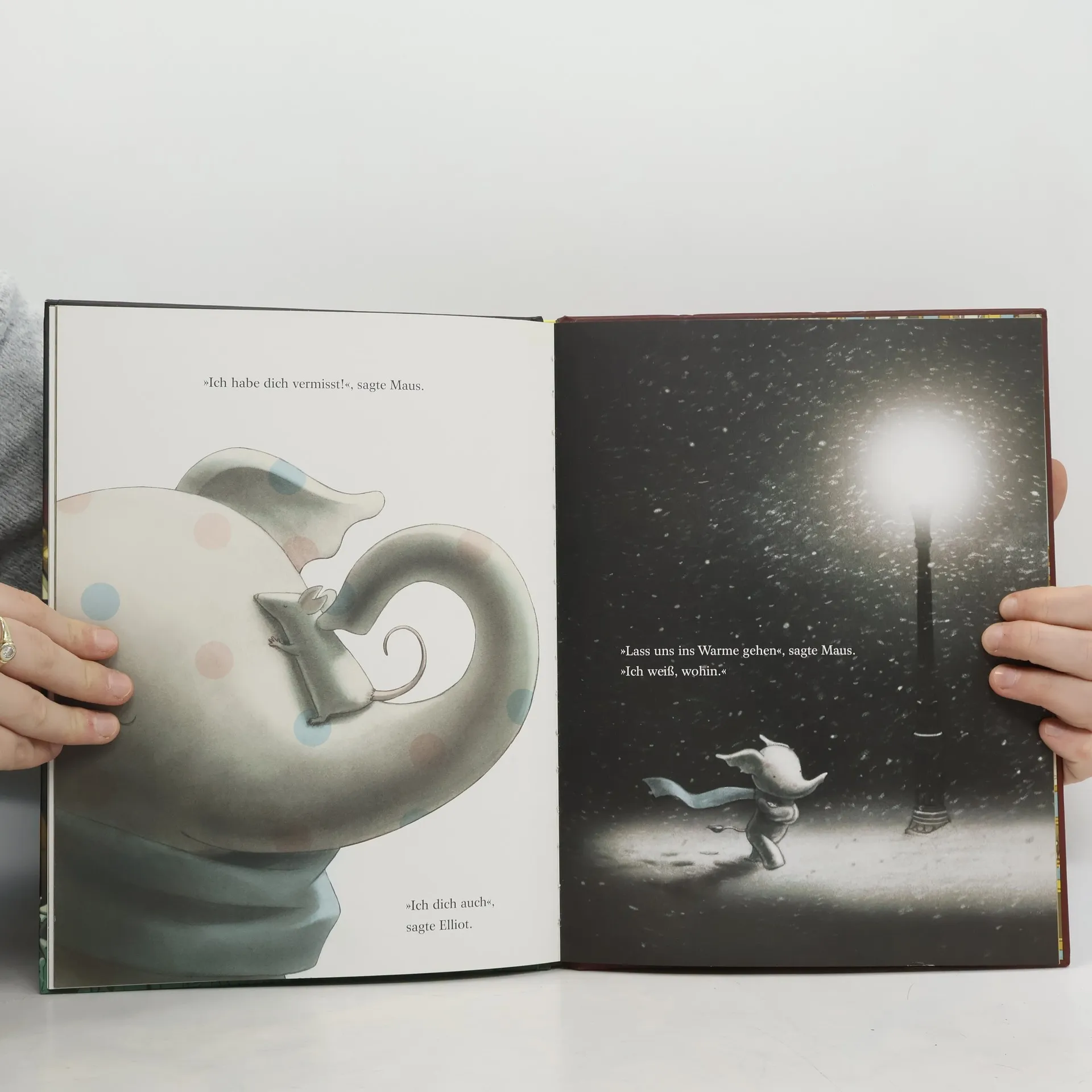 Elliot, der gepunktete kleine Elefant und die winzig kleine Maus sind beste Freunde. Sieleben zusammen in einer gemütlichen Wohnung mitten in großen New York. Doch an einem schönen Wintertag bleibt Elliot allein zurück. Seine kleine Freundin besucht ihre große Familie. Im Haus ist es plötzlich still und leer. Auch beim Spazierengehen wird Elliots Stimmung nicht besser. Denn er begegnet dabei vielen anderen Familien. Mütter, die ihren Kindern vorlesen, Schwestern, die sich gegenseitig Geheimnisse erzählen. Elliot fragt sich, wie es sich wohl anfühlt, auch Geschwister oder Cousins oder Onkel und Tanten zu haben. Einsam und traurig stapft er durch den Schneesturm. Plötzlich ruft jemand nach ihm. Es ist die kleine Maus. Sie hat ihn schon vermisst und holt ihn ins Warme. Zu ihrer riesig großen Familie, zu der Elliot natürlich dazugehört. Nostalgische Illustrationen zeigen das New York der 20er Jahre. Und zusammen mit der herzerwärmenden Geschichte wird dieses Bilderbuch zu einer ganz besonders schönen Hommage an die Familie.