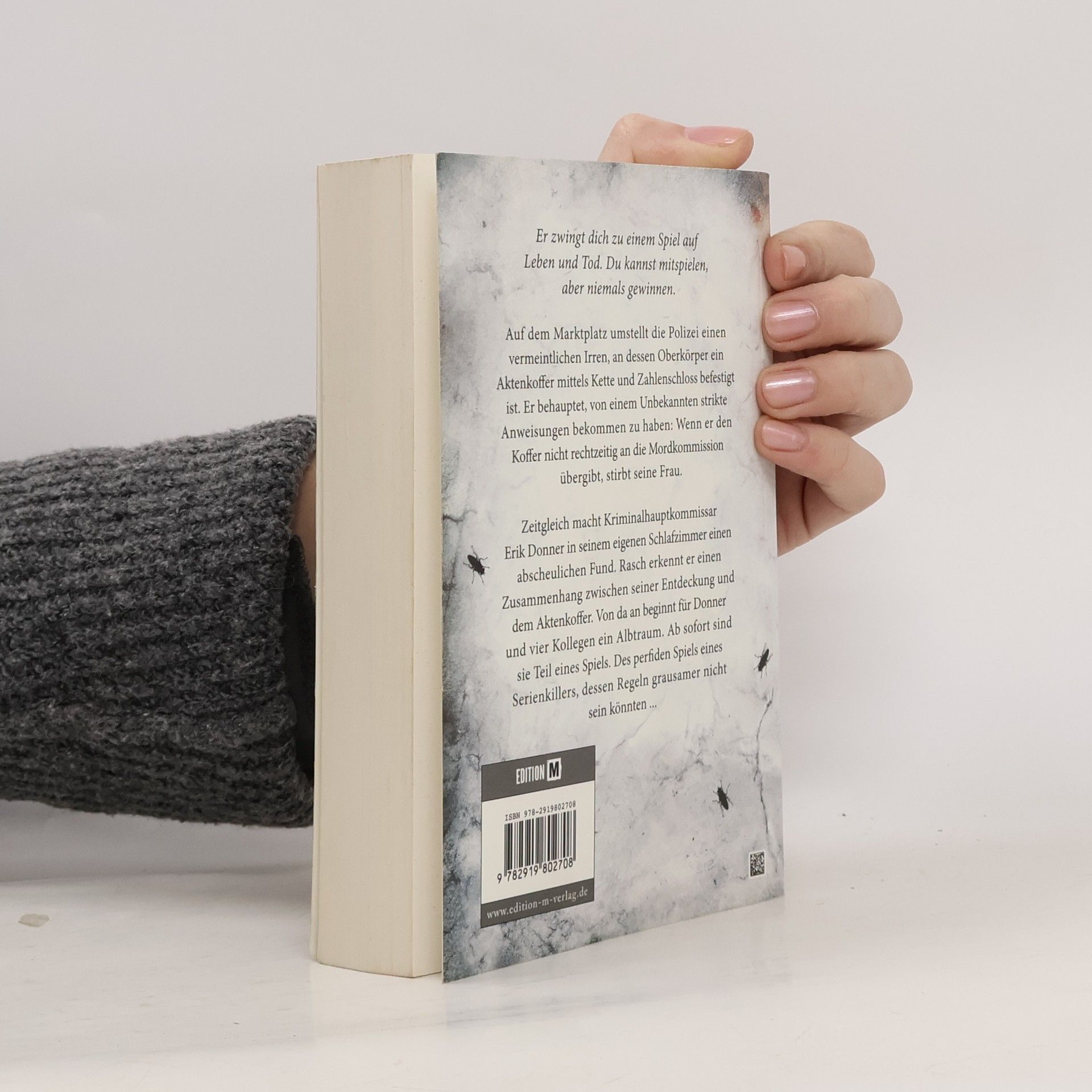 Der neue Thriller des Kindle-Bestsellerautors Elias Haller. Er zwingt dich zu einem Spiel auf Leben und Tod. Du kannst mitspielen, aber niemals gewinnen. Auf dem Marktplatz umstellt die Polizei einen vermeintlichen Irren, an dessen Oberkörper ein Aktenkoffer mittels Kette und Zahlenschloss befestigt ist. Er behauptet, von einem Unbekannten strikte Anweisungen bekommen zu haben: Wenn er den Koffer nicht rechtzeitig an die Mordkommission übergibt, stirbt seine Frau. Zeitgleich macht Kriminalhauptkommissar Erik Donner in seinem eigenen Schlafzimmer einen abscheulichen Fund. Rasch erkennt er einen Zusammenhang zwischen seiner Entdeckung und dem Aktenkoffer. Von da an beginnt für Donner und vier Kollegen ein Albtraum. Ab sofort sind sie Teil eines Spiels. Des perfiden Spiels eines Serienkillers, dessen Regeln grausamer nicht sein könnten ...