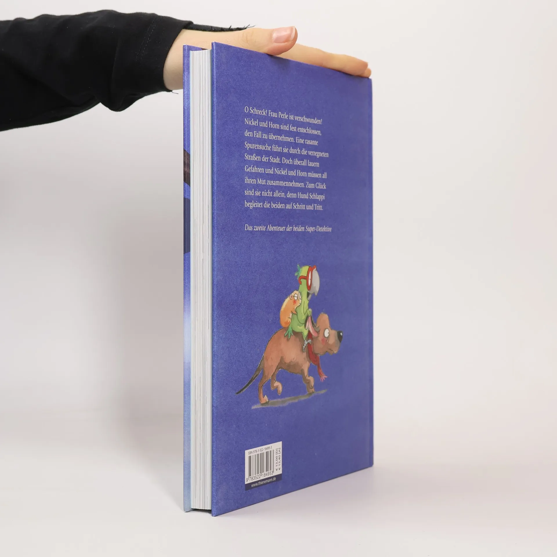 Das zweite Abenteuer von Nickel und Horn, humorvolles Kinderbuch ab 6 Jahren. O Schreck! Frau Perle ist verschwunden! Nickel und Horn sind fest entschlossen, den Fall zu übernehmen – auch Schlappi will bei der Suche nach seiner geliebten Frau Perle nicht fehlen. Eine rasante Spurensuche führt sie durch die verregneten Straßen der Stadt. Sie erkunden die Umgebung und befragen Zeugen: Bindi, den Wellensittich aus dem Asiamarkt, die eingebildete Yorkshire-Terrier-Dame Lazy, die aus dem Zoo geflüchteten Mandarin-Enten, die Frau Perle von früher kennen. Doch überall lauern Gefahren und Nickel und Horn müssen mal wieder all ihren Mut zusammennehmen, um es mit ihnen aufzunehmen. Zum Glück finden sie Frau Perle: Mitten im verschneiten Stadtpark.