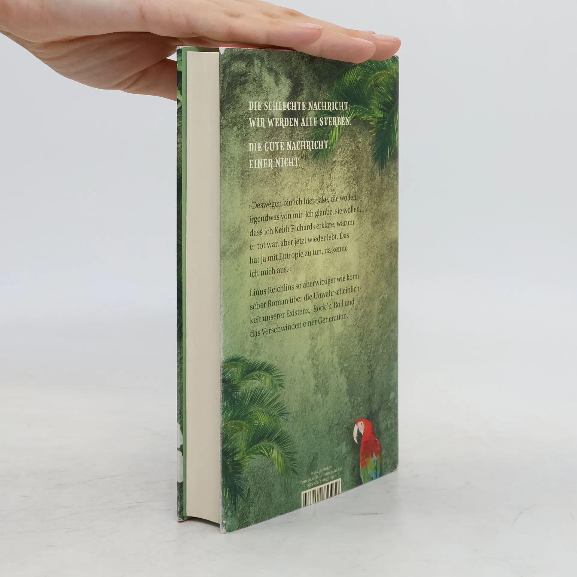 Die schlechte Nachricht: Wir werden alle sterben. Die gute Nachricht: Einer nicht. Über die Unwahrscheinlichkeit unserer Existenz, die heilende Wirkung von Whiskey und die Frage, warum Keith Richards uns immer so weit voraus ist – Linus Reichlins Roman rettet seinen Lesern mehr als nur den Tag! Fred Hundt, Spezialist für Wahrscheinlichkeitstheorie, ist gerade dabei, Fünftklässlern anhand von Spiegeleiern die Relativität von Zeit und Raum zu erklären, als sein alter Freund Ben Harper anruft. Die beiden haben sich einst bei einem risikoreichen Single-Urlaub in der Karibik kennengelernt und damals geschworen, in Krisensituationen stets einander beizustehen. Offenbar steckt Ben, der als Arzt für Prominente in Kalifornien eigentlich nichts zu klagen hat, gerade mitten in einer fetten Krise. Jedenfalls will er, dass Fred sich SOFORT in den Flieger zu ihm nach L. A. setzt. Fred seinerseits kommt das allerdings nicht unrecht. Er kann Ablenkung gut gebrauchen, denn seine Stimmung ist miserabel: Sein Lieblingsmusiker Keith Richards ist gerade gestorben. Eine einschneidende Sache; das Ableben seines größten Rockidols markiert für Fred, dass das große Verschwinden jetzt beginnt. Ab jetzt kann es praktisch jeden treffen, auch ihn. Die Reise zu Ben wird sich jedoch als Glücksfall erweisen. Denn nicht nur werden Freds Fachkenntnisse für außergewöhnliche physikalische Phänomene herausgefordert, nein, es wird so weit gehen, dass er mit Keith Richards höchstpersönlich auf einer einsamen Insel landet, und mit praktischen Problemen konfrontiert wird, von denen er nie zu träumen wagte. „Ich bin ja mehr der Beatles-Typ, aber mit einer schweren Schwäche für die Stones. In Linus Reichlins Buch sind lauter Sätze, die man auswendig lernen möchte. Es ist grotesk, witzig und klug. Hinterher will man ganz viel Musik hören und dazu Bourbon trinken.“ Frank Goosen