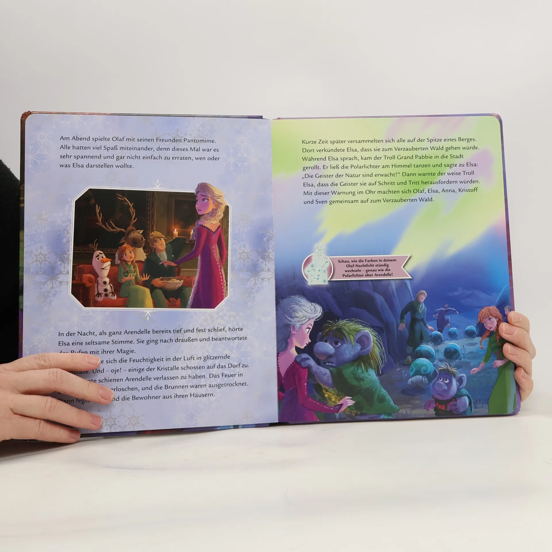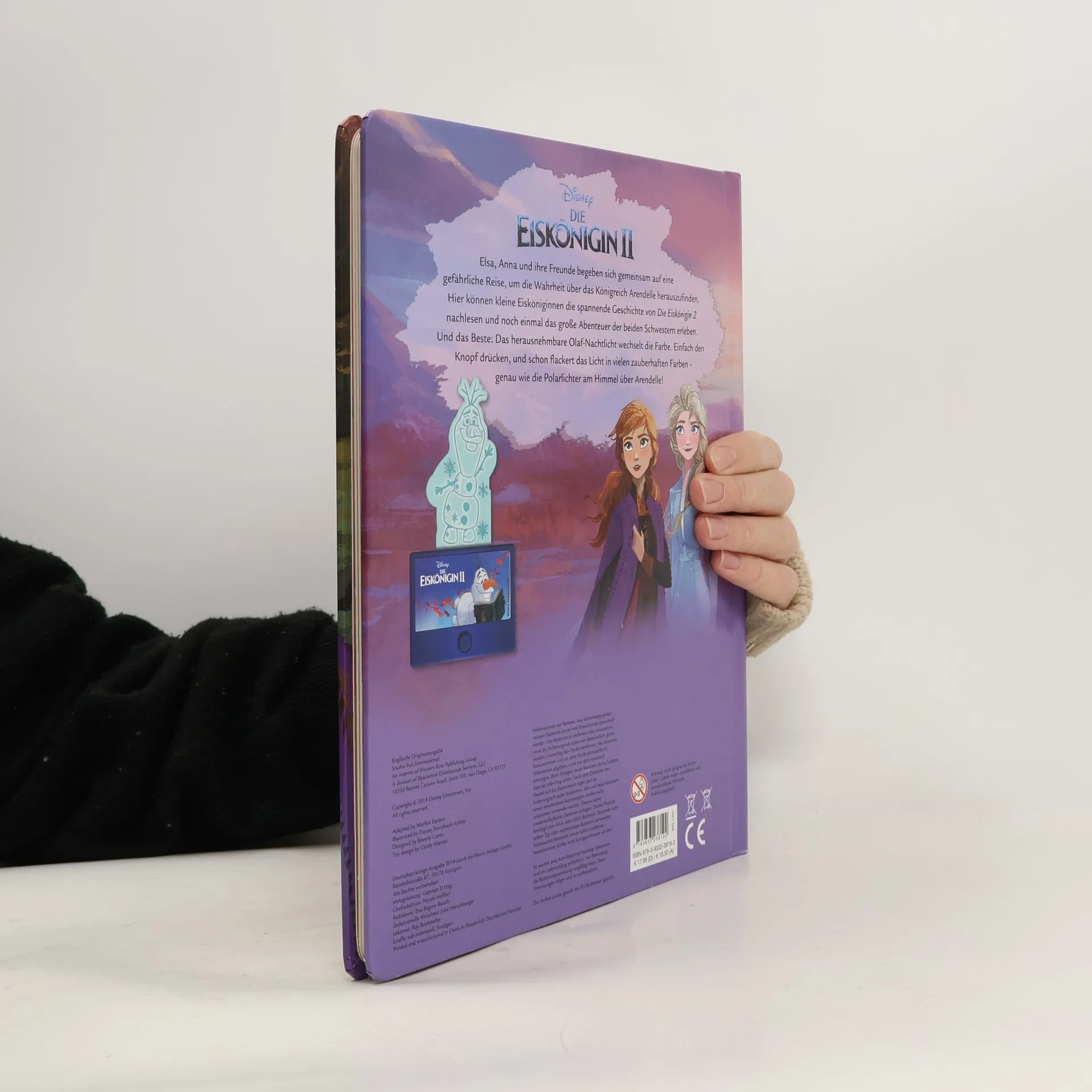 Elsa, Anna und ihre Freunde begeben sich gemeinsam auf eine gefährliche Reise, um die Wahrheit über das Königreich Arendelle herauszufinden. Hier können kleine Eisköniginnen die spannende Geschichte von Die Eiskönigin 2 nachlesen und noch einmal das große Abenteuer der beiden Schwestern erleben. Und das Beste: Das herausnehmbare Olaf-Nachtlicht wechselt die Farbe. Einfach den Knopf drücken, und schon flackert das Licht in vielen zauberhaften Farben, genau wie die Polarlichter am Himmel über Arendelle! Es werden zwei AAA-Batterien benötigt für das Nachtlicht. Batterien sind im Lieferumfang enthalten.