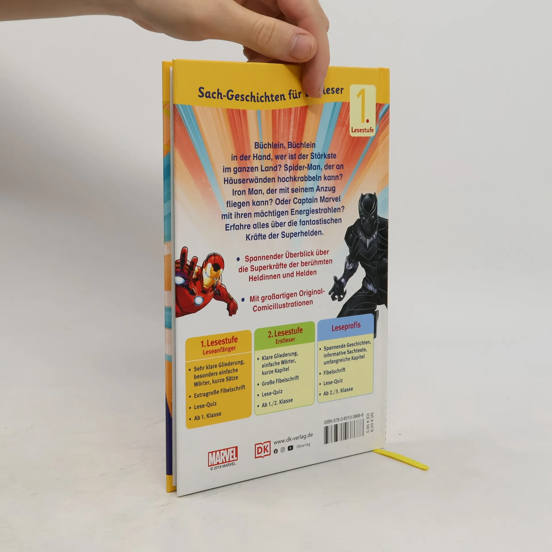 Einfach fantastisch! Lesen lernen mit den MARVEL Superhelden. In diesem spektakulären SUPERLESER!-Erstlesebuch erwartet Leseanfänger die geballte Ladung Superkräfte der MARVEL Avengers Helden – von Thors Hammer bis zu den Zauberkräften von Scarlet Witch. Die 48-seitige Sachgeschichte mit Quiz und Lesebändchen eignet sich perfekt zur Leseförderung. Mit einfachem Wortschatz, kurzen Absätzen, klarer Gliederung, extragroßer Fibelschrift, Original-Comic-Illustrationen und Sachseiten mit jeder Menge spannendem Hintergrundwissen macht Lesen üben Spaß! Cooles MARVEL Buch zur Leseförderung ab der 1. Klasse (1. Lesestufe). Gänsehaut von der ersten bis zur letzten Seite! Dieses superheldenstarke Erstlesebuch fesselt Leseanfänger mit spannenden Superheldengeschichten und verblüffenden Fakten zu den Kräften der beliebtesten MARVEL Helden wie Iron Man, Thor, Black Panther, Captain America, Captain Marvel, Hulk, Ant-Man, Black Widow und Spider-Man. Dabei geht dieses außergewöhnliche Buch zur Leseförderung folgenden Fragen auf den Grund: Was ist das Besondere an Thors Hammer? Wie kann Spider-Man an Häuserwänden hochklettern? Hat Iron Man überhaupt Superkräfte oder sind all seine Kräfte gebaut? Kann Scarlet Witch richtig zaubern? Genauso stark wie die Superhelden ist der Erfolg der MARVEL Superheldenfilme. Dieses Erstlesebuch stellt die berühmten Helden vor und lässt Leseanfänger das imposante MARVEL Universum hautnah erleben. 1. Lesestufe für Leseanfänger: • Ab der 1. Klasse. • Sehr klare Gliederung, besonders einfache Wörter, kurze Sätze. • Extragroße Fibelschrift. Die schlauen Erstlesebücher der SUPERLESER!-Reihe: • Kombination aus Sach- und erzählendem Buch. • Altersgerechte Leseförderung. • Unterschiedliche Lesestufen. • Kniffliges Quiz. • Besondere Extras. • Wissenswertes für Eltern. • Praktisches Lesebändchen. Aufgepasst, liebe Bücherwürmer: Mit den SUPERLESER-Erstlesebüchern macht Lesen lernen riesigen Spaß! Dieses Buch ist bei Antolin. de verfügbar.