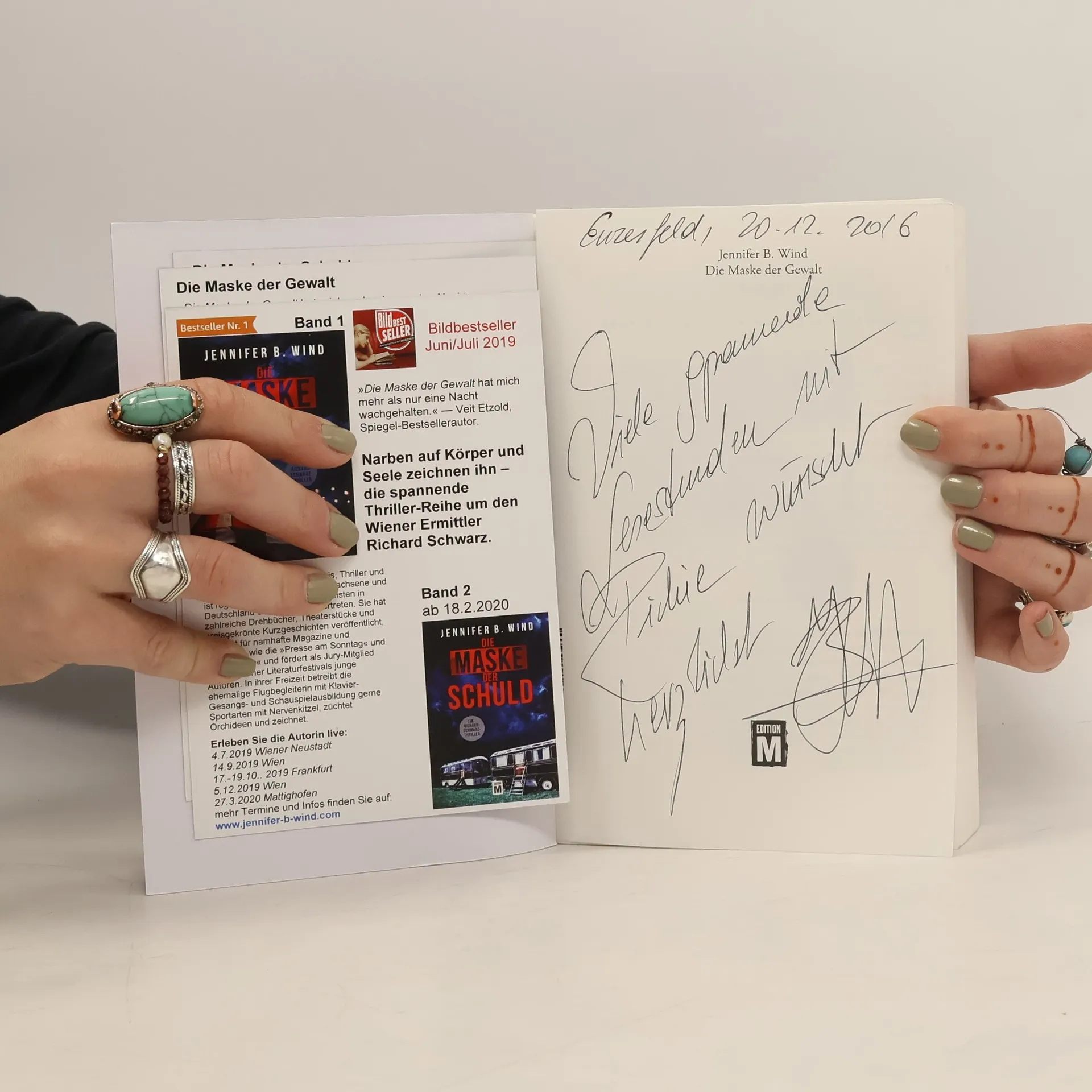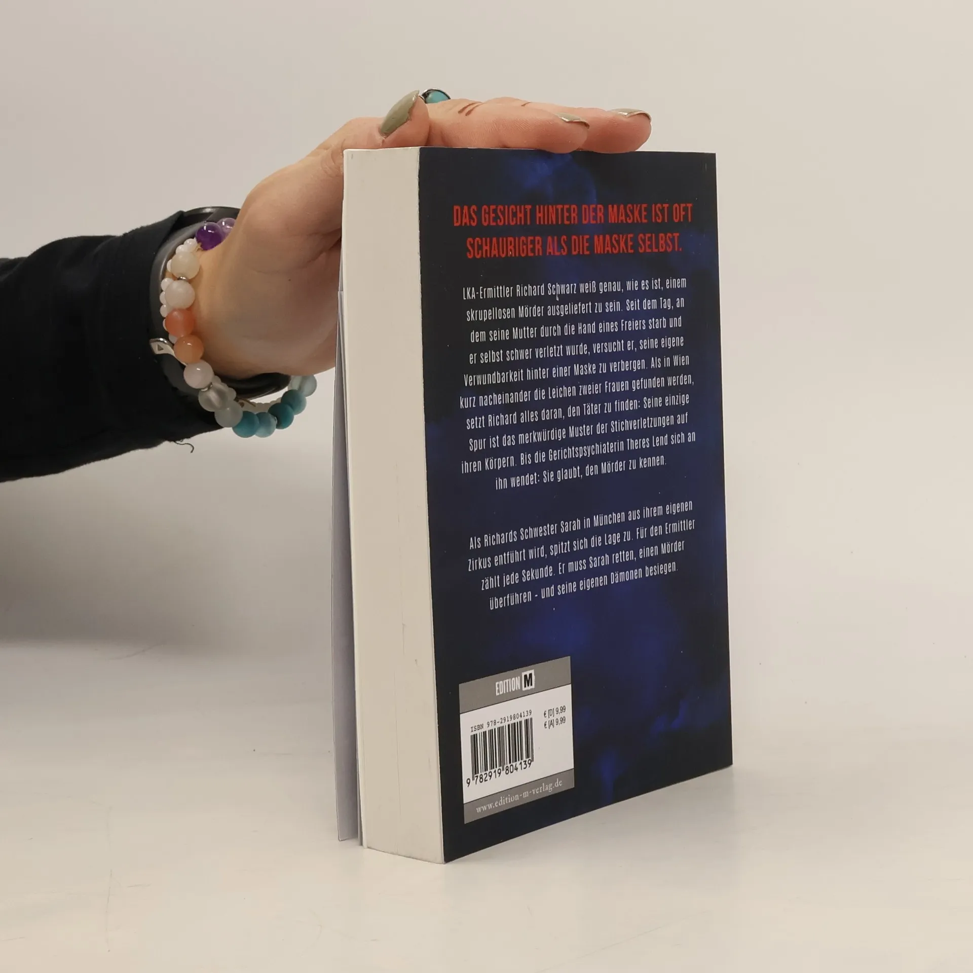 Narben auf Körper und Seele zeichnen ihn – der Auftakt zu der spannenden Thriller-Reihe um den Wiener Ermittler Richard Schwarz. Das Gesicht hinter der Maske ist oft schauriger als die Maske selbst. LKA-Ermittler Richard Schwarz weiß genau, wie es ist, einem skrupellosen Mörder ausgeliefert zu sein. Seit dem Tag, an dem seine Mutter durch die Hand eines Freiers starb und er selbst schwer verletzt wurde, versucht er, seine eigene Verwundbarkeit hinter einer Maske zu verbergen. Als in Wien kurz nacheinander die Leichen zweier Frauen gefunden werden, setzt Richard alles daran, den Täter zu finden: Seine einzige Spur ist das merkwürdige Muster der Stichverletzungen auf ihren Körpern. Bis die Gerichtspsychiaterin Theres Lend sich an ihn wendet: Sie glaubt, den Mörder zu kennen. Als Richards Schwester Sarah in München aus ihrem eigenen Zirkus entführt wird, spitzt sich die Lage zu. Für Richie zählt jede Sekunde. Er muss Sarah retten, einen Mörder überführen – und seine eigenen Dämonen besiegen. „Die Maske der Gewalt hat mich von der ersten Seite an gefesselt. Die rasante Handlung, der packende Fall und vor allem die persönliche Geschichte des undurchsichtigen, aber charismatischen Ermittlers haben mich mehr als nur eine Nacht wachgehalten.“ Veit Etzold, Spiegel-Bestsellerautor