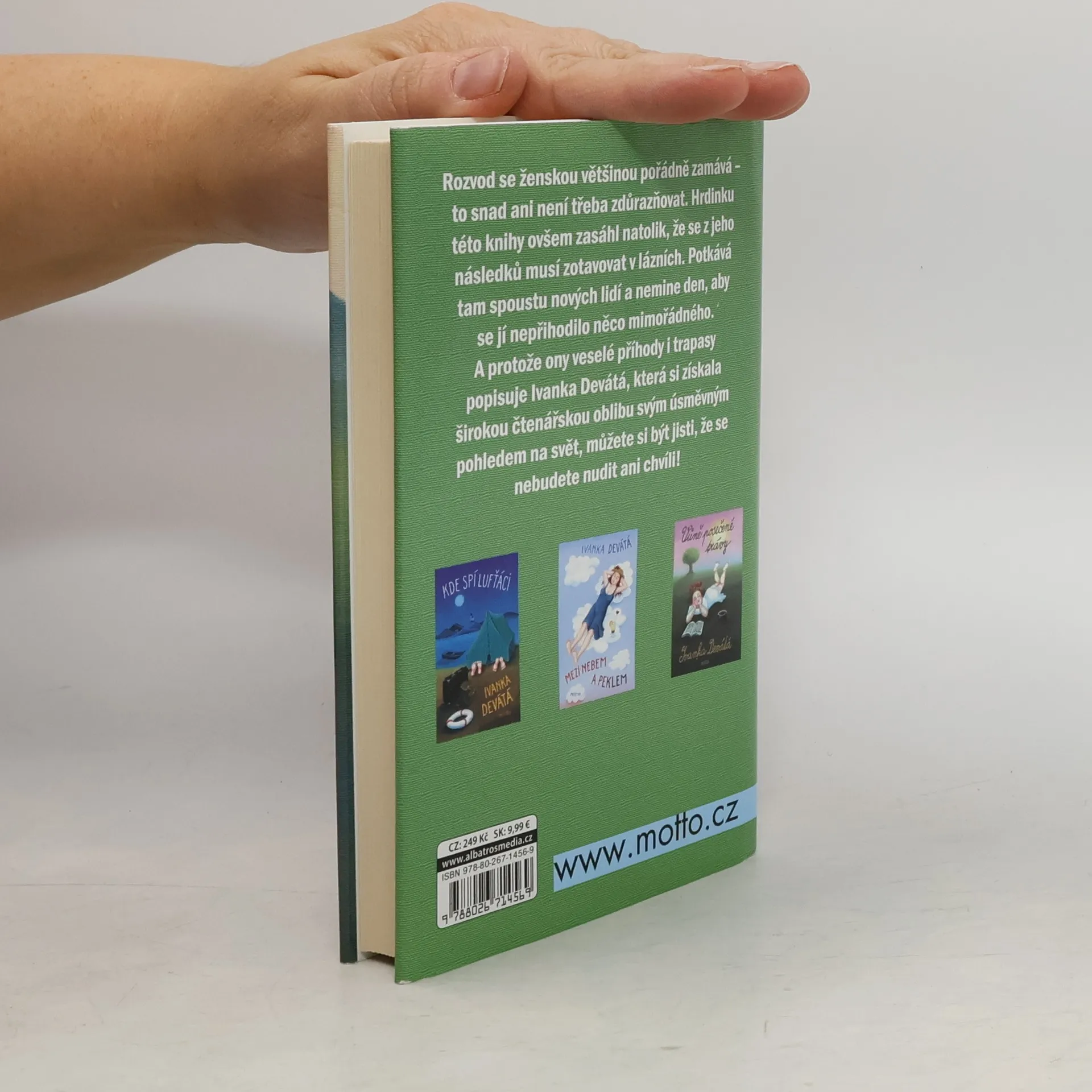 Rozvod se ženskou většinou pořádně zamává. Hrdinku této knihy ovšem zasáhl natolik, že se z jeho důsledků musí zotavovat v lázních. Potkává tam spoustu nových lidí a nemine den, aby se jí nepřihodilo něco mimořádného. A protože ony veselé příhody i trapasy popisuje Ivanka Devátá, která si získala širokou čtenářskou oblibu svým úsměvným pohledem na svět, můžete si být jisti, že se nebudete nudit ani chvíli.