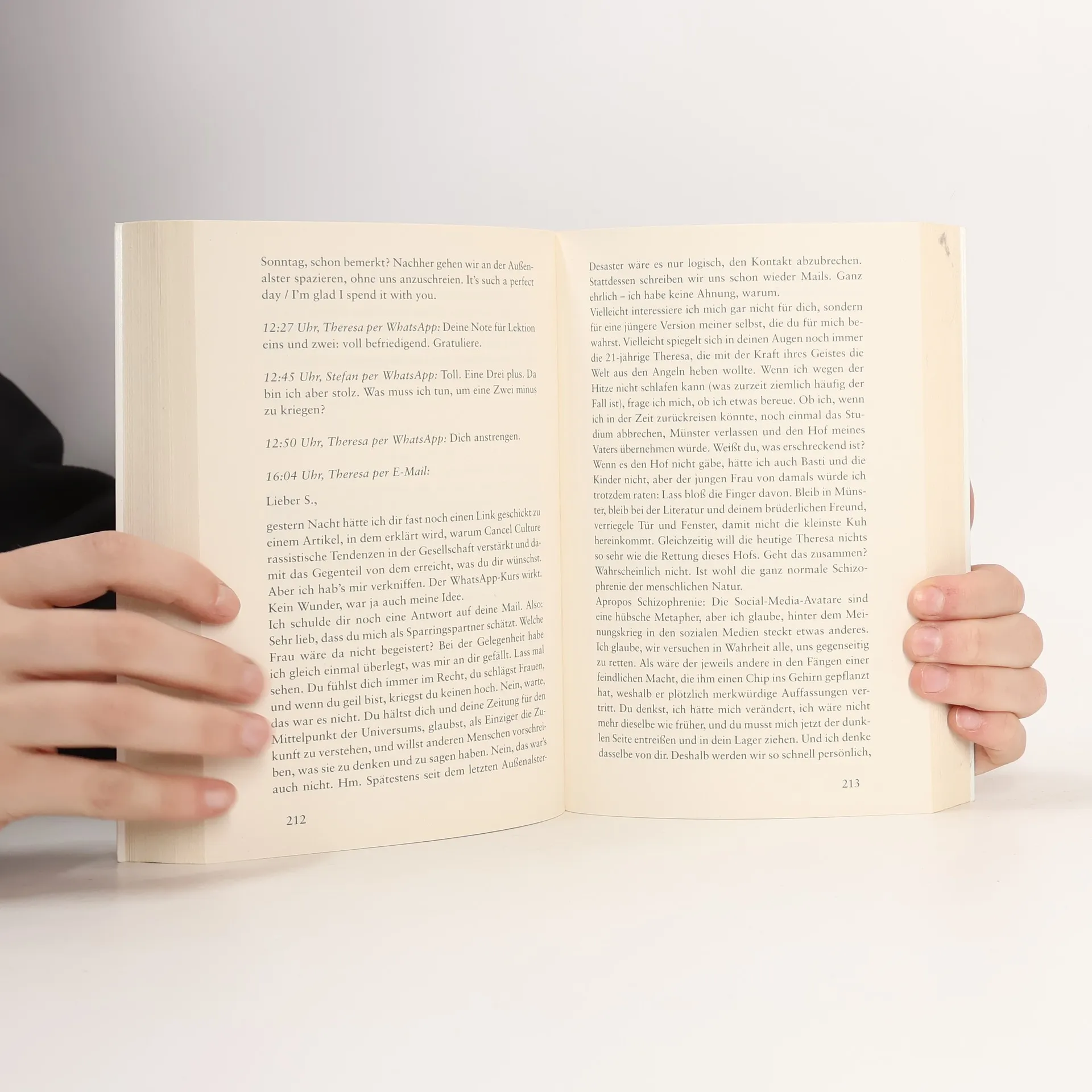 Zwanzig Jahre sind vergangen: Als sich Stefan und Theresa zufällig in Hamburg über den Weg laufen, endet ihr erstes Wiedersehen in einem Desaster. Zu Studienzeiten waren sie wie eine Familie füreinander, heute sind kaum noch Gemeinsamkeiten übrig. Stefan hat Karriere bei Deutschlands größter Wochenzeitung DER BOTE gemacht, Theresa den Bauernhof ihres Vaters in Brandenburg übernommen. Aus den unterschiedlichen Lebensentwürfen sind gegensätzliche Haltungen geworden. Stefan versucht bei seiner Zeitung, durch engagierte journalistische Projekte den Klimawandel zu bekämpfen. Theresa steht mit ihrem Bio-Milchhof vor Herausforderungen, die sie an den Rand ihrer Kraft bringen. Die beiden beschließen, noch einmal von vorne anzufangen, sich per E-Mail und WhatsApp gegenseitig aus ihren Welten zu erzählen. Doch während sie einander näherkommen, geraten sie immer wieder in einen hitzigen Schlagabtausch um polarisierende Fragen wie Klimapolitik, Gendersprache und Rassismusvorwürfe. Ist heute wirklich jeder und jede gezwungen, eine Seite zu wählen? Oder gibt es noch Gemeinsamkeiten zwischen den Welten? Und können Freundschaft und Liebe die Kluft überbrücken?