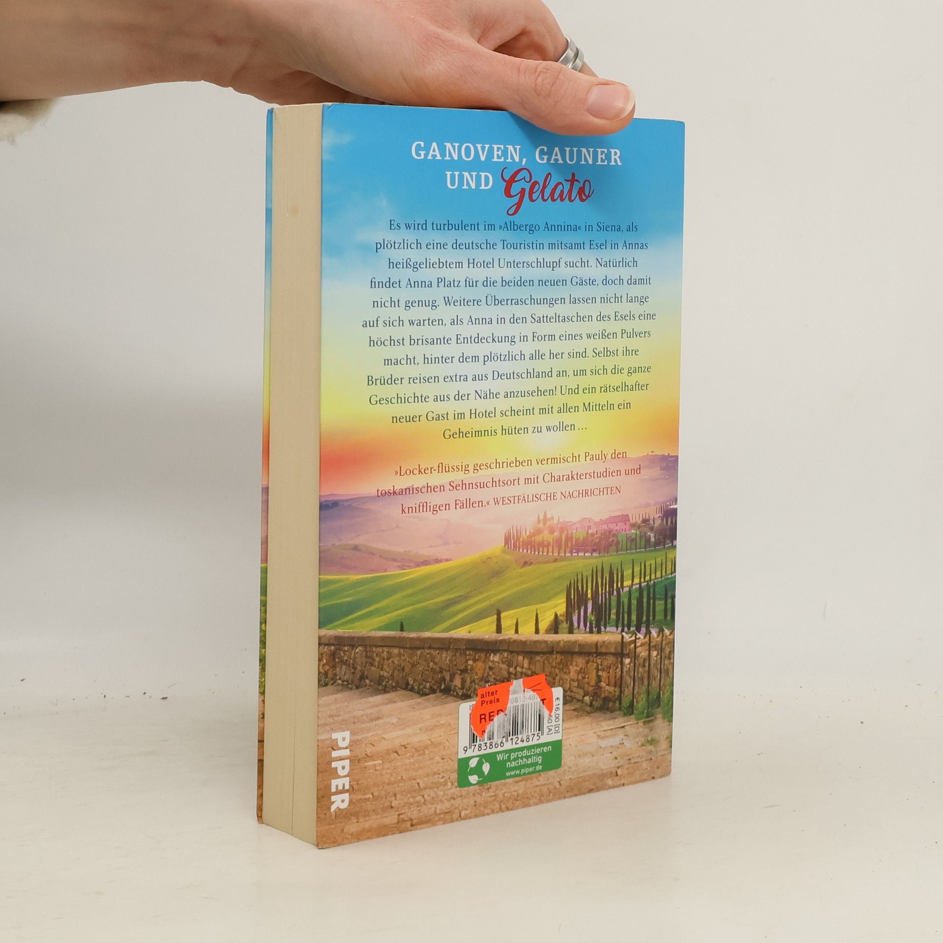 Statt Vollpension in der Toskana wartet ein tierisches Abenteuer! Der neue heitere Toskana-Krimi von Spiegel-Bestsellerautorin Gisa Pauly Es wird turbulent im »Albergo Annina« in Siena, als plötzlich eine deutsche Touristin mitsamt Esel in Annas heißgeliebtem Hotel Unterschlupf sucht. Natürlich findet Anna Platz für die beiden neuen Gäste, doch damit nicht genug. Weitere Überraschungen lassen nicht lange auf sich warten, als Anna in den Satteltaschen des Esels eine höchst brisante Entdeckung in Form eines weißen Pulvers macht, hinter dem plötzlich alle her sind. Selbst ihre Brüder reisen extra aus Deutschland an, um sich die ganze Geschichte aus der Nähe anzusehen! Und ein rätselhafter neuer Gast im Hotel scheint mit allen Mitteln ein Geheimnis hüten zu wollen … Jede Menge Aufregung für Anna! Band 3 der Siena-Reihe von Bestsellerautorin Gisa Pauly. »Eine herrlichst schräge und amüsante Komödie von Gisa Pauly, der Unterhaltungsqueen unter den deutschen Autorinnen« literaturmarkt. info über »Jeder lügt, so gut er kann« Gisa Pauly lebt als freie Schriftstellerin, Journalistin und Drehbuchautorin in Münster, ihre Ferien verbringt sie am liebsten auf Sylt oder in Italien. Ihre turbulenten Sylt-Krimis um die temperamentvolle Mamma Carlotta erobern ebenso regelmäßig die SPIEGEL-Bestsellerliste wie ihre Italien-Romane. Die Leser der Fernsehzeitschrift rtv wählten sie zur beliebtesten Autorin des Jahres 2018.