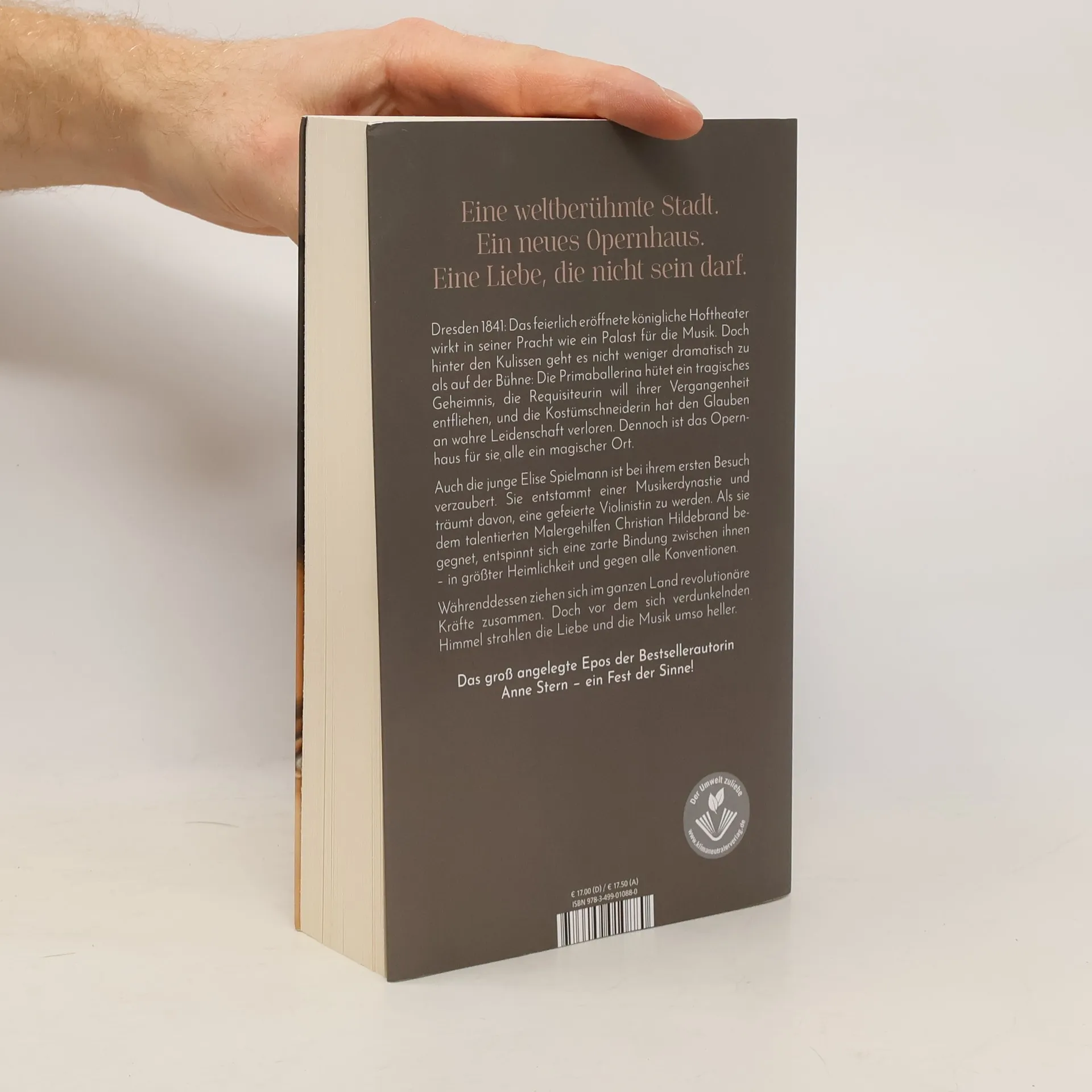 Eine weltberühmte Stadt. Ein neues Opernhaus. Eine Liebe, die nicht sein darf. Und der Klang unsterblicher Musik. Dresden 1841: Das feierlich eröffnete königliche Hoftheater wirkt in seiner Pracht wie ein Palast für die Musik. Doch hinter den Kulissen geht es nicht weniger dramatisch zu als auf der Bühne: Die Primaballerina hütet ein tragisches Geheimnis, die Requisiteurin will ihrer Vergangenheit entfliehen, und die Kostümschneiderin hat den Glauben an wahre Leidenschaft verloren. Dennoch ist das Opernhaus für sie alle ein magischer Ort. Auch die junge Elise Spielmann ist bei ihrem ersten Besuch verzaubert. Sie entstammt einer Musikerdynastie und träumt davon, eine gefeierte Violinistin zu werden. Als sie dem talentierten Malergehilfen Christian Hildebrand begegnet, entspinnt sich eine zarte Bindung zwischen ihnen – in größter Heimlichkeit und gegen alle Konventionen. Währenddessen ziehen sich im ganzen Land revolutionäre Kräfte zusammen. Doch vor dem sich verdunkelnden Himmel strahlen die Liebe und die Musik umso heller. Das groß angelegte Epos der Bestsellerautorin Anne Stern zur wechselvollen Geschichte der Semperoper: berührende Schicksale vor und hinter den Kulissen, ein Fest der Sinne.