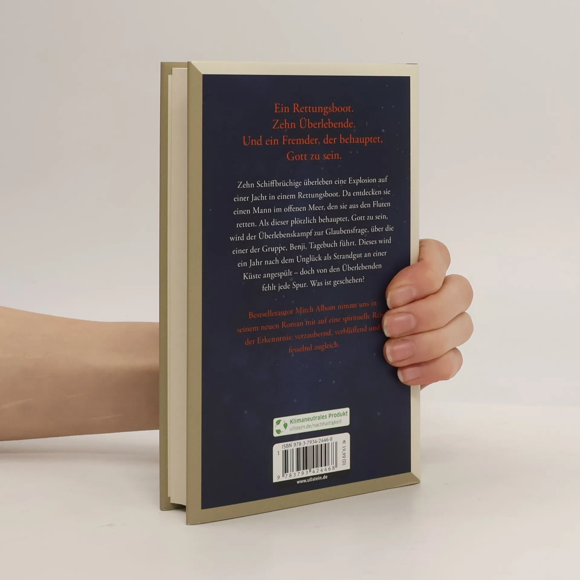 Eine außergewöhnliche Geschichte, so spannend erzählt wie ein Krimi: Zehn Schiffsbrüchige überleben eine Explosion auf einer Yacht in einem Rettungsboot. Da entdecken sie einen Mann im offenen Meer, den sie aus den Fluten retten. Als dieser plötzlich behauptet, Gott zu sein, wird der Überlebenskampf zur Glaubensfrage, über die einer der Gruppe, Benji, Tagebuch führt. Dieses wird ein Jahr nach dem Unglück als Strandgut an einer Küste angespült - doch von den Überlebenden fehlt jede Spur. Was ist geschehen? In der Tradition seiner erfolgreichsten Bücher Wer im Himmel auf dich wartet und Die fünf Menschen, die dir im Himmel begegnen nimmt Mitch Albom in diesem Roman seine Leserschaft mit auf eine Reise der Erkenntnis: verzaubernd, verblüffend und fesselnd zugleich.