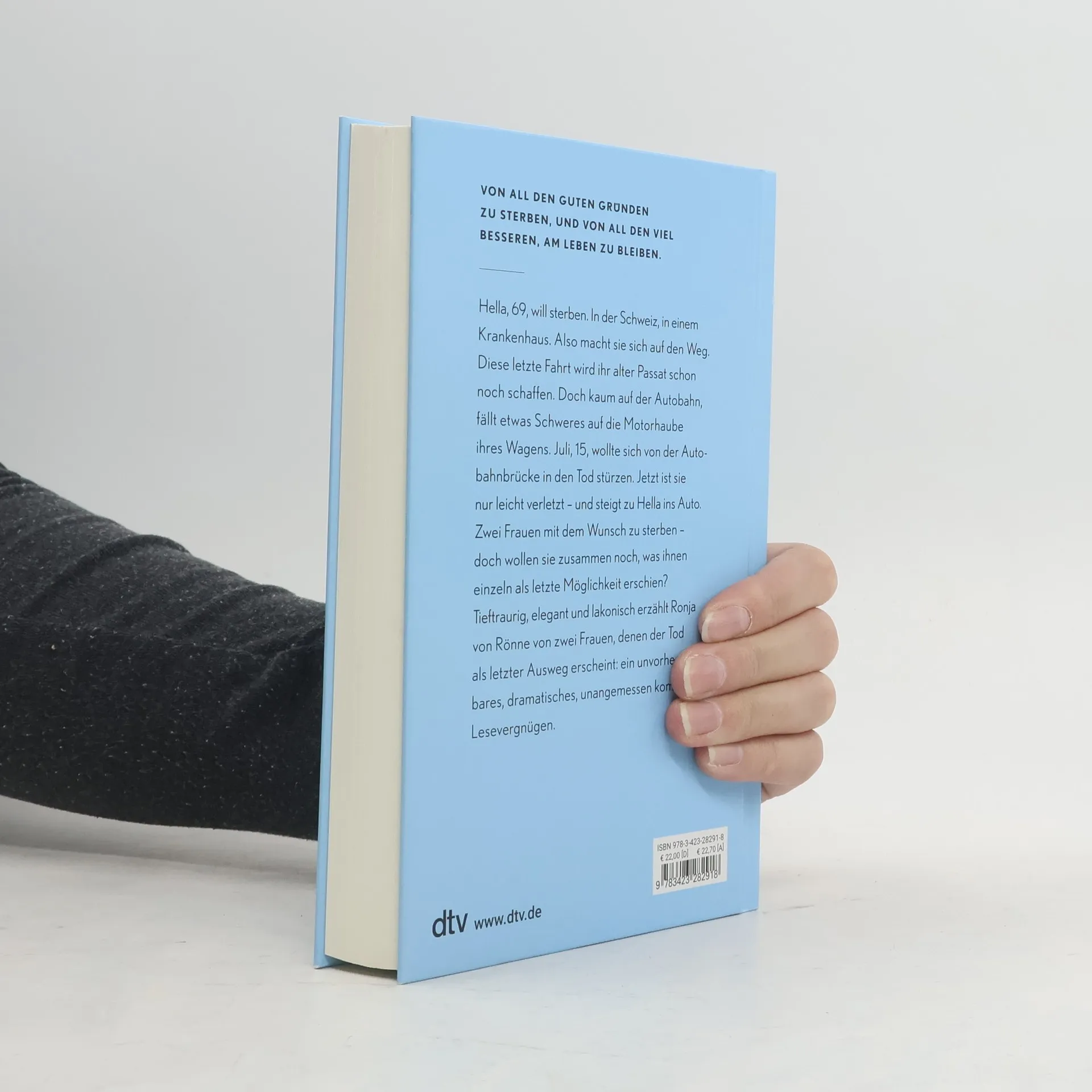 »Von all den guten Gründen zu sterben, und von all den viel besseren, am Leben zu bleiben.« Hella, 69, will sterben. In der Schweiz, in einem Krankenhaus. Also macht sie sich auf den Weg. Diese letzte Fahrt wird ihr alter Passat schon noch schaffen. Doch kaum auf der Autobahn, fällt etwas Schweres vor ihr auf die Straße. Juli, 15, wollte sich von der Autobahnbrücke in den Tod stürzen. Jetzt ist sie nur leicht verletzt – und steigt zu Hella in den Wagen. Zwei Frauen mit dem Wunsch zu sterben – doch wollen sie zusammen noch, was ihnen einzeln als letzte Möglichkeit erschien? Tieftraurig, elegant und lakonisch erzählt Ronja von Rönne von zwei Frauen, denen der Tod als letzter Ausweg erscheint: ein unvorhersehbares, dramatisches, unangemessen komisches Lesevergnügen. »Wenn Ronja von Rönne mal wieder sterben will, ruft sie entweder mich an – oder schreibt ein großartiges Buch. Jetzt habe ich schon länger nichts von ihr gehört.« Benjamin von Stuckrad-Barre »Das wollte ich doch sagen, Benjamin!« Martin Suter