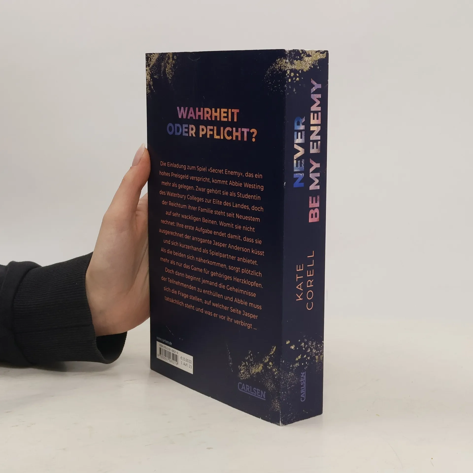 »Zwei Dinge musst du über Jasper wissen: Versuch nicht, ihn zu verstehen. Und mach ihn dir nie zum Feind.« Fünfundzwanzigtausend Dollar! Die Regeln des College-Spiels »Secret Enemy« sind hart, aber für Waterbury-Studentin Abbie Westing die einzige Chance, schnell an Geld zu gelangen. Kurz entschlossen meldet sie sich an, bereit, aus ihrer Komfortzone auszubrechen: Bye-bye langweilige Abbie, hello Action-Abbie! Doch ihre größte Herausforderung steht noch bevor – ausgerechnet Jasper Anderson wird ihr Partner in Crime. Er ist überheblich, stinkreich, undurchschaubar und seinen Gegnern stets einen Schritt voraus. Bei ihrer ersten Aufgabe küssen sie sich, was beide in einen unerwarteten Sog zieht. Abbie erkennt schnell, was es bedeutet, sich auf Jasper einzulassen: Es gibt kein Sicherheitsnetz, denn wenn sie abstürzen, dann zusammen. Diese Opposites attract College Romance bietet eine Slow Burn-Liebesgeschichte mit Bad Boy Vibes. Sie kann als Standalone gelesen werden, doch für ein besseres Verständnis der Charakterentwicklungen empfiehlt sich das Lesen aller Bände. »Never be my enemy« ist als edel gestaltete Farbschnitt-Ausgabe erhältlich – nur solange der Vorrat reicht! Dies ist der zweite Band der fesselnden College Romance-Reihe.