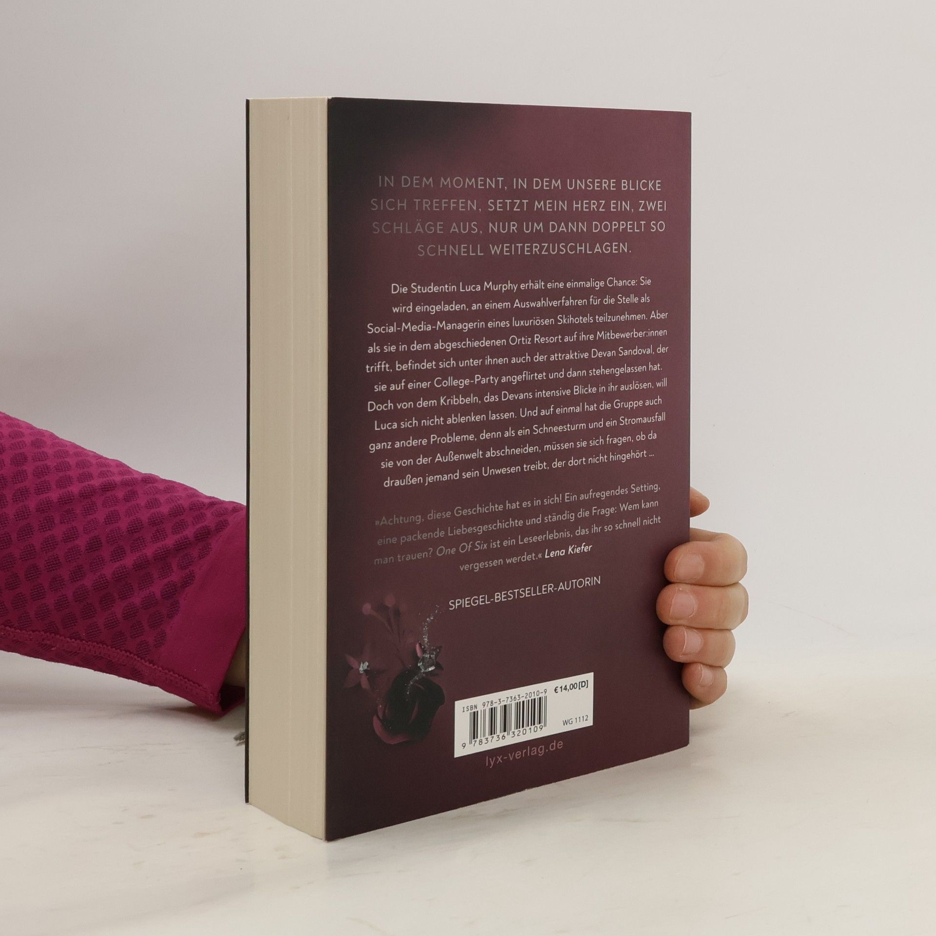 In dem Moment, in dem unsere Blicke sich treffen, setzt mein Herz ein, zwei Schläge aus, nur um dann doppelt so schnell weiterzuschlagen. Die Studentin Luca Murphy erhält eine einmalige Chance: Sie wird eingeladen, an einem Auswahlverfahren für die Stelle als Social-Media-Managerin eines luxuriösen Skihotels teilzunehmen. Aber als sie in dem abgeschiedenen Ortiz Resort auf ihre Mitbewerber: innen trifft, befindet sich unter ihnen auch der attraktive Devan Sandoval, der sie auf einer College-Party angeflirtet und dann stehengelassen hat. Doch von dem Kribbeln, das Devans intensive Blicke in ihr auslösen, will Luca sich nicht ablenken lassen. Und auf einmal hat die Gruppe auch ganz andere Probleme, denn als ein Schneesturm und ein Stromausfall sie von der Außenwelt abschneiden, müssen sie sich fragen, ob da draußen jemand sein Unwesen treibt, der dort nicht hingehört ... »Achtung, diese Geschichte hat es in sich! Ein aufregendes Setting, eine packende Liebesgeschichte und ständig die Frage: Wem kann man trauen? ONE OF SIX ist ein Leseerlebnis, das ihr so schnell nicht vergessen werdet.« LENA KIEFER Erster Band der ONE OF SIX Reihe von SPIEGEL -Bestseller-Autorin Kim Nina Ocker