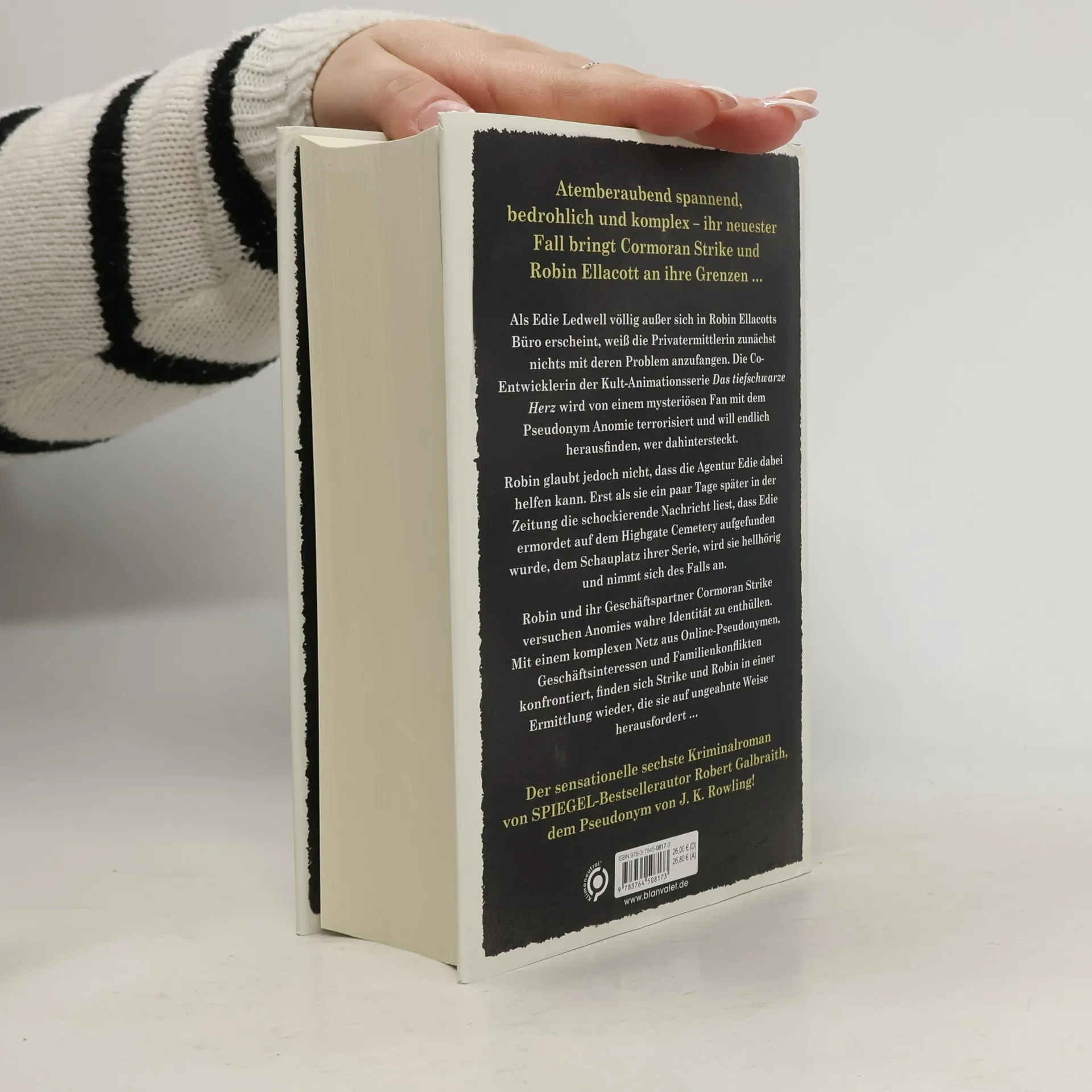 Als Edie Ledwell, verwirrt und völlig außer sich, in Robin Ellacotts Büro erscheint und mit ihr sprechen möchte, weiß die Privatermittlerin zunächst nichts mit deren Problem anzufangen. Die Co-Entwicklerin der Kult-Animationsserie Das tiefschwarze Herz wird von einem mysteriösen Fan mit dem Pseudonym Anomie terrorisiert. Edie ist verzweifelt und will endlich herausfinden, wer dahintersteckt. Robin glaubt nicht, dass die Detektei Edie dabei helfen kann und schickt sie weg. Erst als sie ein paar Tage später in der Zeitung die schockierende Nachricht liest, dass Edie ermordet auf dem Highgate Cemetery aufgefunden wurde, dem Schauplatz von Das tiefschwarze Herz , wird sie hellhörig und nimmt sich des Falls an. Robin und ihr Geschäftspartner Cormoran Strike versuchen Anomies wahre Identität zu enthüllen. Mit einem komplexen Netz aus Online-Pseudonymen, Geschäftsinteressen und Familienkonflikten konfrontiert, finden sich Strike und Robin in einer Ermittlung wieder, die sie auf ungeahnte Weise herausfordert und einer unvermuteten Bedrohung aussetzt … »Mit Cormoran Strike und Robin Ellacott hat Galbraith/Rowling ein ungemein schillerndes und vielschichtiges Ermittlerduo kreiert. Die Dialoge der beiden sind pointiert, ohne bemüht witzig zu sein, die Charaktere stimmig entwickelt.« Hamburger Abendblatt Außerdem aus der Cormoran-Strike-Reihe lieferbar: Der Ruf des Kuckucks Der Seidenspinner Die Ernte des Bösen Weißer Tod Böses Blut